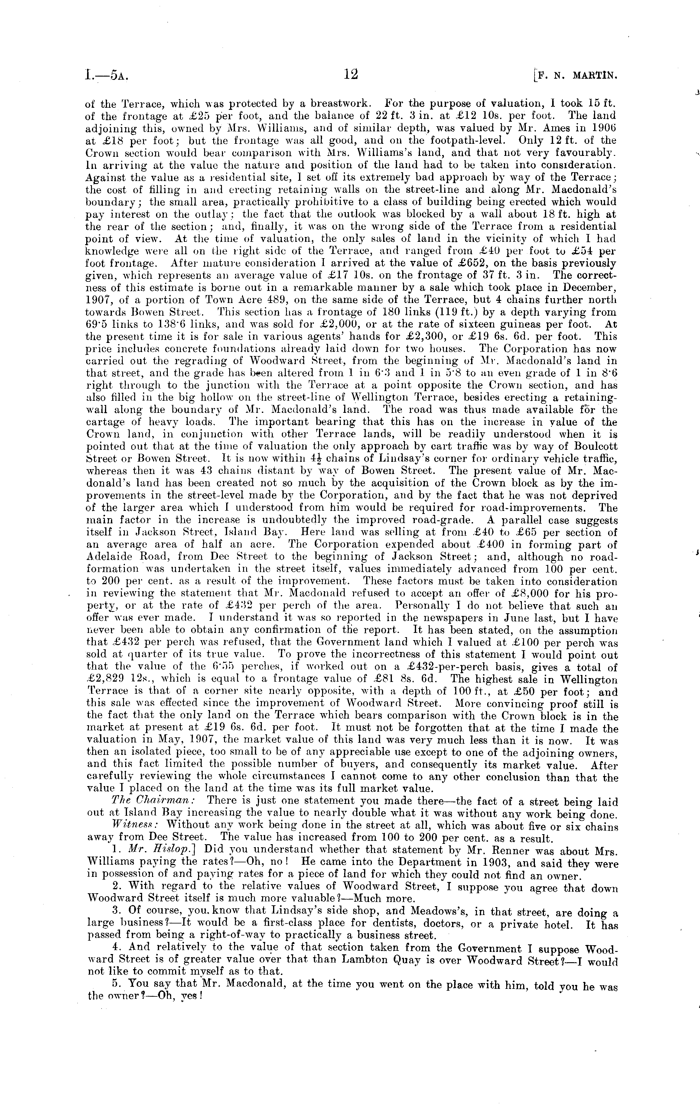 of the Terrace, which was protected by a breastwork. For the purpose of valuation, 1 took 15 ft. of the frontage at .£25 per foot, and the balance of 22 ft. 3 in. at .£l2 10s. per foot. The land adjoining this, owned by Mrs. Williams, and of similar depth, was valued by Mr. Ames in 1900 at £18 per foot; but the frontage was all good, and on the footpath-level. Only 12ft. of the Crown section would bear comparison with Airs. Williams's land, and that not very favourably. In arriving at the value the nature and position of the land had to be taken into consideration. Against the value as a residential site, I set off its extremely bad approach by way of the Terrace; the cost of filling in and erecting retaining walls on the street-line and along Mr. Macdonald's boundary; the small area, practically prohibitive to a class of building being erected which would pay interest on the outlay: the fact that the outlook was blocked by a wall about 18ft. high at the rear of the section ; and, finally, it was on the wrong side of the Terrace from a residential point of view. At the time of valuation, the only sales of land in the vicinity of which 1 had knowledge were all on I he right side of the Terrace, and ranged from £40 per foot to £54 per foot frontage. Alter mature consideration I arrived at the value of £652, on the basis previously given, which represents an average value of £17 10s. on the frontage of 37 ft. 3 in. The correctness of this estimate is borne out in a remarkable manner by a sale which took place in December, 1907, of a portion of Town Acre 489, on the same side of the Terrace, but 4 chains further north towards Bowen Street. This section has a frontage of 180 links (119 ft.) by a depth varying from 695 links to 1386 links, and was sold for £2,000, or at the rate of sixteen guineas per foot. At the present time it is for sale in various agents' hands for £2,300, or £19 6s. 6d. per foot. This price includes concrete foundations already laid down for two houses. The Corporation has now carried out the regrading of Woodward Street, from the beginning of Mr. Macdonald's land in that street, and the grade has been altered from 1 in (i'-'i and 1 in sB to an even grade of 1 in 8"6 right through to the junction with the Terrace at a point opposite the Crown section, and has also filled in the big hollow on the street-line of Wellington Terrace, besides erecting a retainingwall along the boundary of Mr. Macdonald's land. The road was thus made available for the cartage of heavy loads. The important bearing that this has on the increase in value of the Crown land, in conjunction with other Terrace lands, will be readily understood when it is pointed out that at the time of valuation the only approach b}' cart traffic was by way of Boulcott Street or Bowen Street. It is now within ih chains of Lindsay's corner for ordinary vehicle traffic, whereas then it was 43 chains distant by way of Bowen Street. The present value of Mr. Macdonald's land has been created not so much by the acquisition of the Crown block as by the improvements in the street-level made by the Corporation, and by the fact that he was not deprived of the larger area which i understood from him would be required for road-improvements. The main factor in the increase is undoubtedly the improved road-grade. A parallel case suggests itself in Jackson Street, Island Bay. Here land was soiling at from £40 to £65 per section of an average area of half an acre. The Corporation expended about £400 in forming part of Adelaide Road, from Dee Street to the beginning of Jackson Street; and, although no roadformation was undertaken in the street itself, values immediately advanced from 100 per cent, to 200 pei- cent, as a result of the improvement. These factors must be taken into consideration in reviewing the statement that Mr. Macdonald refused to accept an offer of £8,000 for his property, or at the rate of £432 per perch of the area. Personally I do not believe that such an offer was ever made. I understand it was so reported in the newspapers in June last, but I have never been able to obtain any confirmation of the report. It has been stated, on the assumption that £432 per perch was refused, that the Government land which I valued at £100 per perch was sold at quarter of its true value. To prove the incorrectness of this statement I would point out that the value of the 6"55 perches, if worked out on a £432-per-perch basis, gives a total of £2,829 125., which is equal to a frontage value of .£Bl Bs. 6d. The highest sale in Wellington Terrace is that of a corner site nearly opposite, with a depth of 100 ft., at £50 per foot; and this sale was effected since the improvement of Woodward Street. More convincing proof still is the fact that the only land on the Terrace which bears comparison with the Crown block is in the market at present at £19 6s. 6d. per foot. It must not be forgotten that at the time I made the valuation in May, 1907, the market value of this land was very much less than it is now. It was then an isolated piece, too small to be of any appreciable use except to one of the adjoining owners, and this fact limited the possible number of buyers, and consequently its market value. After carefully reviewing the whole circumstances I cannot come to any other conclusion than that the value I placed on the land at the time was its full market value. The Chairman: There is just one statement you made there —the fact of a street being laid out at Island Bay increasing the value to nearly double what it was without any work being done. Witness: Without any work being done in the street at all, which was about five or six chains away from Dee Street. The value has increased from 100 to 200 per cent, as a result. 1. Mr. Hislop.'] Did you understand whether that statement by Mr. Renner was about Mrs. Williams paying the rates?—Oh, no! He came into the Department in 1903, and said they were in possessi