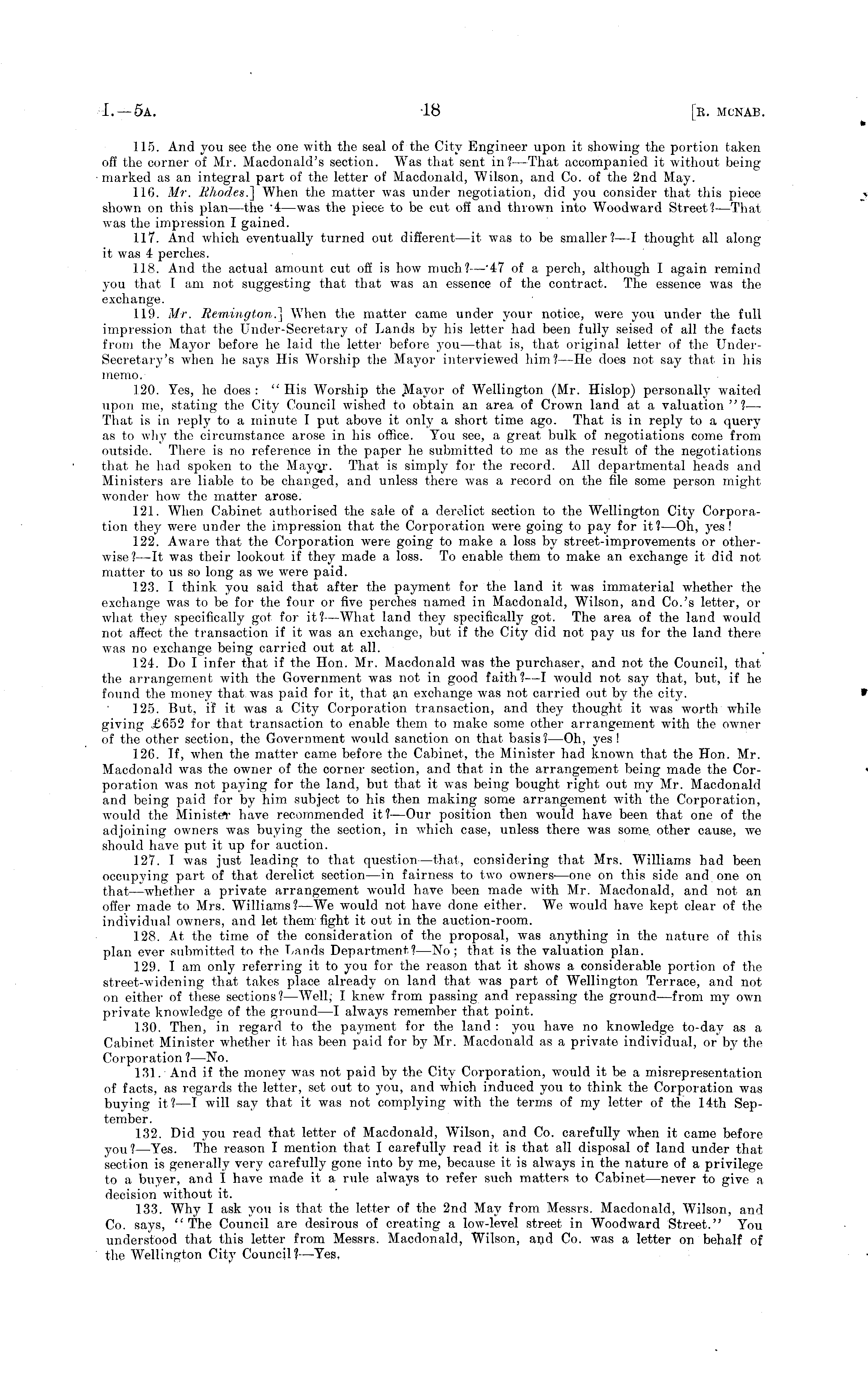 115. And you see the one with the seal of the City Engineer upon it showing the portion taken off the corner of Mr. Macdonald's section. Was that sent in? —That accompanied it without being marked as an integral part of the letter of Macdonald, Wilson, and Co. of the 2nd May. 116. Mr. Rhodes.] When the matter was under negotiation, did you consider that this piece shown on this plan—the "4—was the piece to be cut off and thrown into Woodward Street? —That was the impression I gained. 117. And which eventually turned out different —it was to be smaller? —I thought all along it was 4 perches. 118. And the actual amount cut off is how much?—' 47 of a perch, although I again remind you that I am not suggesting that that was an essence of the contract. The essence was the exchange. 119. Mr. Remington.] When the matter came under your notice, were you under the full impression that the Under-Secretary of Lands by his letter had been fully seised of all the facts from the Mayor before he laid the letter before you —that is, that original letter of the UnderSecretary's when he says His Worship the Mayor interviewed him? —He does not say that in his memo. 120. Yes, he does: "His Worship the Mayor of Wellington (Mr. Hislop) personally waited upon me, stating the City Council wished to obtain an area of Crown land at a valuation " ?— That is in reply to a minute I put above it only a short time ago. That is in reply to a query as to why the circumstance arose in his office. You see, a great bulk of negotiations come from outside. There is no reference in the paper he submitted to me as the result of the negotiations that he had spoken to the Mayqr. That is simply for the record. All departmental heads and Ministers are liable to be changed, and unless there was a record on the file some person might wonder how the matter arose. 121. When Cabinet authorised the sale of a derelict section to the Wellington City Corporation they were under the impression that the Corporation were going to pay for it?—Oh, yes ! 122. Aware that the Corporation were going to make a loss by street-improvements or otherwise?—lt was their lookout if they made a loss. To enable them to make an exchange it did not matter to us so long as we were paid. 123. I think you said that after the payment for the land it was immaterial whether the exchange was to be for the four or five perches named in Macdonald, Wilson, and Co.'s letter, or what they specifically got for it?— What land they specifically got. The area of the land would not affect the transaction if it was an exchange, but if the City did not pay us for the land there w r as no exchange being carried out at all. 124. Do I infer that if the Hon. Mr. Macdonald was the purchaser, and not the Council, that the arrangement with the Government was not in good faith? —I would not say that, but, if he found the money that was paid for it, that an exchange was not carried out by the city. 125. But, if it was a City Corporation transaction, and they thought it was worth while giving £652 for that transaction to enable them to make some other arrangement with the owner of the other section, the Government would sanction on that basis? —Oh, yes! 126. If, wdien the matter came before the Cabinet, the Minister had known that the Hon. Mr. Macdonald was the owner of the corner section, and that in the arrangement being made the Corporation was not paying for the land, but that it was being bought right out my Mr. Macdonald and being paid for by him subject to his then making some arrangement with the Corporation, would the Minister have recommended it? —Our position then would have been that one of the adjoining owners was buying the section, in which case, unless there was some, other cause, we should have put it up for auction. 127. I was just leading to that question—that, considering that Mrs. Williams had been occupying part of that derelict section—in fairness to two owners—one on this side and one on that —whether a private arrangement would have been made with Mr. Macdonald, and not an offer made to Mrs. Williams? —We would not have done either. We would have kept clear of the individual owners, and let them fight it out in the auction-room. 128. At the time of the consideration of the proposal, was anything in the nature of this plan ever submitted to the Lands Department?—No; that is the valuation plan. 129. I am only referring it to you for the reason that it shows a considerable portion of the street-widening that takes place already on land that was part of Wellington Terrace, and not on either of these sections? —Well; I knew from passing and repassing the ground—from my own private knowledge of the ground—l always remember that point. 130. Then, in regard to the payment for the land : you have no knowledge to-day as a Cabinet Minister whether it lias been paid for by Mr. Macdonald as a private individual, or by the Corporation ?—No. 131. And if the money was not paid by the City Corporation, would it be a misrepresentation of facts, as regards the letter, set out to you, and which induced you to think the Corporation was buying it?—l will say that it was not complying with the terms of my letter of the 14th September. 132. Did you read that letter of Macdonald, Wilson, and Co. carefully when it came before you? —Yes. The reason I mention that I carefully read it is that all disposal of land under that section is generally very carefully gone into by me, because it is always in the nature of a privilege to a buyer, and I have made it a rule always to refer such matters to Cabinet—never to give a decision without it. 133. Why I ask you is that the letter of the 2nd May from Messrs. Macdonald, Wilson, and Co. says, "The Council are desirous of creating a low-level street in Woodward Street," You understood that this letter from Messrs. Macdonald, Wilson, and Co. was a letter on behalf of the Wellington City Council