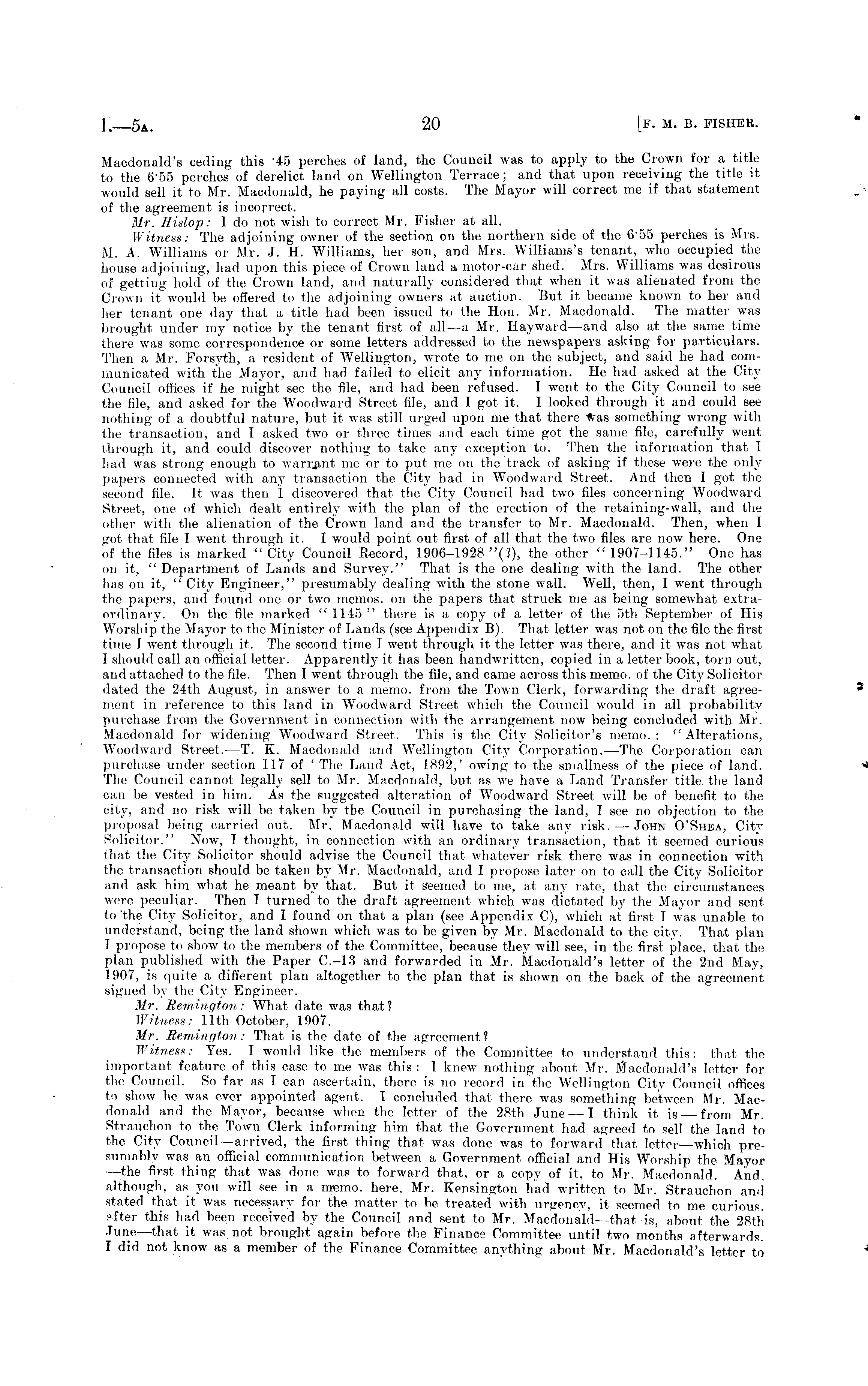 Macdonald's ceding this '45 perches of land, the Council was to apply to the Crown for a title to the 6-55 perches of derelict land on Wellington Terrace; and that upon receiving the title it would sell it to Mr. Macdonald, he paying all costs. The Mayor will correct me if that statement of the agreement is incorrect. Mr. Hislop: I do not wish to correct Mr. Fisher at all. Witness: The adjoining owner of the section on the northern side of the 655 perches is Mrs. M. A. Williams or Mr. J. H. Williams, her son, and Mrs. Williams's tenant, who occupied the house adjoining, had upon this piece of Crown land a motor-car shed. Mrs. Williams was desirous of getting hold of the Crown land, and naturally considered that when it was alienated from the Crown it would be offered to the adjoining owners at auction. But it became known to her and her tenant one day that a title had been issued to the Hon. Mr. Macdonald. The matter was brought under my notice by the tenant first of all—a Mr. Hayward—and also at the same time there was some correspondence or some letters addressed to the newspapers asking for particulars. Then a Mr. Forsyth, a resident of Wellington, wrote to me on the subject, and said he had communicated with the Mayor, and had failed to elicit any information. He had asked at the City Council offices if he might see the file, and had been refused. I went to the City Council to see the file, and asked for the Woodward Street file, and I got it. I looked through it and could see nothing of a doubtful nature, but it was still urged upon me that there Was something wrong with the transaction, and I asked two or three times and each time got the same file, carefully went through it, and could discover nothing to take any exception to. Then the information that I had was strong enough to warrjint me or to put me on the track of asking if these were the only papers connected with any transaction the City had in W T oodw T ard Street. And then I got the second file. It was then I discovered that the City Council had two files concerning Woodward Street, one of which dealt entirely with the plan of the erection of the retaining-wall, and the other with the alienation of the Crown land and the transfer to Mr. Macdonald. Then, when I got that file I went through it. I would point out first of all that the two files are now here. One of the files is marked "City Council Record, 1906-1928 "(?), the other "1907-1145." One has on it, " Department of Lands and Survey." That is the one dealing with the land. The other has on it, " City Engineer," presumably dealing with the stone wall. Well, then, I went through the papers, and found one or two memos, on the papers that struck me as being somewhat extraordinary. On the file marked " 1145 " there is a copy of a letter of the sth September of His Worship the Mayor to the Minister of Lands (see Appendix B). That letter was not on the file the first time I went through it. The second time I went through it the letter was there, and it was not what I should call an official letter. Apparently it has been handwritten, copied in a letter book, torn out, and attached to the file. Then I went through the file, and came across this memo, of the City Solicitor dated the 24th August, in answer to a memo, from the Town Clerk, forwarding the draft agreement in reference to this land in Woodxvard Street which the Council would in all probability purchase from the Government in connection with the arrangement now being concluded with Mr. Macdonald for widening Woodward Street, This is the City Solicitor's memo.: "Alterations, Woodward Street.—T. K. Macdonald and Wellington City Corporation.—The Corporation can purchase under section 117 of ' The Land Act, 1892,' owing to the smallness of the piece of land. The Council cannot legally sell to Mr. Macdonald, but as we have a Land Transfer title the land can be vested in him. As the suggested alteration of Woodward Street will be of benefit to the city, and no risk will be taken by the Council in purchasing the land, I see no objection to the proposal being carried out. Mr. Macdonald will have to take any risk. — John O'Shea, City Solicitor." Now, I thought, in connection with an ordinary transaction, that it seemed curious that the City Solicitor should advise the Council that whatever risk there was in connection with the transaction should be taken by Mr. Macdonald, and I propose later on to call the City Solicitor and ask him what he meant by that. But it deemed to me, at any rate, that the circumstances were peculiar. Then I turned to the draft agreement which was dictated by the Mayor and sent to'the City Solicitor, and I found on that a plan (see Appendix C), which at first I was unable to understand, being the land shown which was to be given by Mr. Macdonald to the city. That plan I propose to show to the members of the Committee, because they will see, in the first place, that the plan published with the Paper C.-13 and forwarded in Mr. Macdonald's letter of the 2nd May, 1907, is quite a different plan altogether to the plan that is shown on the back of the agreement signed by the City Engineer. Mr. Remington: What date was that? Witness: 11th October, 1907. Mr. Remington : That is the date of the agreement? Witness: Yes. I would like the members of the Committee to understand this: that the important feature of this case to me was this: I knew nothing about Mr. Macdonald's letter for the Council. So far as I can ascertain, there is no record in the Wellington City Council offices to show he was ever appointed agent, I concluded that there was something between Mr. Macdonald and the Mayor, because when the letter of the 28th June—l think it is from Mr. Strauchon to the Town Clerk informing him that the Government had agreed to sell the land to the City Council—arrived, the first thing that was done was to forward that letter —which presumable- was an official communication between a Government 
