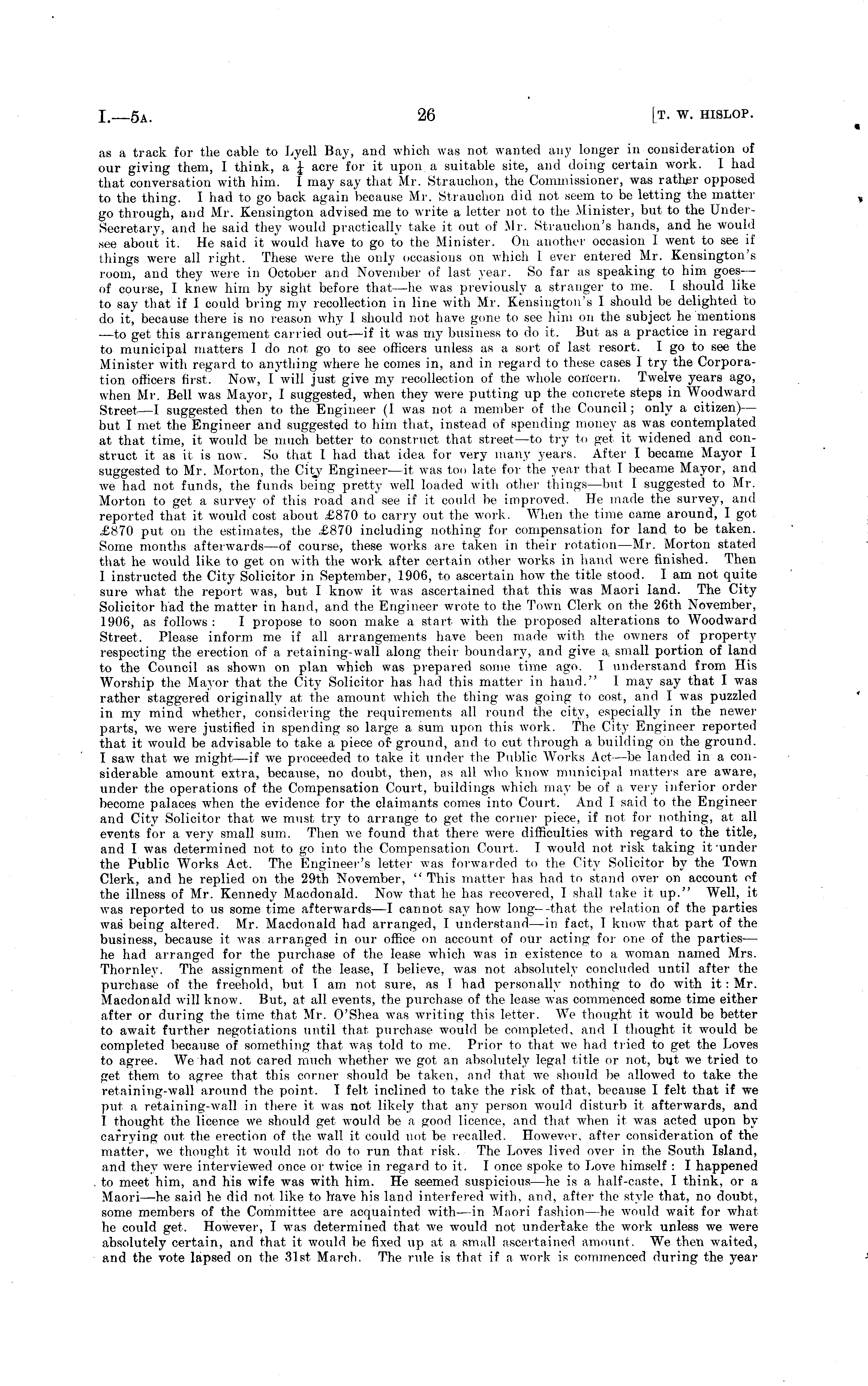as a track for the cable to Lyell Bay, and which was not wanted any longer in consideration of our giving them, I think, a { acre for- it upon a suitable site, and doing certain work. I had that conversation with him. 1 may .say that Mr. Strauehon, the Commissioner, was rather opposed to the thing. I had to go back again because Mr. Strauchon did not seem to be letting the matter go through, and Mr. Kensington advised me to write a letter not to the Minister, but to the Undersecretary, and lie said they would practically take it out of Mr. Strauchon's hands, and he would see about it. He said it would have to go to the Minister. On another occasion 1 went to see if things were all right. These were the only occasions on which 1 ever entered Mr. Kensington's room, and they were in October and November of last year. So far- as speaking to him goes — of course, I knew him by sight before that—lie was previously a stranger to me. I should like to say that if 1 could bring my recollection in line with Mr. Kensington's I should be delighted to do it, because there is no reason why I should not have gone to see him mi the subject he mentions —to get this arrangement carried out —if it was my business to do it. But as a practice in regard to municipal matters I do not go to see officers unless as a sort of last resort. I go to see the Minister with regard to anything where he comes in, and in regard to these cases 1 try the Corporation officers first. Now, I will just give my recollection of the whole concern. Twelve years ago, when Mr. Bell was Mayor, I suggested, when they were putting up the conorete steps in Woodward Street—l suggested then to the Engineer (I was not a member of the Council; only a citizen) — but I met the Engineer and suggested to him that, instead of spending money as was contemplated at that time, it would be much better to construct that street —to try to get it widened and construct it as it is now. So that I had that idea for very many years. After I became Mayor 1 suggested to Mr. Morton, the City Engineer—it was too late for the year that 1 became Mayor, and we had not funds, the funds being pretty well loaded with other things—but 1 suggested to Mr. Morton to get a survey of this road and see if it could be improved. He made the survey, and reported that it would cost about £870 to carry out the work. When the time came around, I got £870 put on the estimates, the £870 including nothing for compensation for land to be taken. Some months afterwards —of course, these works are taken in their rotation —Mr. Morton stated that he would like to get on with the work after certain other works in hand were finished. Then I instructed the City Solicitor in September, 1906, to aecertain how the title stood. lam not quite sure what the report was, but I know it was ascertained that this was Maori land. The City Solicitor had the matter in hand, and the Engineer wrote to the Town Clerk on the 26th November, 1906, as follows : I propose to soon make a start with the proposed alterations to Woodward Street. Please inform me if all arrangements have been made with the owners of property respecting the erection of a retaining-wall along their boundary, and give a. small portion of land to the Council as shown on plan which was prepared some time ago. I understand from His Worship the Mayor that the City Solicitor has had this matter in hand." I may say that I was rather staggered originally at the amount which the thing was going to cost, and I was puzzled in mv mind whether, considering the requirements all round the city, especially in the newer parts, we were justified in spending so large a sum upon this work. The City Engineer reported that it would be advisable to take a piece of ground, and to cut through a building on the ground. I saw that we might—if we proceeded to take it under the Public Works Act—bo landed in a considerable amount extra, because, no doubt, then, as all who know municipal matters are aware, under the operations of the Compensation Court, buildings which may be of a very inferior order become palaces when the evidence for the claimants (nines into Court. And I said to the Engineer and City Solicitor that we must try to arrange to get the corner piece, if not for nothing, at all events for a very small sum. Then we found that there were difficulties with regard to the title, and I was determined not to go into the Compensation Court. 1 would not risk taking it under the Public Works Act. The Engineer's letter was forwarded to the City Solicitor by the Town Clerk, and he replied on the 29th November, " This matter has had to stand over on account of the illness of Mr. Kennedy Macdonald. Now that he has recovered, 1 shall take it up." Well, it was reported to us some time afterwards —I cannot say how long—-that the relation of the parties was being altered. Mr. Macdonald had arranged, T understand —in fact, I know that part of the business, because it was. arranged in our office on account of our acting for one of the parties— he had arranged for the purchase of the lease which was in existence to a woman named Mrs. Thornley. The assignment of the lease, I believe, was not absolutely concluded until after the purchase of the freehold, but 1 am not sure, as 1 had personally nothing to do with it : Mr. Macdonald will know. But, at all events, the purchase of the lease was commenced some time either after or during the time that Mr. O'Shea was writing this letter. We thought it would be better to await further negotiations until that purchase would be completed, and I thought it would be completed because of something that was told to me. Prior to that we had tried to get the Loves to agree. We had not cared much whether we got an absolutely legal title or not, but we tried to get them to agree that this corner should be taken, and that we should be allowed to take the retaining-wall around the point. I felt inclined to tak