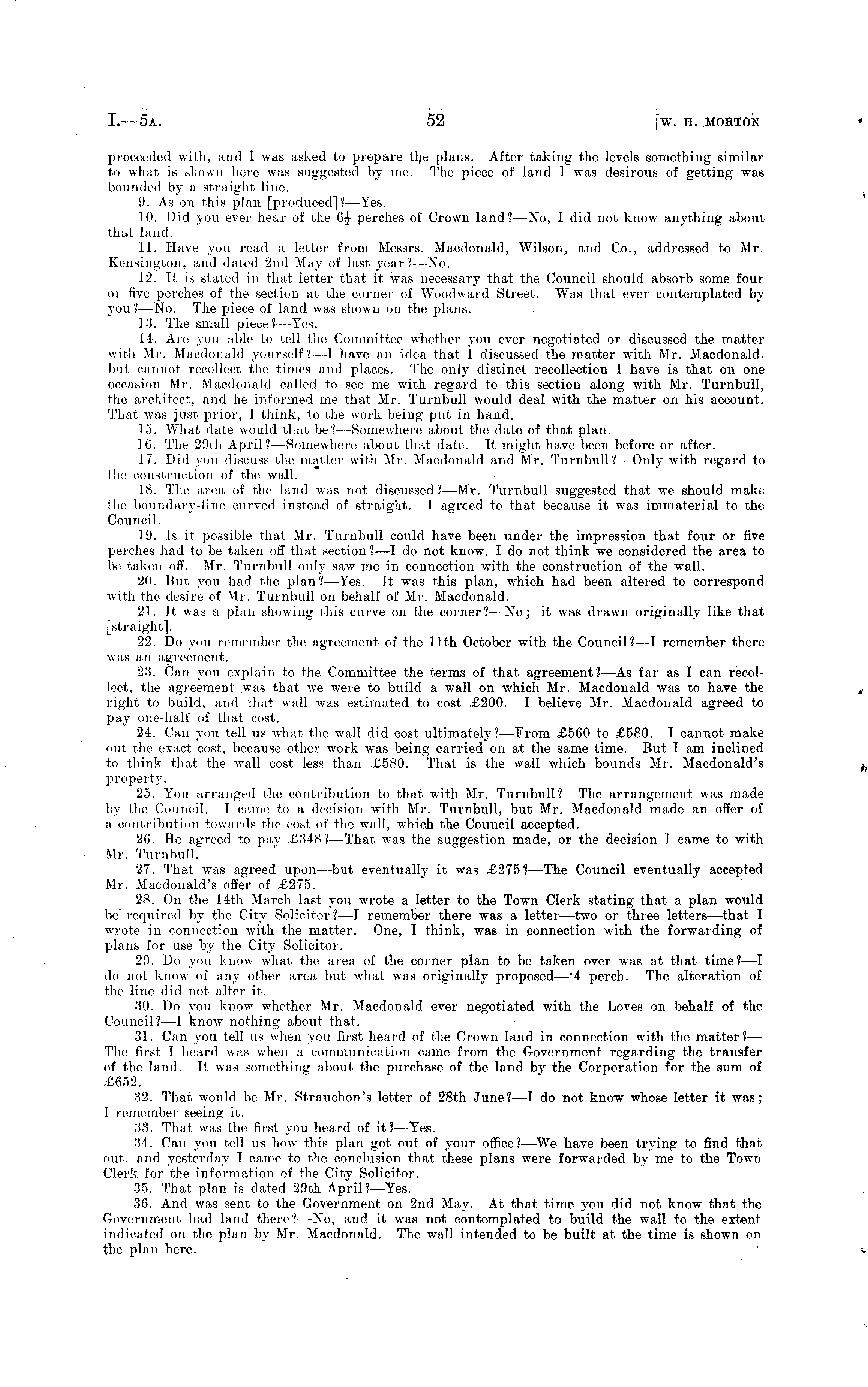 proceeded with, and 1 was asked to prepare the plans. After taking the levels something similar to xvhat is shown here was suggested by me. The piece of land I xvas desirous of getting was bounded by a straight line. 9. As on this plan [produced]?— Yes. 10. Did you ever hear of the 6J perches of Crown land?—No, I did not know anything about that land. 11. Have you read a letter from Messrs. Macdonald, Wilson, and Co., addressed to Mr. Kensington, and dated 2nd May of last year?— No. 12. It is stated in that letter that it xvas necessary that the Council should absorb some four or five perches of the section at the corner of Woodxvard Street. Was that ever contemplated by you?— No. The piece of land xvas shown on the plans. 13. The small piece?— Yes. 14. Are you able to tell the Committee xvhether you ever negotiated or discussed the matter with Mr. Macdonald yourself?—l have an idea that I discussed the matter xvith Mr. Macdonald, but cannot recollect the times and places. The only distinct recollection I have is that on one occasion Mr. Macdonald called to see me with regard to this section along with Mr. Turnbull, the architect, and he informed me that Mr. Turnbull xvould deal with the matter on his account. That xvas just prior, I think, to the work being put in hand. 15. What date xvould that be?—Somexxhere. about the date of that plan. 16. The 29th April?—Somexvhere about that date. It might have been before or after. 17. Did you discuss the matter xvith Mr. Macdonald and Mr. Turnbull?—Only with regard to the construction of the wall. 18. The area of the land xvas not discussed? —Mr. Turnbull suggested that we should make the boundary-line curved instead of straight. I agreed to that because it xvas immaterial to the Council. .19. Is it possible that Mr. Turnbull could have been under the impression that four or five perches had to be taken off that section?—l do not know. I do not think xve considered the area to be taken off. Mr. Turnbull only saxv me in connection xvith the construction of the wall. 20. But you had the plan?— Yes. It was this plan, which had been altered to correspond xvith the desire of Mr. Turnbull on behalf of Mr. Macdonald. 21. It xvas a plan shoxving this curve on the corner?—No; it xvas drawn originally like that [straight]. 22. Do you remember the agreement of the 11th October with the Council?—l remember there xvas an agreement. 23. Can you explain to the Committee the terms of that agreement?—As far as I can recollect, the agreement was that xve xvere to build a wall on which Mr. Macdonald xvas to have the right to build, and that xvall was estimated to cost £200. I believe Mr. Macdonald agreed to pay one-half of that cost. 24. Can you tell us xvhat the xvall did cost ultimately?— From £560 to £580. I cannot make out the exact cost, because other xvork was being carried on at the same time. But I am inclined to think that the xvall cost less than £580. That is the xvall which bounds Mr. Macdonald's property. 25. You arranged the contribution to that with Mr. Turnbull? —The arrangement was made by the Council. I came to a decision with Mr. Turnbull, but Mr. Macdonald made an offer of a contribution toxvards the cost of the wall, which the Council accepted. 26. He agreed to pay £348?— That was the suggestion made, or the decision I came to with Mr. Turnbull. 27. That xvas agreed upon —but eventually it was £275?— The Council eventually accepted Mr. Macdonald's offer of £275. 28. On the 14th March last you wrote a letter to the Town Clerk stating that a plan would be' required by the City Solicitor I —l remember there was a letter —txvo or three letters —that I xvrotc in connection xvith the matter. One, I think, was in connection with the forwarding of plans for use by the City Solicitor. 29. Do you know xvhat the area of the corner plan to be taken over xvas at that time? —I do not knoxv of any other area but what was originally proposed—'4 perch. The alteration of the line did not alter it. 30. Do you know whether Mr. Macdonald ever negotiated xvith the Loves on behalf of the Council? —I knoxv nothing about that. 31. Can you tell us xvhen you first heard of the Crown land in connection with the matter?— The first I heard xvas xvhen a communication came from the Government regarding the transfer of the land. It was something about the purchase of the land by the Corporation for the sum of £652. 32. That would be Mr. Strauchon's letter of 2Bth June? —I do not know whose letter it was; I remember seeing it. 33. That xvas the first you heard of it?— Yes. 34. Can you tell us hoxv this plan got out of your office?—We have been trying to find that out, and yesterday I came to the conclusion that these plans were forwarded by me to the Town Clerk for the information of the City Solicitor. 35. That plan is dated 29th April?— Yes. 36. And was sent to the Government on 2nd May. At that time you did not know that the Government had land there? —No, and it was not contemplated to build the wall to the extent indicated on the plan by Mr. Macdonald. The wall intended to be built at the time is shown on the plan here.