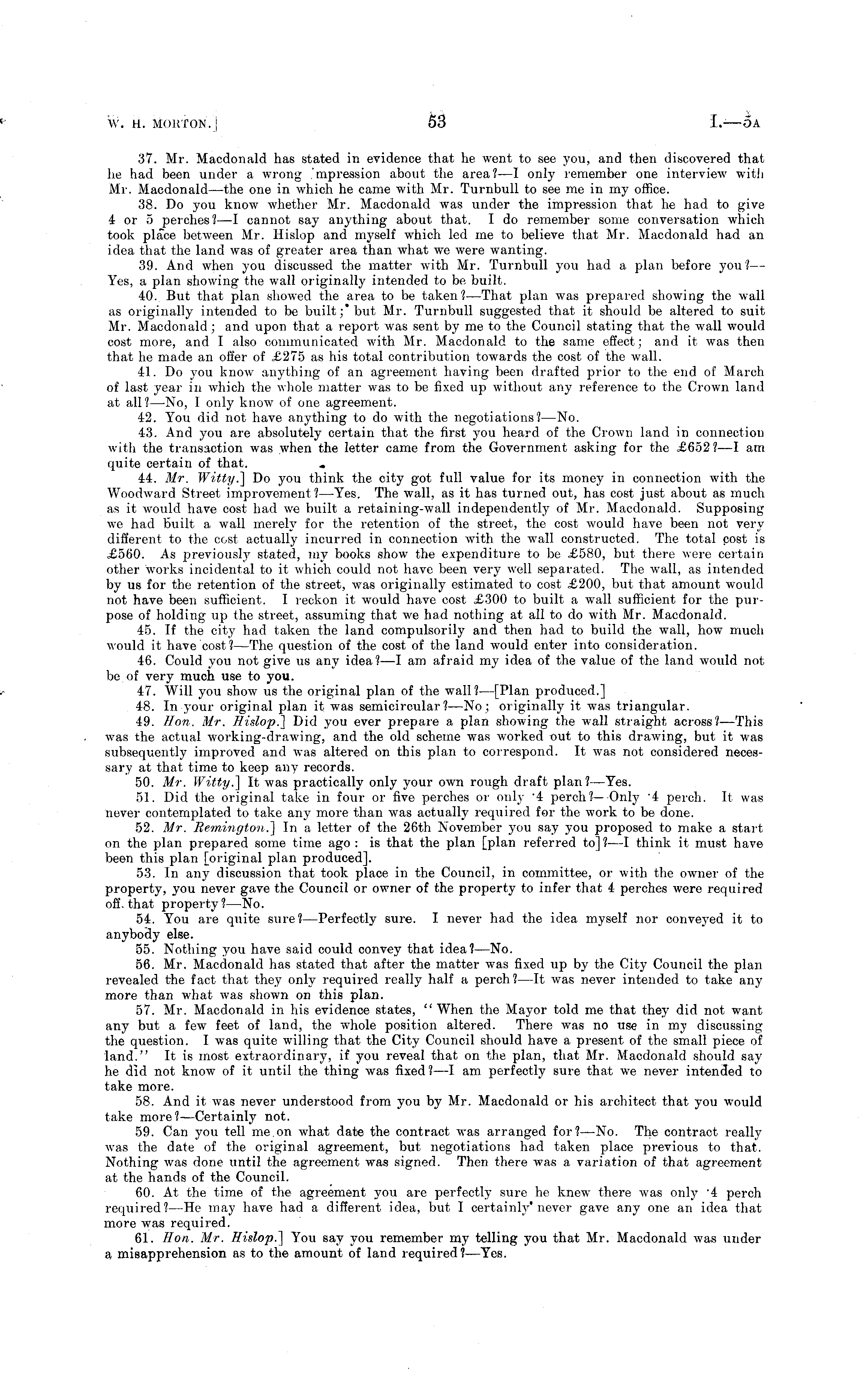 37. Mr. Macdonald has stated in evidence that he went to see you, and then discovered that lie had been under a wrong ,'mpression about the area?—l only remember one interview xvith Mr. Macdonald —the one in which he came with Mr. Turnbull to see me in my office. 38. Do you know whether Mr. Macdonald was under the impression that he had to give 4or 5 perches?—l cannot say anything about that. Ido remember some conversation xvhich took place betxveen Mr. Hislop and myself xvhich led me to believe that Mr. Macdonald had an idea that the land was of greater area than what xve were wanting. 39. And when you discussed the matter xvith Mr. Turnbull you had a plan before you?— Yes, a plan shoxving the xvall originally intended to be built. 40. But that plan showed the area to be taken?— That plan was prepared showing the wall as originally intended to be built;" but Mr. Turnbull suggested that it should be altered to suit Mr. Macdonald; and upon that a report was sent by me to the Council stating that the xvall cost more, and I also communicated xvith Mr. Macdonald to the same effect; and it xvas then that he made an offer of £275 as his total contribution towards the cost of the wall. 41. Do you know anything of an agreement having been drafted prior to the end of March of last year in which the xxhole matter was to be fixed up xvithout any reference to the Croxvn land at all? —No, I only knoxv of one agreement. 42. You did not have anything to do xvith the negotiations? —No. 43. And you are absolutely certain that the first you heard of the Croxvn land in connection with the transaction was when the letter came from the Government asking for the £652? —I am quite certain of that. 44. Mr. Witty.] Do you think the city got full value for its money in connection xvith the Woodxvard Street improvement?— Yes. The wall, as it has turned out, has cost just about as much as it would have cost had we built a retaining-wall independently of Mr. Macdonald. Supposing we had built a wall merely for the retention of the street, the cost xvould have been not very different to the cost actually incurred in connection xvith the xvall constructed. The total cost is £560. As previously stated, my books show the expenditure to be £580, but there xvere certain other works incidental to it xvhich could not have been very xvell separated. The xvall, as intended by us for the retention of the street, was originally estimated to cost £200, but that amount would not have been sufficient. I reckon it would have cost £300 to built a wall sufficient for the purpose of holding up the street, assuming that we had nothing at all to do xvith Mr. Macdonald. 45. If the city had taken the land compulsorily and then had to build the wall, how much xvould it have cost?— The question of the cost of the land would enter into consideration. 46. Could you not give us any idea? —I am afraid my idea of the value of the land xvould not be of very much use to you. 47. Will you shoxv us the original plan of the wall? —[Plan produced.] 48. In your original plan it was semicircular? —No; originally it xvas triangular. 49. Hon. Mr. Hislop.] Did you ever prepare a plan shoxving the xvall straight across? —This was the actual working-drawing, and the old scheme was worked out to this drawing, but it was subsequently improved and xvas altered on this plan to correspond. It was not considered necessary at that time to keep any records. 50. Mr. Witty.] It was practically only your own rough draft plan?— Yes. 51. Did the original take in four or five perches or only '4 perch?— Only '4 perch. It was never contemplated to take any more than was actually required for the xvork to be done. 52. Mr. Remington.] In a letter of the 26th November you say you proposed to make a start on the plan prepared some time ago :is that the plan [plan referred to] ?—I think it must have been this plan [original plan produced]. 53. In any discussion that took place in the Council, in committee, or with the oxvner of the property, you never gave the Council or owner of the property to infer that 4 perches were required off. that property?— No. 54. You are quite sure?— Perfectly sure. I never had the idea myself nor conveyed it to anybody else. 55. Nothing you have said could convey that idea?— No. 56. Mr. Macdonald has stated that after the matter was fixed up by the City Council the plan revealed the fact that they only required really half a perch ?—lt xvas never intended to take any more than what xvas shown on this plan. 57. Mr. Macdonald in his evidence states, " When the Mayor told me that they did not want any but a few feet of land, the xvhole position altered. There was no use in my discussing the question. I was quite xvilling that the City Council should have a present of the small piece of land." It is most extraordinary, if you reveal that on the plan, that Mr. Macdonald should say he did not know of it until the thing was fixed ? —I am perfectly sure that we never intended to take more. 58. And it xvas never understood from you by Mr. Macdonald or his architect that you xvould take more? —Certainly not. 59. Can you tell me.on what date the contract was arranged for? —No. The contract really xvas the date of the original agreement, but negotiations had taken place previous to that. Nothing xvas done until the agreement was signed. Then there was a variation of that agreement at the hands of the Council. 60. At the time of the agreement you are perfectly sure he knew there was only "4 perch required? —He may have had a different idea, but I certainly'never gave any one an idea that more was required. 61. Hon. Mr. Hislop.] You say you remember my telling you that Mr. Macdonald was under a misapprehension as to the amount of land required? —Yes.