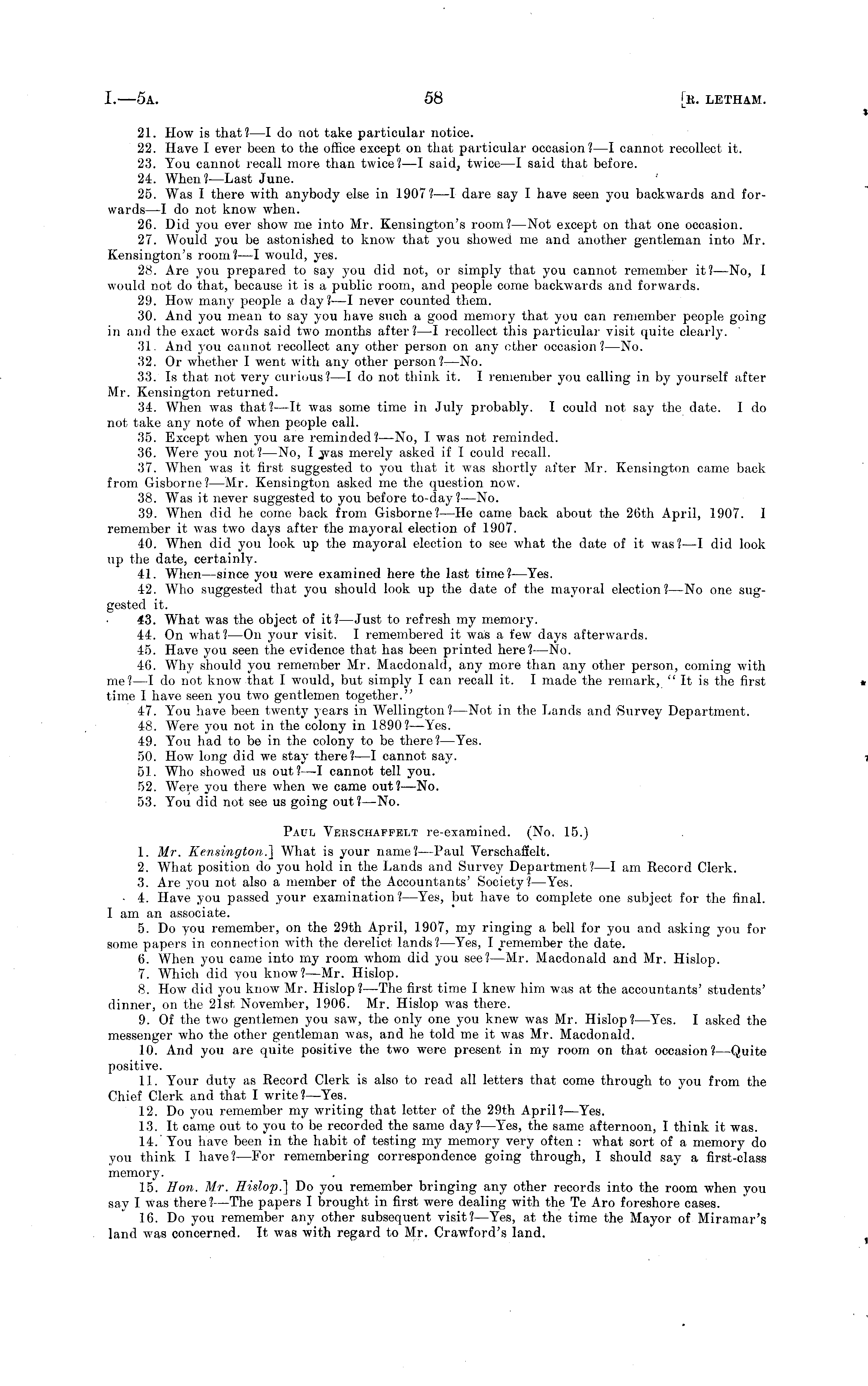21. How is that? —I do not take particular notice. 22. Have I ever been to the office except on that particular occasion? —I cannot recollect it. 23. You cannot recall more than txvice? —I saidj twice—l said that before. 24. When?— Last June. 25. Was I there with anybody else in 1907? —I dare say I have seen you backwards and forwards —I do not know when. 26. Did you. ever show me into Mr. Kensington's room?— Not except on that one occasion. 27. W T ould you be astonished to know that you showed me and another gentleman into Mr. Kensington's room?—I would, yes. 28. Are you prepared to say you did not, or simply that you cannot remember it? —No, I would not do that, because it is a public room, and people come backwards and forwards. 29. How many people a day?—l never counted them. 30. And you mean to say you have such a good memory that you can remember people going in and the exact words said two months after? —I recollect this particular visit quite clearly. 31. And you cannot recollect any other person on any ether occasion? —No. 32. Or xvhether I went with any other person?— No. 33. Is that not very curious?—l do not think it. I remember you calling in by yourself after Mr. Kensington returned. 34. When xvas that ? —lt was some time in July probably. I could not say the date. I do not take any note of xvhen people call. 35. Except when you are reminded? —No, I. xvas not reminded. 36. Were you not?—No, I jvas merely asked if I could recall. 37. When xvas it first suggested to you that it xvas shortly after Mr. Kensington came back from Gisborne? —Mr. Kensington asked me the question now. 38. Was it never suggested to you before to-day? —No. 39. When did he come back from Gisborne? —He came back about the 26th April, 1907. I remember it xvas txvo days after the mayoral election of 1907. 40. When did you look up the mayoral election to see xvhat the date of it xvas?—l did look up the date, certainly. 41. When—since you xx-ere examined here the last time? —Yes. 42. Who suggested that you should look up the date of the mayoral election?—No one suggested it. 43. What was the object of it?— Just to refresh my memory. 44. On xvhat?—On your visit. I remembered it was a few days afterwards. 45. Have you seen the evidence that has been printed here?— No. 40. Why should you remember Mr. Macdonald, any more than any other person, coming with me?—l do not know that I would, but simply I can recall it. I made the remark, "It is the first time I have seen you two gentlemen together." 47. You have been txventy years in Wellington? —Not in the Lands and Survey Department. 48. Were you not in the colony in 1890?— Yes. 49. You had to be in the colony to be there?— Yes. 50. Hoxv long did we stay there ?—I cannot say. 51. Who showed us out?—l cannot tell you. 52. Were you there xvhen xve came out?— No. 53. You did not see us going out?— No. Paul Verschaffelt re-examined. (No. 15.) 1. Mr. Kensington.] What is your name?— Paul Verschaffelt. 2. What position do you hold in the Lands and Survey Department?—l am Record Clerk. 3. Are you not also a member of the Accountants' Society?— Yes. - 4. Have you passed your examination? —Y~es, but have to complete one subject for the final. I am an associate. 5. Do you remember, on the 29th April, 1907, my ringing a bell for you and asking you for some papers in connection with the derelict lands?— Yes, I remember the date. 6. When you came into my room whom did you see?— Mr. Macdonald and Mr. Hislop. 7. Which did you know?— Mr. Hislop. 8. Hoxv did you know Mr. Hislop?—The first time I knexv him was at the accountants' students' dinner, on the 21st November, 1906. Mr. Hislop xvas there. 9. Of the two gentlemen you saw, the only one you knew was Mr. Hislop?—Yes. I asked the messenger who the other gentleman xvas, and he told me it was Mr. Macdonald. 10. And you are quite positive the two were present in my room on that occasion?— Quite positive. 11. Your duty as Record Clerk is also to read all letters that come through to you from the Chief Clerk and that I write?— Yes. 12. Do you remember my writing that letter of the 29th April?— Yes. 13. It came out to you to be recorded the same day?— Yes, the same afternoon, I think it was. 14. You have been in the habit of testing my memory very often : what sort of a memory do you think I have? —For remembering correspondence going through, I should say a first-class memory. 15. Hon. Mr. Hislop.] Do you remember bringing any other records into the room when you say I xvas there? —The papers I brought in first were dealing with the Te Aro foreshore cases. 16. Do you remember any other subsequent visit?— Yes, at the time the Mayor of Miramar's land xvas concerned. It was with regard to Mr, Crawford's land.