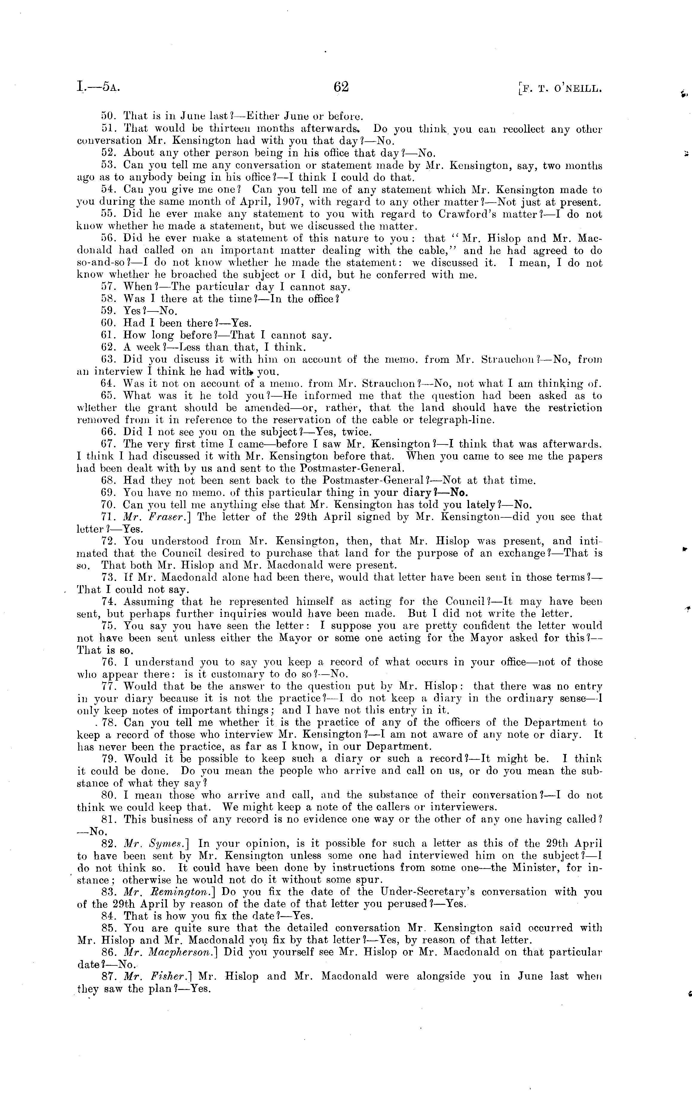 50. That is in June last?— Either June or before. 51. That would be thirteen months afterwards. Do you think you can recollect any other conversation Mr. Kensington had with you that day? —No. 52. About any other person being in his office that day?— No. 53. Can you tell me any conversation or statement made by Mr. Kensington, say, two months ago as to anybody being in his office? —I think I could do that. 54. Can you give me one? Can you tell me of any statement which Mr. Kensington made to you during the same month of April, 1907, with regard to any other matter?— Not just at present. 55. Did he ever make any statement to you with regard to Crawford's matter? —I do not know xvhether he made a statement, but xve discussed the matter. 56. Did lie ever make a statement of this nature to you : that " Mr. Hislop and Mr. Macdonald had called on an important matter dealing with the cable," and he had agreed to do so-and-so?—I do not know xvhether lie made the statement: we discussed it. I mean, I do not know whether he broached the subject or I did, but he conferred xvith me. 57. When? —The particular day I cannot say. 58. Was I there at the time? —In the office? 59. Yes?— No. 60. Had I been there? —Yes. 61. How long before?— That I cannot say. 62. A xveek? —Less than that, I think. 63. Did you discuss it xvith him on account of the memo, from Mr. Strauchon?—No, from an interview I think he had with you. 64. Was it not on account of a memo, from Mr. Strauchon?—No, not what I am thinking of. 65. What xvas it he told you?—He informed me that the question had been asked as to xvhether the grant should be amended —or, rather, that the land should have the restriction removed from it in reference to the reservation of the cable or telegraph-line. 66. Did I not see you on the subject?— Yes, twice. 67. The very first time I came —before I saw Mr. Kensington? —I think that xvas afterwards. I think I had discussed it xvith Mr. Kensington before that. When you came to see me the papers had been dealt xvith by us and sent to the Postmaster-General. 68. Had they not been sent back to the Postmaster-General?—Not at that time. 69. You have no memo, of this particular thing in your diary?- —No. 70. Can you tell me anything else that Mr. Kensington has told you lately?— No. 71. Mr. Fraser.] The letter of the 29th April signed by Mr. Kensington—did you see that letter ?—Yes. 72. You understood from Mr. Kensington, then, that Mr. Hislop xvas present, and intimated that the Council desired to purchase that land for the purpose of an exchange?— That is so. That both Mr. Hislop and Mi-. Macdonald xx'ere present. 73. If Mr. Macdonald alone had been there, xxould that letter have been sent in those terms?— That I could not say. 74. Assuming that he represented himself as acting for the Council?—lt may have been sent, but perhaps further inquiries would have been made. But I did not xvrite the letter. 75. You say you have seen the letter: I suppose you are pretty confident the letter would not have been sent unless either the Mayor or some one acting for the Mayor asked for this ?— That is so. 76. I understand you to say you keep a record of xvhat occurs in your office —not of those who appear there: is it customary to do so?— No. 77. Would that be the ansxver to the question put by Mr. Hislop: that there xvas no entry in your diary because it is not the practice?—l do not keep a diary in the ordinary sense —I only keep notes of important things ; and I have not this entry in it. . 78. Can you tell me xvhether it is the practice of any of the officers of the Department to keep a record of those who interview Mr. Kensington ?—I am not aware of any note or diary. It has never been the practice, as far as I know, in our Department. 79. Would it be possible to keep such a diary or such a record?—lt might be. I think it could be done. Do you mean the people xvho arrive and call on us, or do you mean the substance of what they say? 80. I mean those xvho arrive and call, and the substance of their conversation? —I do not think xve could keep that. We might keep a note of the callers or interviewers. 81. This business of any record is no evidence one way or the other of any one having called? —No. 82. Mr. Symes.] In your opinion, is it possible for such a letter as this of the 29th April to have been sent by Mr. Kensington unless some one had interviewed him on the subject?—l do not think so. It could have been done by instructions from some one —the Minister, for instance; otherwise he would not do it without some spur. 83. Mr. Remington.] Do you fix the date of the Under-Secretary's conversation xvith you of the 29th April by reason of the date of that letter you perused?— Yes. 84. That is hoxv you fix the date? —Yes. 85. You are quite sure that the detailed conversation Mr. Kensington said occurred with Mr. Hislop and Mr. Macdonald you fix by that letter?— Yes, by reason of that letter. 86. Mr. Macpherson.] Did you yourself see Mr. Hislop or Mr. Macdonald on that particular date?— No. 87. Mr. Fisher.] Mi-. Hislop and Mr. Macdonald xvere alongside you in June last when they saxv the plan ?—Yes.