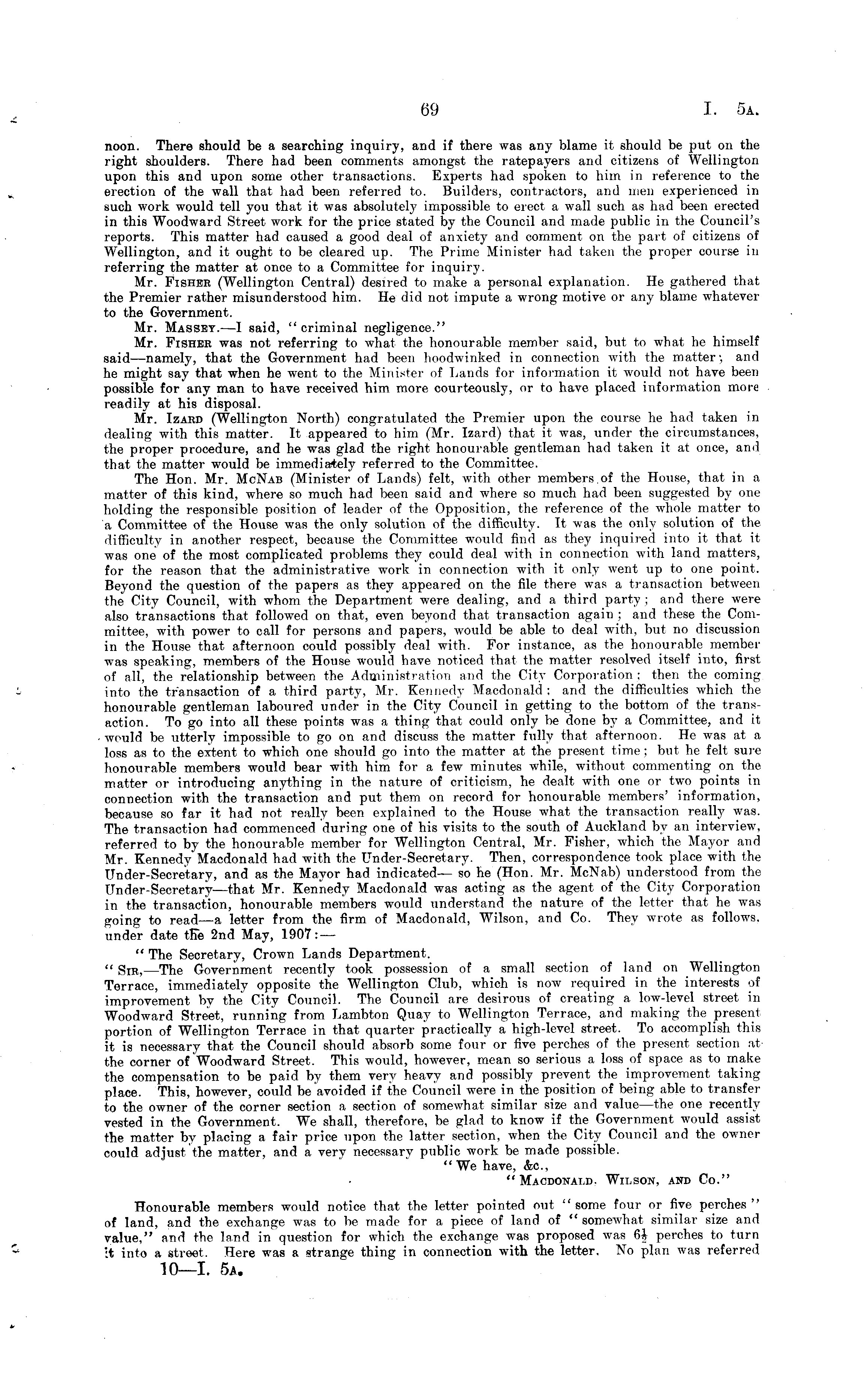 noon. There should be a searching inquiry, and if there was any blame it should be put on the right shoulders. There had been comments amongst the ratepayers and citizens of Wellington upon this and upon some other transactions. Experts had spoken to him in reference to the erection of the wall that had been referred to. Builders, contractors, and men experienced in such work would tell you that it was absolutely impossible to erect a wall such as had been erected in this Woodward Street work for the price stated by the Council and made public in the Council's reports. This matter had caused a good deal of anxiety and comment on the part of citizens of Wellington, and it ought to be cleared up. The Prime Minister had taken the proper course in referring the matter at once to a Committee for inquiry. Mr. Fisher (Wellington Central) desired to make a personal explanation. He gathered that the Premier rather misunderstood him. He did not impute a wrong motive or any blame whatever to the Government. Mr. Massey.—l said, "criminal negligence." Mr. Fisher was not referring to what the honourable member said, but to what he himself said—namely, that the Government had been hoodwinked in connection xvith the matter; and he might say that when he went to the Minister of Lands for information it would not have been possible for any man to have received him more courteously, or to have placed information more readily at his disposal. Mr. Izard (Wellington North) congratulated the Premier upon the course he had taken in dealing with this matter. It appeared to him (Mr. Izard) that it xvas, under the circumstances, the proper procedure, and he was glad the right honourable gentleman had taken it at once, and that the matter would be immediately referred to the Committee. The Hon. Mr. McNab (Minister of Lands) felt, xvith other members.of the House, that in a matter of this kind, where so much had been said and where so much had been suggested by one holding the responsible position of leader of the Opposition, the reference of the xvhole matter to a Committee of the House was the only solution of the difficulty. It was the only solution of the difficulty in another respect, because the Committee would find as they inquired into it that it was one of the most complicated problems they could deal with in connection xvith land matters, for the reason that the administrative work in connection with it only xvent up to one point. Beyond the question of the papers as they appeared on the file there was a transaction betxveen the City Council, with whom the Department were dealing, and a third party ; and there xvere also transactions that followed on that, even beyond that transaction again ; and these the Committee, with power to call for persons and papers, xvould be able to deal with, but no discussion in the House that afternoon could possibly deal with. For instance, as the honourable member was speaking, members of the House would have noticed that the matter resolved itself into, first of all, the relationship between the Administration and the City Corporation; then the coming into the transaction of a third party, Mr. Kennedy Macdonald ; and the difficulties which the honourable gentleman laboured under in the City Council in getting to the bottom of the transaction. To go into all these points was a thing that could only be done by a Committee, and it xvould be utterly impossible to go on and discuss the matter fully that afternoon. He was at a loss as to the extent to which one should go into the matter at the present time ; but he felt sure honourable members would bear with him for a few minutes xvhile, without commenting on the matter or introducing anything in the nature of criticism, he dealt with one or two points in connection with the transaction and put them on record for honourable members' information, because so far it had not really been explained to the House what the transaction really was. The transaction had commenced during one of his visits to the south of Auckland by an interview, referred to by the honourable member for Wellington Central, Mr. Fisher, which the Mayor and Mr. Kennedy Macdonald had with the Under-Secretary. Then, correspondence took place with the Under-Secretary, and as the Mayor had indicated— so he (Hon. Mr. McNab) understood from the Under-Secretary—that Mr. Kennedy Macdonald was acting as the agent of the City Corporation in the transaction, honourable members would understand the nature of the letter that he xvas going to read —a letter from the firm of Macdonald, Wilson, and Co. They xvrote as follows, under date the 2nd May, 1907: — " The Secretary, Crown Lands Department. " s lß) —The Government recently took possession of a small section of land on Wellington Terrace, immediately opposite the Wellington Club, which is noxv required in the interests of improvement by the City Council. The Council are desirous of creating a low-level street in Woodxvard Street, running from Lambton Quay to Wellington Terrace, and making the present portion of Wellington Terrace in that quarter practically a high-level street. To accomplish this it is necessary that the Council should absorb some four or five perches of the present section at the corner of Woodward Street. This would, however, mean so serious a loss of space as to make the compensation to be paid by them very heavy and possibly prevent the improvement taking place. This, however, could be avoided if the Council xvere in the position of being able to transfer to the owner of the corner section a section of somexvhat similar size and value—the one recently vested in the Government. We shall, therefore, be glad to know if the Government xvould assist the matter by placing a fair price upon the latter section, when the City Council and the owner could adjust the matter, and a very necessary public work be made possible. " We have, &c, "Macdonald. Wilson, and Co." Honourable members would no
