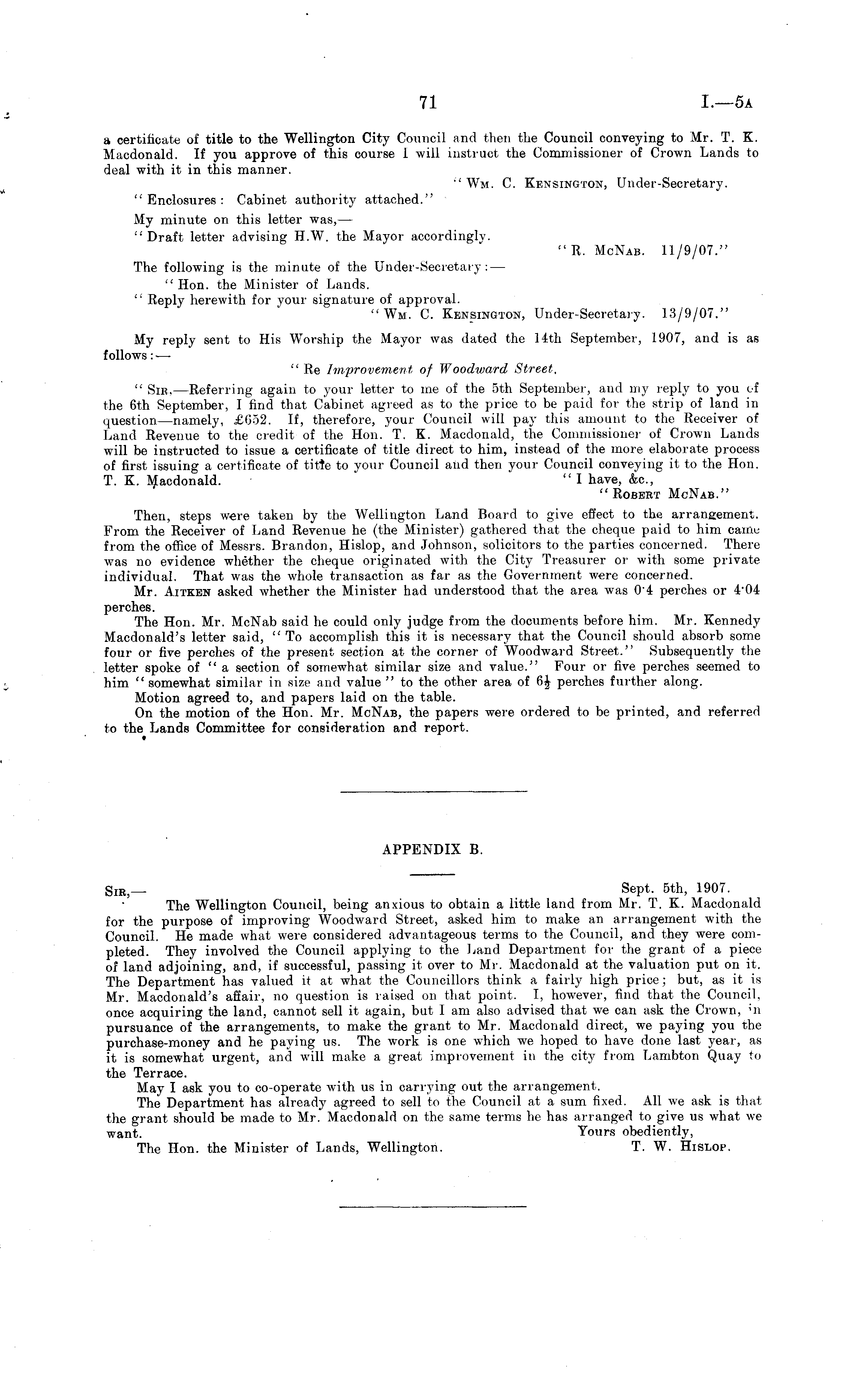 a certificate of title to the Wellington City Council and then the Council conveying to Mr. T. K. Macdonald. If you approve of this course 1 will instruct the Commissioner of Crown Lands to deal with it in this manner. " Wm. C. Kensington, Under-Secretary. " Enclosures : Cabinet authority attached." My minute on this letter was, — " Draft letter advising H.W. the Mayor accordingly. "R. McNab. 11/9/07." The following is the minute of the Under-Secretary: — " Hon. the Minister of Lands. " Reply herewith for your signature of approval. " Wm. C. Kensington, Under-Secretary. 13/9/07." My reply sent to His Worship the Mayor was dated the 14th September, 1907, and is as follows : — " Re Improvement of Woodward Street. " Sir.—Referring again to your letter to me of the sth September, and my reply to you of the 6th September, I find that Cabinet agreed as to the price to be paid for the strip of land in question—namely, £652. If, therefore, your Council will pay this amount to the Receiver of Land Revenue to the credit of the Hon. T. K. Macdonald, the Commissioner of Crown Lands xvill be instructed to issue a certificate of title direct to him, instead of the more elaborate process of first issuing a certificate of titte to your Council and then your Council conveying it to the Hon. T. K. Macdonald. " I have, &c, " Robert McNab." Then, steps were taken by the Wellington Land Board to give effect to the arrangement. From the Receiver of Land Revenue he (the Minister) gathered that the cheque paid to him came from the office of Messrs. Brandon, Hislop, and Johnson, solicitors to the parties concerned. There xvas no evidence whether the cheque originated xvith the City Treasurer or with some private individual. That was the xvhole transaction as far as the Government were concerned. Mr. Aitken asked whether the Minister had understood that the area was o'4 perches or 404 perches. The Hon. Mr. McNab said he could only judge from the documents before him. Mr. Kennedy Macdonald's letter said, " To accomplish this it is necessary that the Council should absorb some four or five perches of the present section at the corner of Woodxvard Street." Subsequently the letter spoke of "a section of somewhat similar size and value." Four or five perches seemed to him "somewhat similar in size and value " to the other area of 6J perches further along. Motion agreed to, and papers laid on the table. On the motion of the Hon. Mr. McNab, the papers were ordered to be printed, and referred to the Lands Committee for consideration and report.