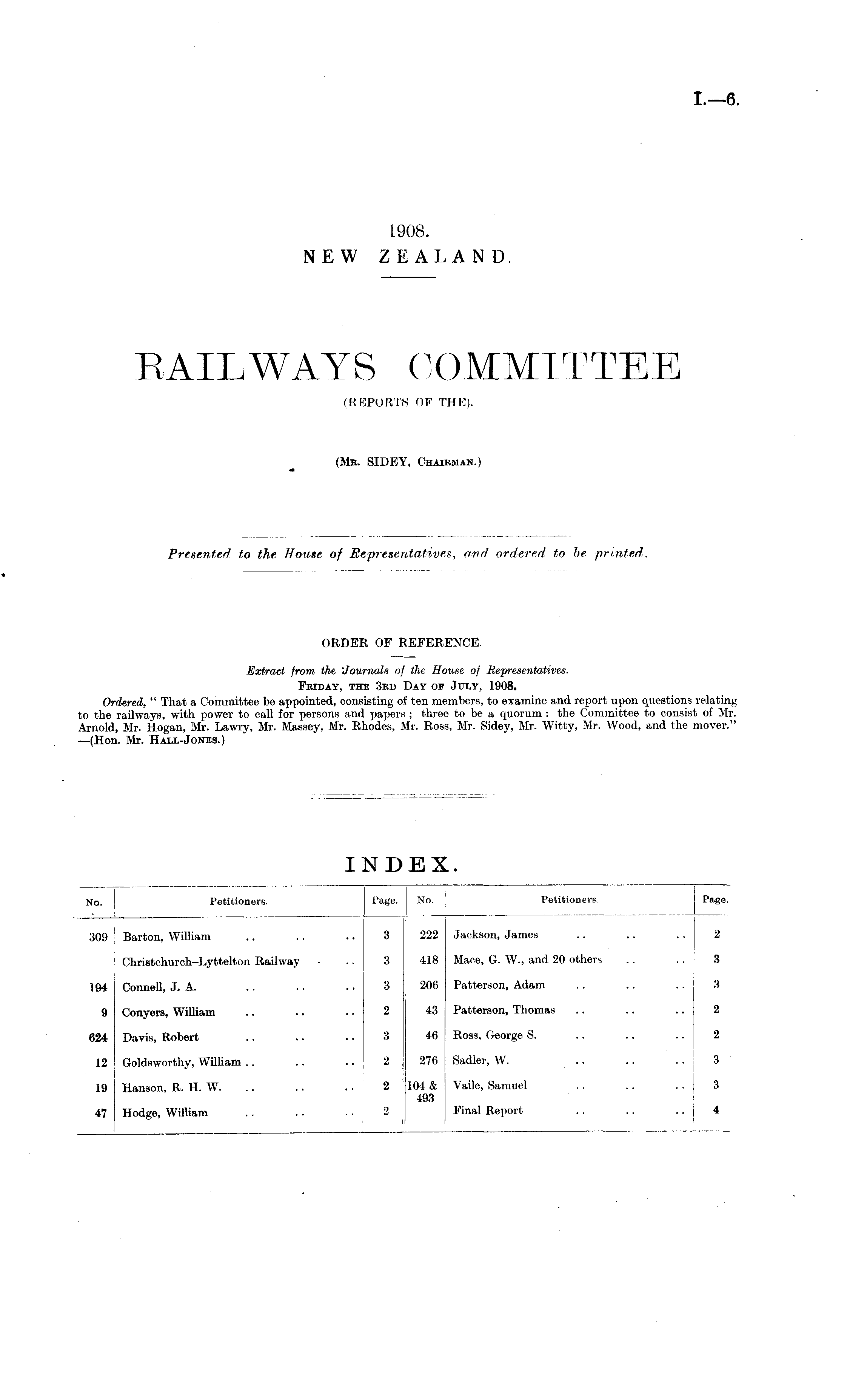 ORDER OF REFERENCE. Extract from the Journals of the House of Representatives. Friday, the 3rd Day of July, 1908. Ordered, " That a Committee be appointed, consisting of ten members, to examine and report upon questions relating to the railways, with power to call for persons and papers ; three to be a quorum : the Committee to consist of Mr. Arnold, Mr. Hogan, Mr. Lawry, Mr. Massey, Mr. Rhodes, Mr. Ross, Mr. Sidey, Mr. Witty, Mr. Wood, and the mover." —(Hon. Mr. Hall-Jones.)