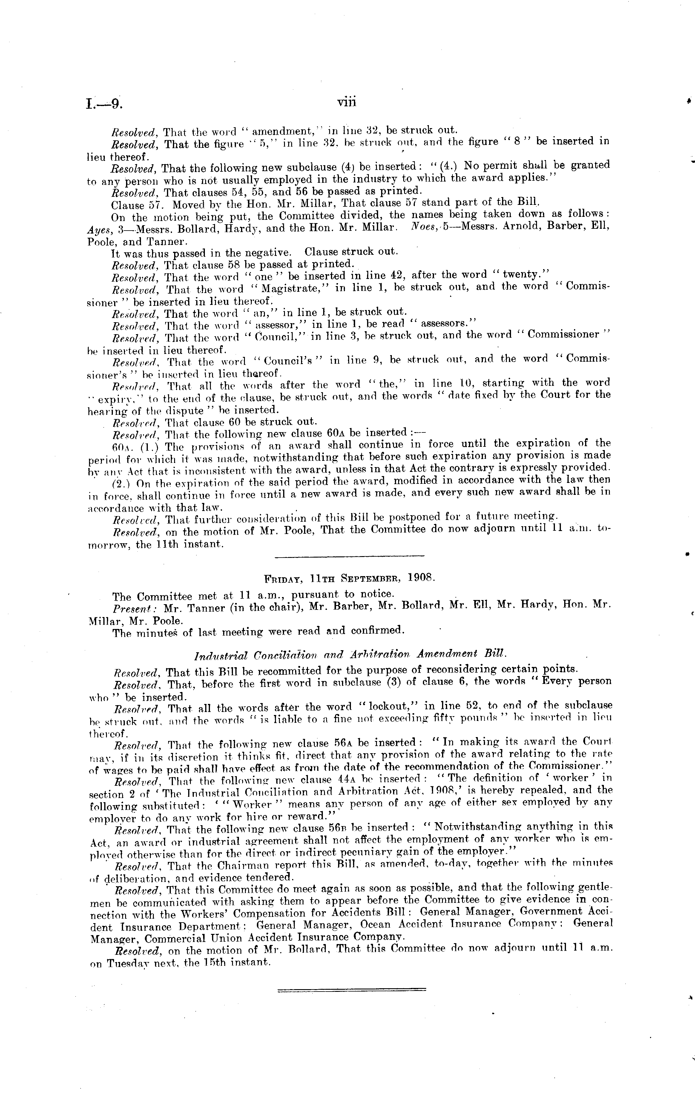 Resolved. That the word " amendment," in line 32, be struck out. Resolved, That the figure "5," in line 32. be struck out, and the figure " 8 " be inserted in lieu thereof. , Resolved, That the following new subclause (4) be inserted: " (4.) No permit shall be granted to any person who is not usually employed in the industry to xvhich the award applies." Resolved, That clauses 54, 55, and 56 be passed as printed. Clause 57. Moved by the Hon. Mr. Millar, That clause 57 stand part of the Bill. On the motion being put, the Committee divided, the names being taken down as follows : Ayes, 3—Messrs. Bollard, Hardy, and the Hon. Mr. Millar. Noes, -5 —Messrs. Arnold, Barber, Ell, Poole, and Tanner. It was thus passed in the negative. Clause struck out. Resolved, That clause 58 be passed at printed. Resolved, That the word " one " be inserted in line 42, after the word " twenty." Resolved, That the word "Magistrate," in line 1, be struck out, and the xvord "Commissioner " be inserted in lieu thereof. Resolved, That the xvord " an," in line 1, be struck out. Resolved, That the word " assessor," in line 1, be read " assessors." Resolved, That the word "Council," in line 3, be struck out, and the word "Commissioner be inserted in lieu thereof. Resolved, That the word "Council's" in line 9. be struck out, and the word Commissioner's " be inserted in lieu thereof. _ Resolved, That all tin- words after the word "the," in line 10, starting with the word " expiry," to the end of the clause, be struck out, and the words " date fixed by the, Court for the hearing' of the dispute " be inserted. Resolved, That clause 60 be struck out. Resolved, That the following new clause 60a be inserted :— 60a (I ) The provisions of an award shall continue in force until the expiration of the period for which it was made, notwithstanding that before such expiration any provision is made |, V an; , Act that is inconsistent with the award, unless in that Act the contrary is expressly provided. (2.) On the expiration of the said period the award, modified in accordance with the law then in force, shall continue in force until a new award is made, and every such new award shall be, in accordance xvith that law. Resolved, That further consideration of this Bill be postponed for a future meeting. Resolved, on the motion of Mr. Poole, That the Committee do noxv adjourn until II a.m. to morrow, the 11th instant. Friday, 11th September, 1908. The Committee met at 11 a.m., pursuant to notice. Present: Mr. Tanner (in the chair), Mr. Barber, Mr. Bollard, Mr. Ell, Mr. Hardy, Hon. Mr. Millar, Mr. Poole. The minutes of last meeting xvere read and confirmed. Industrial Conciliation and Arbitration Amendment Bill. Resolved, That this Bill be recommitted for the purpose of reconsidering certain points. Resolved', That, before the first word in subclause (3) of clause 6, the words " Every person xvho " be inserted. , • Resolved, That all the xvords after the word " lockout," in line 52, to end of the subclause be struck out", and the words "is liable to a fine not exceeding fifty pounds" be inserted in lieu Resolved. That the following new clause 56a be inserted: "Tn making its award the Court may, if in its discretion it thinks fit. direct that any provision of the award relating to the rate of wages to be paid shall have effect as from the date of the recommendation of the Commissioner." Resolved. That the following new clause 44a be inserted: "The definition of 'worker' in section 2 of 'The Industrial Conciliation and Arbitration Act. 1908,' is hereby repealed, and the following substituted: ' "Worker" means any person of any ago of either sex emplox-ed by any employer to do any xvork for hire or reward." Resolved, That the following new clause 56p be inserted : " Notwithstanding anything in this Act. an award or industrial agreement shall not affect the employment of any xvorker xvho is empioved otherwise than for the direct or indirect pecuniary gain of the employer." ' Resolved. That the Chairman report this Bill, as amended, to-day, together with the minutes of deliberation, and evidence tendered. Resolved, That this Committee do meet again as soon as possible, and that the following gentle men be communicated xvith asking them to appear before the Committee to give evidence in con nection with the Workers' Compensation for Accidents Bill : General Manager, Government Accident Insurance Department ; General Manager, Ocean Accident Insurance Company : General Manager, Commercial Union Accident Insurance Company. Resolved, on the motion of Mr. Bollard, That this Committee do noxv adjourn until 11 am on Tuesday next, the 15th instant.