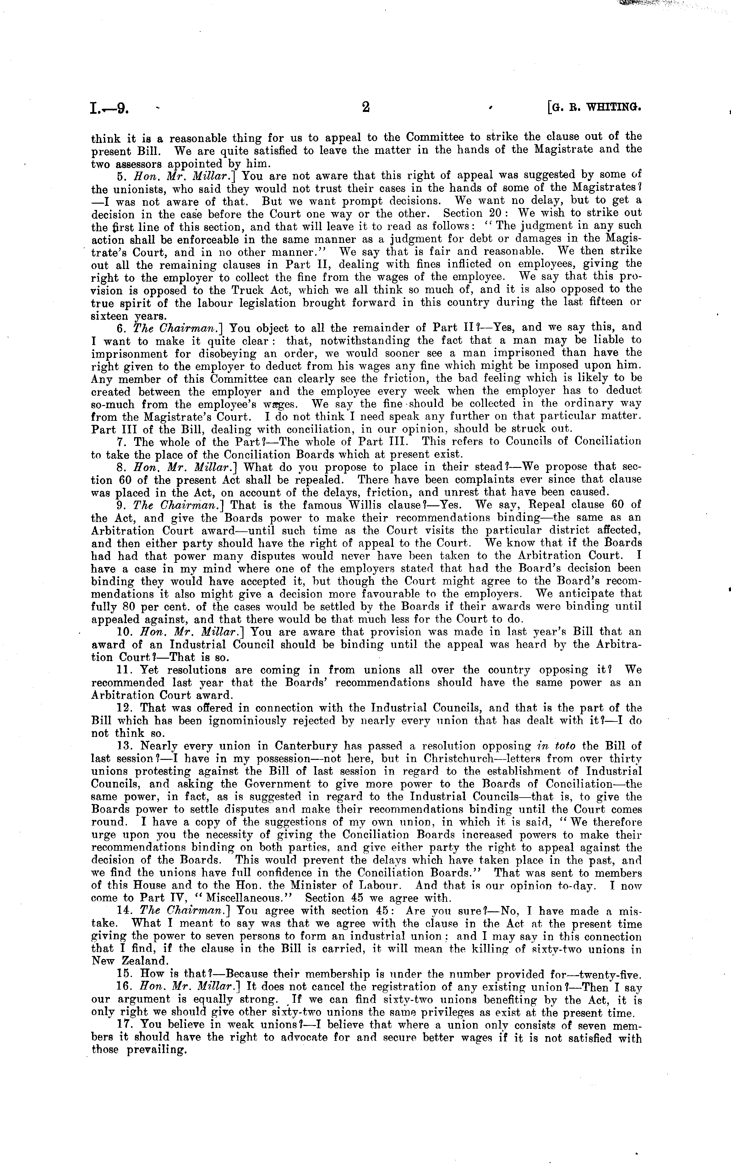 think it is a reasonable thing for us to appeal to the Committee to strike the clause out of the present Bill. We are quite satisfied to leave the matter in the hands of the Magistrate and the two assessors appointed by him. 5. Hon. Mr. Millar.] You are not aware that this right of appeal was suggested by some of the unionists, who said they xvould not trust their cases in the hands of some of the Magistrates? —I was not aware of that. But we want prompt decisions. We want no delay, but to get a decision in the case before the Court one way or the other. Section 20 :We wish to strike out the first line of this section, and that will leave it to read as follows: " The judgment in any such action shall be enforceable in the same manner as a judgment for debt or damages in the Magistrate's Court, and in no other manner." We say that is fair and reasonable. We then strike out all the remaining clauses in Part 11, dealing with fines inflicted on employees, giving the right to the employer to collect the fine from the wages of the employee. We say that this provision is opposed to the Truck Act, xxhich we all think so much of, and it is also opposed to the true spirit of the labour legislation brought forward in this country during the last fifteen or sixteen years. 6. The Chairman.] You object to all the remainder of Part ll?—Yes, and we say this, and I want to make it quite clear : that, notwithstanding the fact that a man may be liable to imprisonment for disobeying an order, xve xvould sooner see a man imprisoned than have the right given to the employer to deduct from his wages any fine xvhich might be imposed upon him. Any member of this Committee can clearly see the friction, the bad feeling which is likely to be created between the employer and the employee every week when the employer has to deduct so-much from the employee's xvsfges. We say the fine should be collected in the ordinary way from the Magistrate's Court. Ido not think I need speak any further on that particular matter. Part 111 of the Bill, dealing with conciliation, in our opinion, should be struck out. 7. The whole of the Part? —The whole of Part 111. This refers to Councils of Conciliation to take the place of the Conciliation Boards which at present exist. 8. Hon. Mr. Millar.] What do you propose to place in their stead? —We propose that section 60 of the present Act shall be repealed. There have been complaints ever since that clause was placed in the Act, on account of the delays, friction, and unrest that have been caused. 9. The Chairman.] That is the famous Willis clause?— Yes. We say, Repeal clause 60 of the Act, and give the Boards power to make their recommendations binding—the same as an Arbitration Court axvard —until such time as the Court visits the particular district affected, and then either party should have the right of appeal to the Court. We know that if the Boards had had that power many disputes would never have been taken to the Arbitration Court. I have a case in my mind where one of the employers stated that had the Board's decision been binding they would have accepted it, but though the Court might agree to the Board's recommendations it also might give a decision more favourable to the employers. We anticipate that fully 80 per cent, of the cases would be settled by the Boards if their awards were binding until appealed against, and that there would be that much less for the Court to do. 10. Hon. Mr. Millar.] You are axvare that provision was made in last year's Bill that an award of an Industrial Council should be binding until the appeal was heard by the Arbitration Court?— That is so. 11. Yet resolutions are coming in from unions all over the county opposing it? We recommended last year that the Boards' recommendations should have the same power as an Arbitration Court award. 12. That xvas offered in connection with the Industrial Councils, and that is the part of the Bill xxhich has been ignominiously rejected by nearly every union that has dealt xvith it?—l do not think so. 13. Nearly every union in Canterbury has passed a resolution opposing in toto the Bill of last session ?—I have in my possession—not here, but in Christchurch—letters from over thirty unions protesting against the Bill of last session in regard to the establishment of Industrial Councils, and asking the Government to give more power to the Boards of Conciliation —the same power, in fact, as is suggested in regard to the Industrial Councils—that is, to give the Boards power to settle disputes and make their recommendations binding until the Court comes round. I have a copy of the suggestions of my own union, in which it is said, "We therefore urge upon you the necessity of giving the Conciliation Boards increased powers to make their recommendations binding on both parties, and give either party the right to appeal against the decision of the Boards. This xvould prevent the delays which have taken place in the past, and w r e find the unions have full confidence in the Conciliation Boards." That was sent to members of this House and to the Hon. the Minister of Labour. And that is our opinion to-day. I now come to Part IV, "Miscellaneous." Section 45 we agree with. 14. The Chairman.] You agree with section 45: Are you sure? —No, I have made a mistake. What I meant to say was that we agree with the clause in the Act at the present time giving the power to seven persons to form an industrial union : and I may say in this connection that I find, if the clause in the Bill is carried, it will mean the killing of sixty-two unions in New Zealand. 15. How is that?— Because their membership is under the number provided for—twenty-five. 16. Hon. Mr. Millar!] It does not cancel the registration of any existing union?— Then I say our argument is equally strong. If we can find sixty-two unions benefiting by the Act, it is only right we should give other sixty-two unions the same privileges as ex