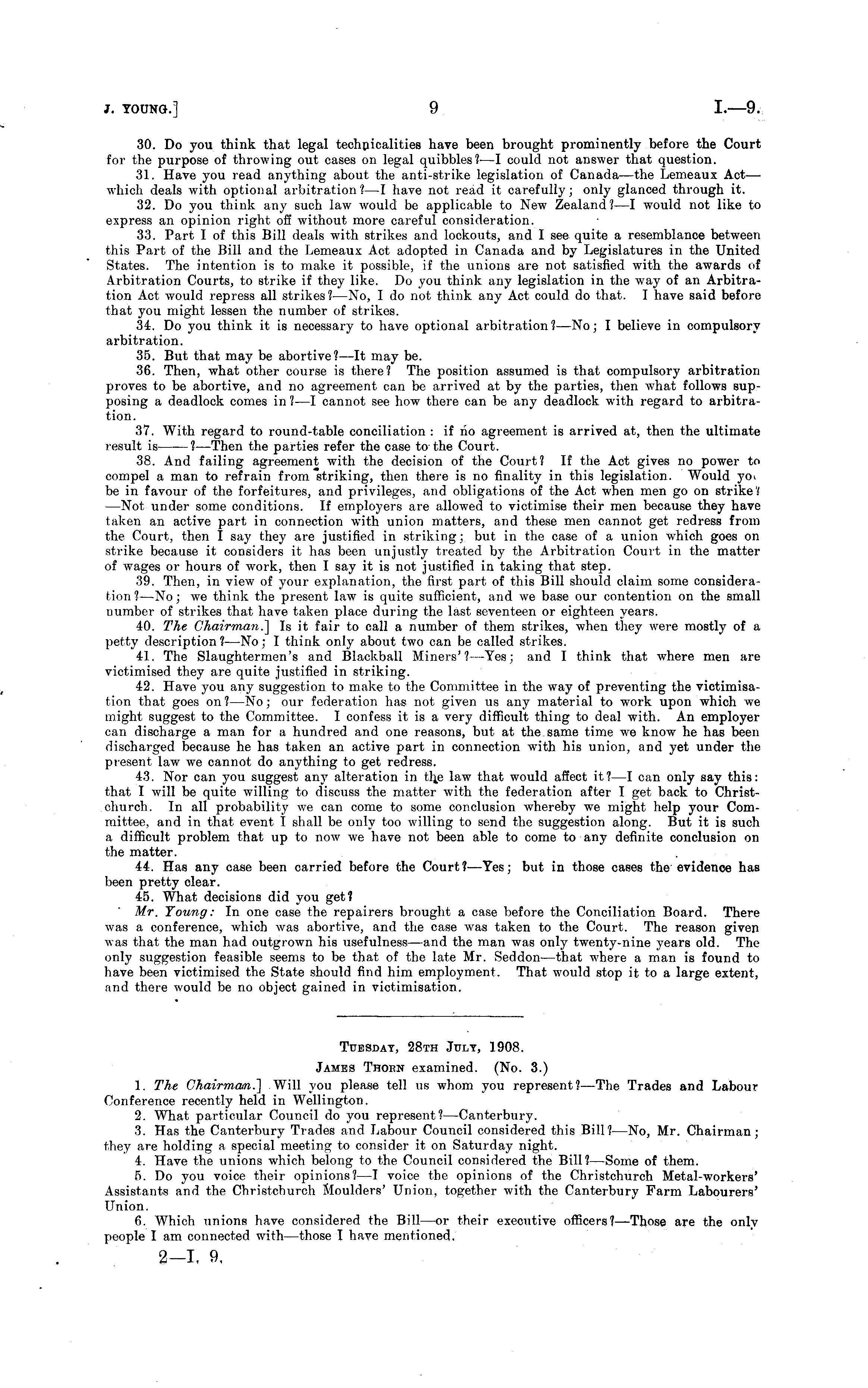 30. Do you think that legal technicalities have been brought prominently before the Court for the purpose of throwing out cases on legal quibbles? —I could not answer that question. 31. Have you read anything about the anti-strike legislation of Canada—the Lemeaux Act — xxhich deals xvith optional arbitration? —I have not read it carefully; only glanced through it. 32. Do you think any such law xvould be applicable to New Zealand?—l would not like to express an opinion right off without more careful consideration. 33. Part I of this Bill deals with strikes and lockouts, and I see quite a resemblance between this Part of the Bill and the Lemeaux Act adopted in Canada and by Legislatures in the United States. The intention is to make it possible, if the unions are not satisfied xvith the axvards of Arbitration Courts, to strike if they like. Do you think any legislation in the way of an Arbitration Act would repress all strikes ?—No, Ido not think any Act could do that. I have said before that you might lessen the number of strikes. 34. Do you think it is necessary to have optional arbitration ? —No; I believe in compulsory arbitration. 35. But that may be abortive? —It may be. 36. Then, what other course is there? The position assumed is that compulsory arbitration proves to be abortive, and no agreement can be arrived at by the parties, then xvhat follows supposing a deadlock comes in ?—I cannot see how there can be any deadlock with regard to arbitration. 37. With regard to round-table conciliation : if ho agreement is arrived at, then the ultimate result is ? —Then the parties refer the case to the Court. 38. And failing agreement xvith the decision of the Court? If the Act gives no power to compel a man to refrain from striking, then there is no finality in this legislation. Would yo* be in favour of the forfeitures, and privileges, and obligations of the Act when men go on strike? —Not under some conditions. If employers are alloxved to victimise their men because they have taken an active part in connection xvith union matters, and these men cannot get redress from the Court, then I say they are justified in striking; but in the case of a union which goes on strike because it considers it has been unjustly treated by the Arbitration Court in the matter of xvages or hours of work, then I say it is not justified in taking that step. 39. Then, in view of your explanation, the first part of this Bill should claim some consideration ?—No; xve think the present law is quite sufficient, and xve base our contention on the small number of strikes that have taken place during the last seventeen or eighteen years. 40. The Chairman.] Is it fair to call a number of them strikes, when they xx'ere mostly of a petty description?—No; I think only about two can be called strikes. 41. The Slaughtermen's and Blackball Miners'? —Yes; and I think that xvhere men are victimised they are quite justified in striking. 42. Have you any suggestion to make to the Committee in the way of preventing the victimisation that goes on ?—No; our federation has not given us any material to work upon which we might suggest to the Committee. I confess it is a very difficult thing to deal with. An employer can discharge a man for a hundred and one reasons, but at the same time we know he has been discharged because he has taken an active part in connection xvith his union, and yet under the present law we cannot do anything to get redress. 43. Nor can you suggest any alteration in the law that would affect it?—l can only say this: that I will be quite willing to discuss the matter with the federation after I get back to Christchurch. In all probability we can come to some conclusion whereby we might help your Committee, and in that event I shall be only too xvilling to send the suggestion along. But it is such a difficult problem that up to noxv we have not been able to come to any definite conclusion on the matter. 44. Has any case been carried before the Court?— Yes; but in those cases the evidence has been pretty clear. 45. What decisions did you get? Mr. Young: In one case the repairers brought a case before the Conciliation Board. There xvas a conference, which xvas abortive, and the case xvas taken to the Court. The reason given was that the man had outgroxvn his usefulness—and the man xvas only twenty-nine years old. The only suggestion feasible seems to be that of the late Mr. Seddon —that xx'here a man is found to have been victimised the State should find him employment. That would stop it to a large extent, and there would be no object gained in victimisation. Tuesday, 28th July, 1908. James Thorn examined. (No. 3.) 1. The Chairman.] Will you please tell us whom you represent?— The Trades and Labour Conference recently held in Wellington. 2. What particular Council do you represent?— Canterbury. 3. Has the Canterbury Trades and Labour Council considered this Bill?—No, Mr. Chairman; they are holding a special meeting to consider it on Saturday night. 4. Have the unions which belong to the Council considered the Bill?— Some of them. 5. Do you voice their opinions?—l voice the opinions of the Christchurch Metal-workers' Assistants and the Christchurch Moulders' Union, together xvith the Canterbury Farm Labourers' Union. 6. Which unions have considered the Bill—or their executive officers?— Those are the only people I am connected with—those I have mentioned.