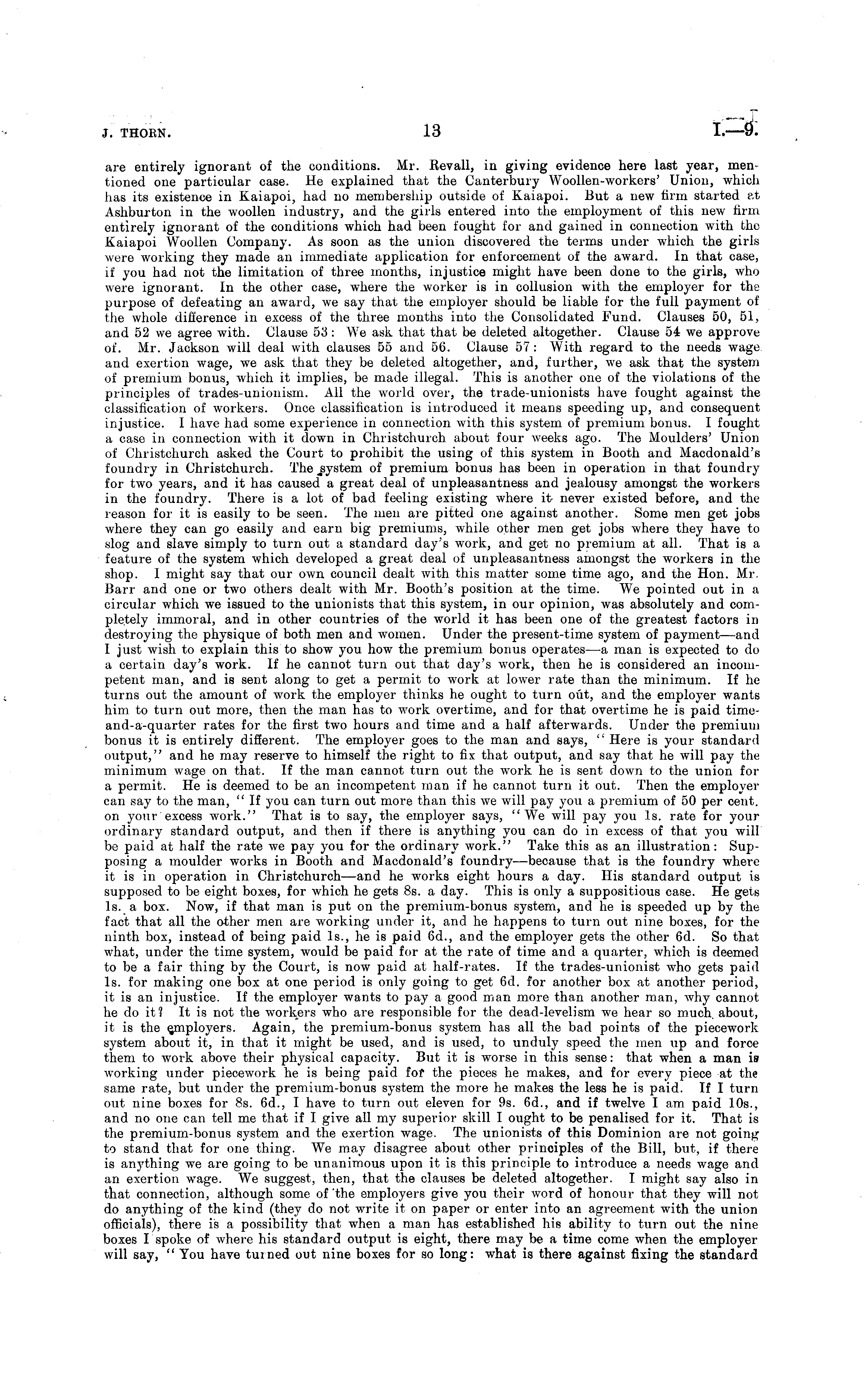 are entirely ignorant of the conditions. Mr. Revall, in giving evidence here last year, mentioned one particular case. He explained that the Canterbury Woollen-workers' Union, which has its existence in Kaiapoi, had no membership outside of Kaiapoi. But a new firm started e.t Ashburton in the woollen industry, and the girls entered into the employment of this new firm entirely ignorant of the conditions which had been fought for and gained in connection with the Kaiapoi Woollen Company. As soon as the union discovered the terms under which the girls were working they made an immediate application for enforcement of the award. In that case, if you had not the limitation of three months, injustice might have been done to the girls, who were ignorant. In the other case, where the worker is in collusion with the employer for the purpose of defeating an award, we say that the employer should be liable for the full payment of the whole difference in excess of the three months into the Consolidated Fund. Clauses 50, 51, and 52 we agree with. Clause 53 :We ask that that be deleted altogether. Clause 54 we approve of. Mr. Jackson will deal with clauses 55 and 56. Clause 57 : With regard to the needs wage and exertion wage, we ask that they be deleted altogether, and, further, we ask that the system of premium bonus, which it implies, be made illegal. This is another one of the violations of the principles of trades-unionism. All the world over, the trade-unionists have fought against the classification of workers. Once classification is introduced it means speeding up, and consequent injustice. I have had some experience in connection with this system of premium bonus. I fought a case in connection with it down in Christchurch about four weeks ago. The Moulders' Union of Christchurch asked the Court to prohibit the using of this system in Booth and Macdonald's foundry in Christchurch. The of premium bonus has been in operation in that foundry for two years, and it has caused a great deal of unpleasantness and jealousy amongst the workers in the foundry. There is a lot of bad feeling existing where it never existed before, and the reason for it is easily to be seen. The men are pitted one against another. Some men get jobs where they can go easily and earn big premiums, while other men get jobs where they have to slog and slave simply to turn out a standard day's work, and get no premium at all. That is a feature of the system which developed a great deal of unpleasantness amongst the workers in the shop. I might say that our own council dealt with this matter some time ago, and the Hon. Mr. Barr and one or two others dealt with Mr. Booth's position at the time. We pointed out in a circular which we issued to the unionists that this system, in our opinion, was absolutely and completely immoral, and in other countries of the world it has been one of the greatest factors in destroying the physique of both men and women. Under the present-time system of payment—and I just wish to explain this to show you how the premium bonus operates—a man is expected to do a certain day's work. If he cannot turn out that day's work, then he is considered an incompetent man, and is sent along to get a permit to work at lower rate than the minimum. If he turns out the amount of work the employer thinks he ought to turn out, and the employer wants him to turn out more, then the man has to work overtime, and for that overtime he is paid time-and-a-quarter rates for the first two hours and time and a half afterwards. Under the premium bonus it is entirely different. The employer goes to the man and says, " Here is your standard output," and he may reserve to himself the right to fix that output, and say that he will pay the minimum wage on that. If the man cannot turn out the work he is sent down to the union for a permit. He is deemed to be an incompetent man if he cannot turn it out. Then the employer can say to the man, " If you can turn out more than this we will pay you a premium of 50 per cent, on your excess work." That is to say, the employer says, "We will pay you Is. rate for your ordinary standard output, and then if there is anything you can do in excess of that you will be paid at half the rate we pay you for the ordinary work." Take this as an illustration: Supposing a moulder works in Booth and Macdonald's foundry—because that is the foundry where it is in operation in Christchurch —and he works eight hours a day. His standard output is supposed to be eight boxes, for which he gets Bs. a day. This is only a suppositious case. He gets Is. a box. Now, if that man is put on the premium-bonus system, and he is speeded up by the fact that all the other men are working under it, and he happens to turn out nine boxes, for the ninth box, instead of being paid Is., he is paid 6d., and the employer gets the other 6d. So that what, under the time system, would be paid for at the rate of time and a quarter, which is deemed to be a fair thing by the Court, is now paid at half-rates. If the trades-unionist who gets paid Is. for making one box at one period is only going to get 6d. for another box at another period, it is an injustice. If the employer wants to pay a good man more than another man, why cannot he do it? It is not the workers who are responsible for the dead-levelism we hear so much, about, it is the employers. Again, the premium-bonus system has all the bad points of the piecework system about it, in that it might be used, and is used, to unduly speed the men up and force them to work above their physical capacity. But it is worse in this sense: that when a man is working under piecework he is being paid fof the pieces he makes, and for every piece at the same rate, but under the premium-bonus system the more he makes the less he is paid. If I turn out nine boxes for Bs. 6d., I have to turn out eleven for 9s. 6d., and if twelve I am paid 10s., and no one can tell me that if I give all my superior 
