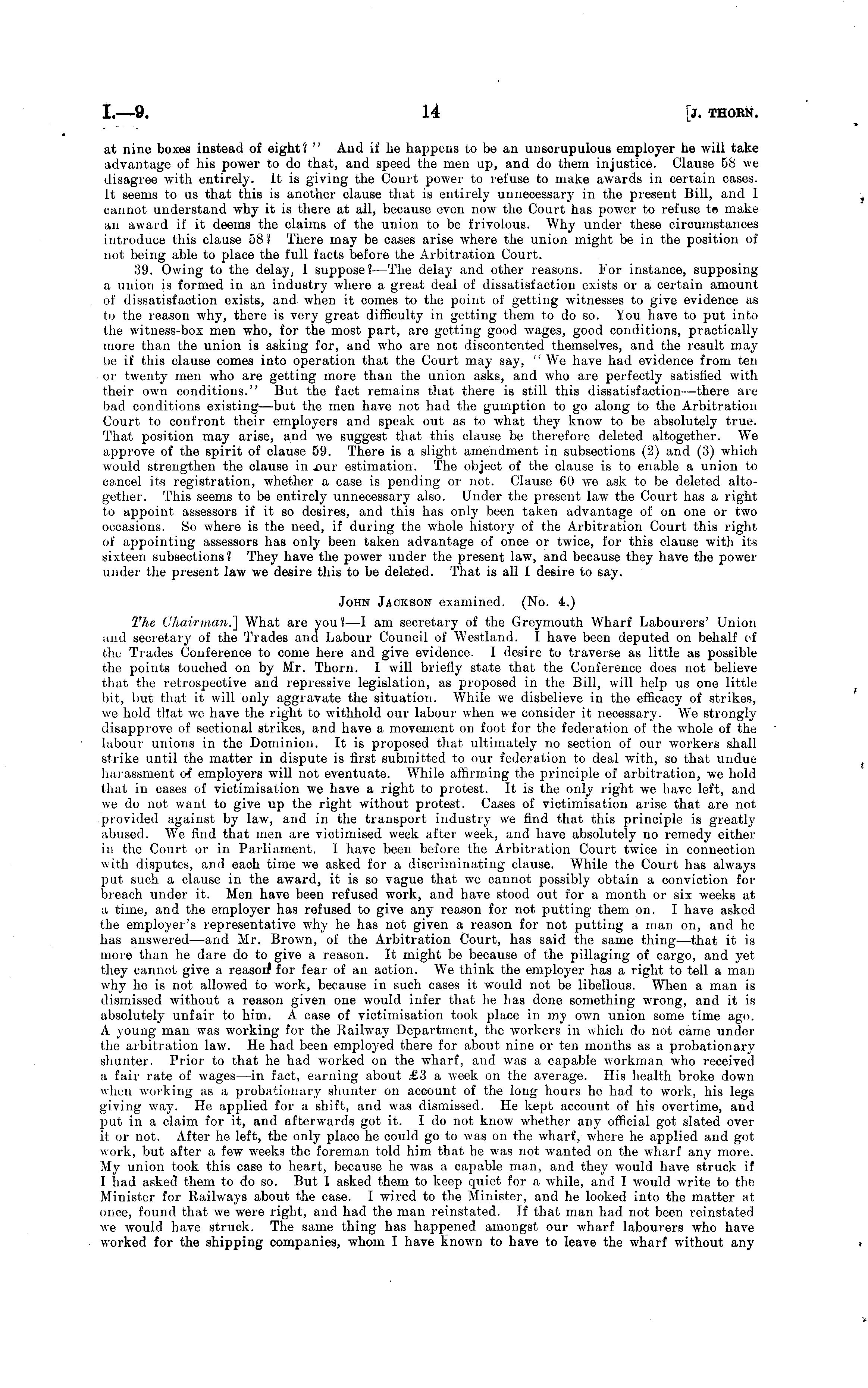 at nine boxes instead of eight? " And if he happens to be an unscrupulous employer he will take advantage of his power to do that, and speed the men up, and do them injustice. Clause 58 we disagree xvith entirely. It is giving the Court power to refuse to make awards in certain cases. It seems to us that this is another clause that is entirely unnecessary in the present Bill, and 1 cannot understand why it is there at all, because now the Court has power to refuse to make an award if it deems the claims of the union to be frivolous. Why under these circumstances introduce this clause 58? There may be cases arise xvhere the union might be in the position of not being able to place the full facts before the Arbitration Court. 39. Oxving to the delay, I suppose?— The delay and other reasons. For instance, supposing a union is formed in an industry where a great deal of dissatisfaction exists or a certain amount of dissatisfaction exists, and when it comes to the point of getting xvitnesses to give evidence as to the reason why, there is very great difficulty in getting them to do so. You have to put into the witness-box men who, for the most part, are getting good xvages, good conditions, practically more than the union is asking for, and who are not discontented themselves, and the result may tie if this clause comes into operation that the Court may say, " We have had evidence from ten or twenty men who are getting more than the union asks, and xvho are perfectly satisfied xvith their own conditions." But the fact remains that there is still this dissatisfaction—there are bad conditions existing—but the men have not had the gumption to go along to the Arbitration Court to confront their employers and speak out as to xvhat they knoxv to be absolutely true. That position may arise, and we suggest that this clause be therefore deleted altogether. We approve of the spirit of clause 59. There is a slight amendment in subsections (2) and (3) which would strengthen the clause in .our estimation. The object of the clause is to enable a union to cancel its registration, whether a case is pending or not. Clause 60 we ask to be deleted altogether. This seems to be entirely unnecessary also. Under the present law the Court has a right to appoint assessors if it so desires, and this has only been taken advantage of on one or two occasions. So where is the need, if during the xxhole history of the Arbitration Court this right of appointing assessors has only been taken advantage of once or twice, for this clause with its sixteen subsections? They have the power under the present law, and because they have the power under the present law we desire this to be deleted. That is all I desire to say. John Jackson examined. (No. 4.) The Chairman.] What are you ?—I am secretary of the Greymouth Wharf Labourers' Union and secretary of the Trades and Labour Council of Westland. I have been deputed on behalf of the Trades Conference to come here and give evidence. I desire to traverse as little as possible the points touched on by Mr. Thorn. I xvill briefly state that the Conference does not believe that the retrospective and repressive legislation, as proposed in the Bill, xvill help us one little bit, but that it will only aggravate the situation. While we disbelieve in the efficacy of strikes, we hold that xve have the right to xvithhold our labour when we consider it necessary. We strongly disapprove of sectional strikes, and have a movement on foot for the federation of the whole of the labour unions in the Dominion. It is proposed that ultimately no section of our workers shall strike until the matter in dispute is first submitted to our federation to deal xvith, so that undue harassment of employers xvill not eventuate. While affirming the principle of arbitration, we hold that in cases of victimisation we have a right to protest. It is the only right we have left, and we do not want to give up the right without protest. Cases of victimisation arise that are not provided against by law, and in the transport industry xve find that this principle is greatly abused. We find that men are victimised week after week, and have absolutely no remedy either in the Court or in Parliament. I have been before the Arbitration Court twice in connection with disputes, and each time we asked for a discriminating clause. While the Court has always put such a clause in the award, it is so vague that we cannot possibly obtain a conviction for breach under it. Men have been refused xvork, and have stood out for a month or six weeks at a time, and the employer has refused to give any reason for not putting them on. I have asked the employer's representative why he has not given a reason for not putting a man on, and he has answered —and Mr. Brown, of the Arbitration Court, has said the same thing—that it is more than he dare do to give a reason. It might be because of the pillaging of cargo, and yet they cannot give a reason? for fear of an action. We think the employer has a right to tell a man why he is not alloxved to work, because in such cases it would not be libellous. When a man is dismissed without a reason given one would infer that he has done something wrong, and it is absolutely unfair to him. A case of victimisation took place in my own union some time ago. A young man xvas working for the Railway Department, the xvorkers in xvhich do not came under the arbitration law. He had been employed there for about nine or ten months as a probationary shunter. Prior to that he had xvorked on the xvharf, and xvas a capable xvorkman who received a fair rate of wages —in fact, earning about £3 a xveek on the average. His health broke down when working as a probationary shunter on account of the long hours he had to work, his legs giving way. He applied for a shift, and xvas dismissed. He kept account of his overtime, and put in a claim for it, and afterxvards got it. I do not know whether any official got slated