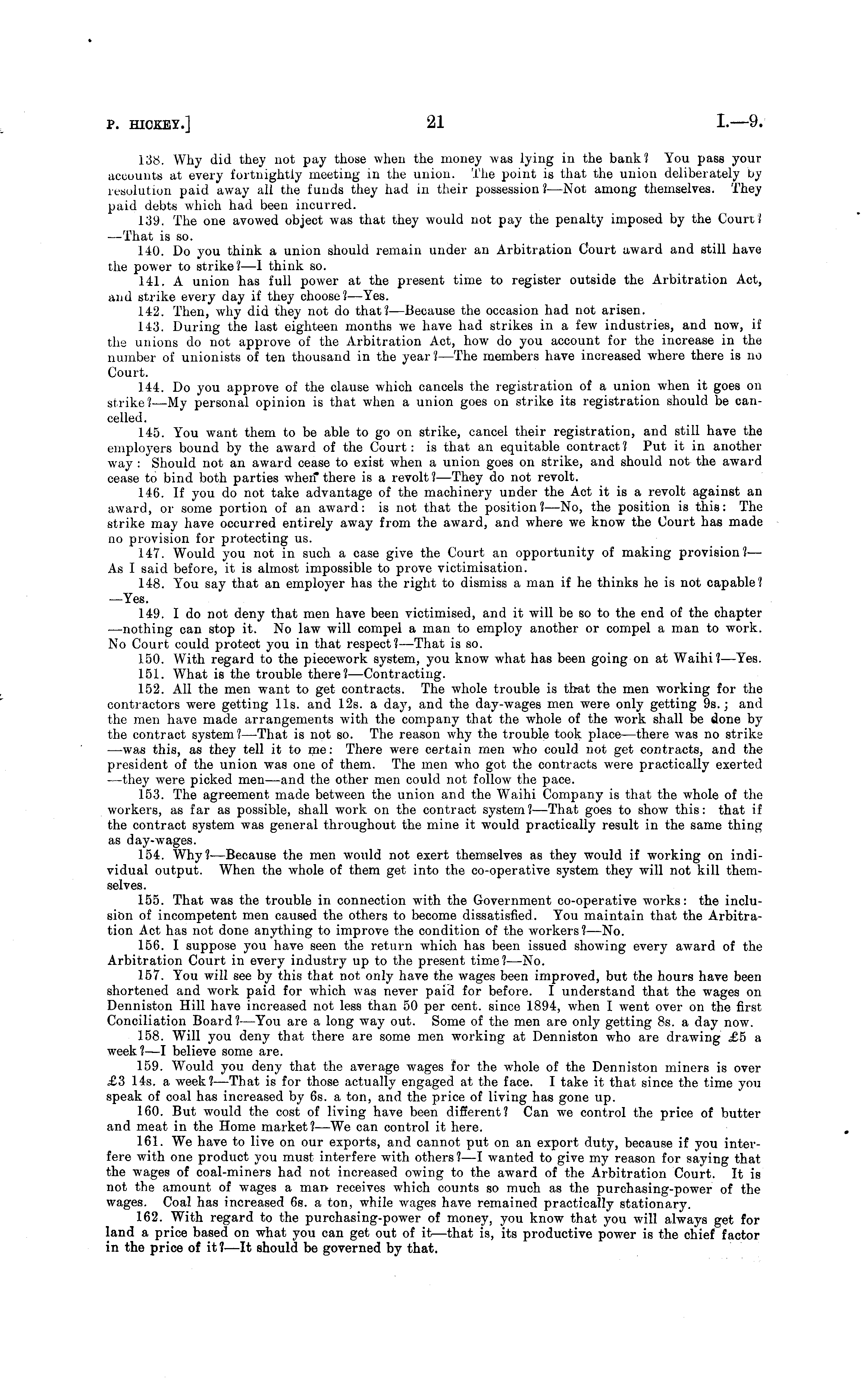 138. Why did they not pay those when the money was lying in the bank? You pass your accounts at every fortnightly meeting in the union. The point is that the union deliberately by resolution paid away all the funds they had in their possession? —Not among themselves. They paid debts xvhich had been incurred. 139. The one avowed object was that they would not pay the penalty imposed by the Court! —That is so. 140. Do you think a union should remain under an Arbitration Court award and still have the power to strike? —I think so. 141. A union has full power at the present time to register outside the Arbitration Act, and strike every day if they choose? —Yes. 142. Then, xvhy did they not do that? —Because the occasion had not arisen. 143. During the last eighteen months we have had strikes in a few industries, and now, if the unions do not approve of the Arbitration Act, how do you account for the increase in the number of unionists of ten thousand in the year? —The members have increased where there is no Court. 144. Do you approve of the clause which cancels the registration of a union when it goes on strike? —My personal opinion is that when a union goes on strike its registration should be cancelled. 145. You want them to be able to go on strike, cancel their registration, and still have the employers bound by the axvard of the Court: is that an equitable contract ? Put it in another way : Should not an award cease to exist when a union goes on strike, and should not the award cease to bind both parties when there is a revolt?— They do not revolt. 146. If you do not take advantage of the machinery under the Act it is a revolt against an axvard, or some portion of an award: is not that the position ?—No, the position is this: The strike may have occurred entirely away from the axvard, and where we know the Court has made no provision for protecting us. 147. Would you not in such a case give the Court an opportunity of making provision?— As I said before, it is almost impossible to prove victimisation. 148. You say that an employer has the right to dismiss a man if he thinks he is not capable? —Yes. 149. I do not deny that men have been victimised, and it will be so to the end of the chapter —nothing can stop it. No law will compel a man to employ another or compel a man to work. No Court could protect you in that respect?— That is so. 150. With regard to the piecexvork system, you know what has been going on at Waihi?—Yes. 151. What is the trouble there?— Contracting. 152. All the men want to get contracts. The whole trouble is that the men working for the contractors were getting lis. and 12s. a day, and the day-wages men were only getting 95.; and the men have made arrangements with the company that the whole of the work shall be done by the contract system?— That is not so. The reason why the trouble took place—there was no strike —was this, as they tell it to me: There were certain men who could not get contracts, and the president of the union was one of them. The men who got the contracts were practically exerted —they were picked men —and the other men could not follow the pace. 153. The agreement made between the union and the Waihi Company is that the whole of the workers, as far as possible, shall work on the contract system?— That goes to show this: that if the contract system was general throughout the mine it would practically result in the same thing as day-wages. 154. Why?— Because the men would not exert themselves as they would if working on individual output. When the xvhole of them get into the co-operative system they will not kill themselves. 155. That was the trouble in connection with the Government co-operative xvorks: the inclusion of incompetent men caused the others to become dissatisfied. You maintain that the Arbitration Act has not done anything to improve the condition of the workers?— No. 156. I suppose you have seen the return xvhich has been issued showing every award of the Arbitration Court in every industry up to the present time?— No. 157. You will see by this that not only have the wages been improved, but the hours have been shortened and work paid for which xvas never paid for before. I understand that the wages on Denniston Hill have increased not less than 50 per cent, since 1894, when I went over on the first Conciliation Board?— You are a long xvay out. Some of the men are only getting Bs. a day noxv. 158. Will you deny that there are some men working at Denniston who are drawing £5 a week? —I believe some are. 159. Would you deny that the average wages for the whole of the Denniston miners is over £3 14s. a week? —That is for those actually engaged at the face. I take it that since the time you speak of coal has increased by 6s. a ton, and the price of living has gone up. 160. But would the cost of living have been different? Can we control the price of butter and meat in the Home market? —We can control it here. 161. We have to live on our exports, and cannot put on an export duty, because if you interfere with one product you must interfere with others ?—I wanted to give my reason for saying that the wages of coal-miners had not increased owing to the award of the Arbitration Court. It is not the amount of wages a man receives which counts so much as the purchasing-power of the wages. Coal has increased 6s. a ton, while wages have remained practically stationary. 162. With regard to the purchasing-power of money, you know that you will always get for land a price based on what you can get out of it—that is, its productive power is the chief factor in the price of it?—lt should be governed by that.