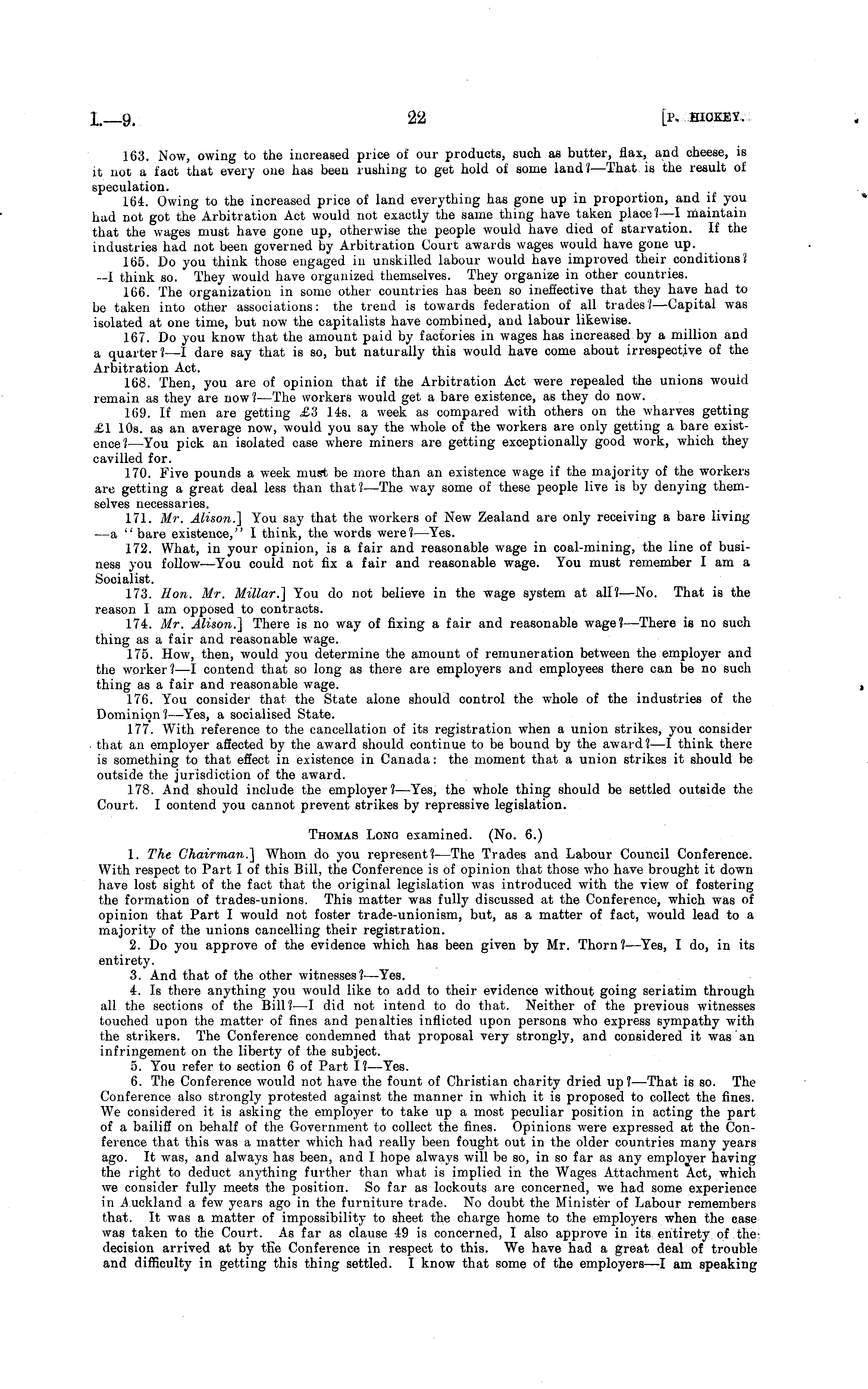 163. Now, owing to the increased price of our products, such as butter, flax, and cheese, is it not a fact that every one has been rushing to get hold of some land? —That is the result of speculation. 164. Owing to the increased price of land everything has gone up in proportion, and if you had not got the Arbitration Act would not exactly the same thing have taken place? —I maintain that the xvages must have gone up, otherwise the people would have died of starvation. If the industries had not been governed by Arbitration Court awards wages would have gone up. 165. Do you think those engaged in unskilled labour would have improved their conditions? —I think so. They would have organized themselves. They organize in other countries. 166. The organization in some other countries has been so ineffective that they have had to be taken into other associations: the trend is towards federation of all trades? —Capital was isolated at one time, but now the capitalists have combined, and labour likewise. 167. Do you know that the amount paid by factories in wages has increased by a million and a quarter? —I dare say that is so, but naturally this would have come about irrespective of the Arbitration Act. 168. Then, you are of opinion that if the Arbitration Act were repealed the unions wouid remain as they are now?— The xvorkers would get a bare existence, as they do noxv. 169. If men are getting £3 14s. a week as compared with others on the wharves getting £1 10s. as an average now, would you say the xvhole of the workers are only getting a bare existence?— You pick an isolated case where miners are getting exceptionally good work, which they cavilled for. 170. Five pounds a week must be more than an existence wage if the majority of the workers are getting a great deal less than that?— The way some of these people live is by denying themselves necessaries. 171. Mr. Alison.] You say that the xvorkers of New Zealand are only receiving a bare living —a '' bare existence,'' I think, the words were ?—Yes. 172. What, in your opinion, is a fair and reasonable xvage in coal-mining, the line of business you follow —You could not fix a fair and reasonable wage. You must remember I am a Socialist. 173. Hon. Mr. Millar.] You do not believe in the wage system at all? —No. That is the reason I am opposed to contracts. 174. Mr. Alison.] There is no way of fixing a fair and reasonable wage?— There is no such thing as a fair and reasonable wage. 175. How, then, would you determine the amount of remuneration between the employer and the worker I —l contend that so long as there are employers and employees there can be no such thing as a fair and reasonable wage. 176. You consider that the State alone should control the whole of the industries of the Dominion ?—Yes, a socialised State. 177. With reference to the cancellation of its registration when a union strikes, you consider that an employer affected by the award should continue to be bound by the award ?—I think there is something to that effect in existence in Canada: the moment that a union strikes it should be outside the jurisdiction of the award. 178. And should include the employer? —Yes, the whole thing should be settled outside the Court. I contend you cannot prevent strikes by repressive legislation. Thomas Long examined. (No. 6.) 1. The Chairman.] Whom do you represent?— The Trades and Labour Council Conference. With respect to Part 1 of this Bill, the Conference is of opinion that those xvho have brought it down have lost sight of the fact that the original legislation xvas introduced with the view of fostering the formation of trades-unions. This matter was fully discussed at the Conference, which was of opinion that Part I would not foster trade-unionism, but, as a matter of fact, would lead to a majority of the unions cancelling their registration. 2. Do you approve of the evidence which has been given by Mr. Thorn? —Yes, I do, in its entirety. 3. And that of the other witnesses? —Yes. 4. Is there anything you xvould like to add to their evidence without going seriatim through all the sections of the Bill?—I did not intend to do that. Neither of the previous witnesses touched upon the matter of fines and penalties inflicted upon persons who express sympathy with the strikers. The Conference condemned that proposal very strongly, and considered it was an infringement on the liberty of the subject. 5. You refer to section 6 of Part I ?—Yes. 6. The Conference would not have the fount of Christian charity dried up?— That is so. The Conference also strongly protested against the manner in which it is proposed to collect the fines. We considered it is asking the employer to take up a most peculiar position in acting the part of a bailiff on behalf of the Government to collect the fines. Opinions were expressed at the Conference that this was a matter wdiich had really been fought out in the older countries many years ago. It was, and always has been, and I hope always will be so, in so far as any employer having the right to deduct anything further than what is implied in the Wages Attachment Act, which xve consider fully meets the position. So far as lockouts are concerned, we had some experience in Auckland a fexv years ago in the furniture trade. No doubt the Minister of Labour remembers that. It was a matter of impossibility to sheet the charge home to the employers when the case xvas taken to the Court. As far as clause 49 is concerned, I also approve in its entirety of the decision arrived at by the Conference in respect to this. We have had a great deal of trouble and difficulty in getting this thing settled. I know that some of the employers —I am speaking