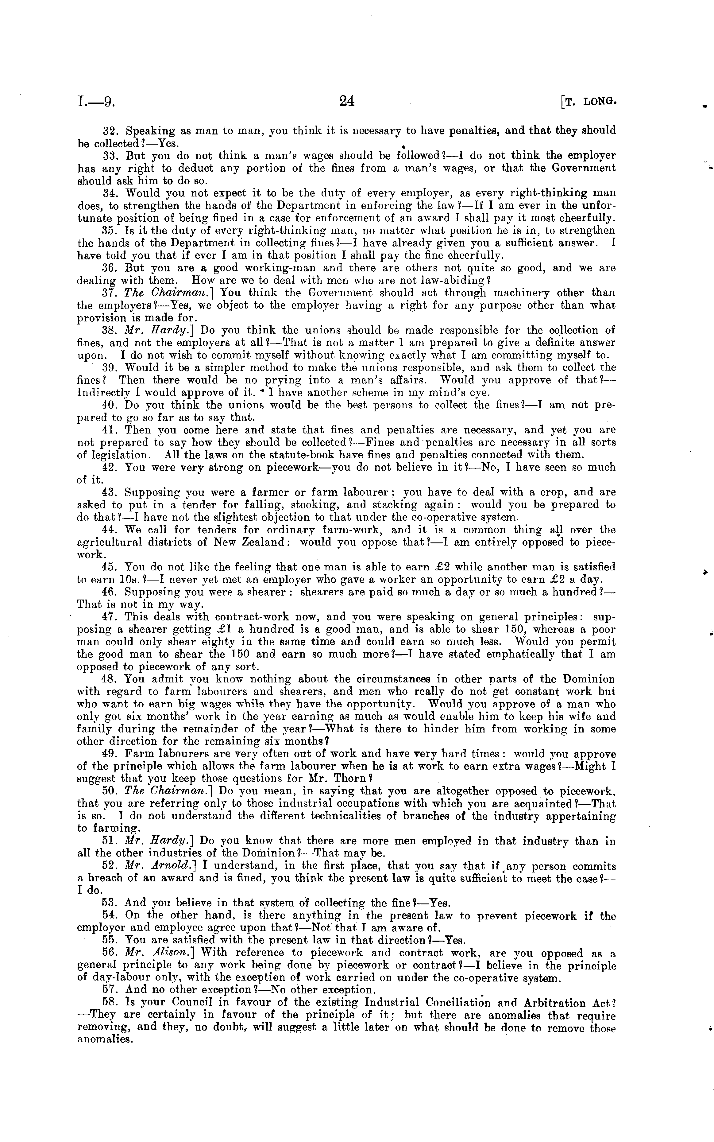 32. Speaking as man to man, you think it is necessary to have penalties, and that they should be collected? —Yes. , 33. But you do not think a man's xvages should be followed? —I do not think the employer has any right to deduct any portion of the fines from a man's wages, or that the Government should ask him to do so. 34. Would you not expect it to be the duty of every employer, as every right-thinking man does, to strengthen the hands of the Department in enforcing the law? —If I am ever in the unfortunate position of being fined in a case for enforcement of an award I shall pay it most cheerfully. 35. Is it the duty of every right-thinking man, no matter xvhat position he is in, to strengthen the hands of the Department in collecting fines? —I have already given you a sufficient answer. I have told you that if ever I am in that position I shall pay the fine cheerfully. 36. But you are a good working-man and there are others not quite so good, and we are dealing with them. How are we to deal with men xvho are not law-abiding? 37. The Chairman.] You think the Government should act through machinery other than the employers ?—Yes, we object to the employer having a right for any purpose other than what provision is made for. 38. Mr. Hardy.] Do you think the unions should be made responsible for the collection of fines, and not the at all?— That is not a matter I am prepared to give a definite answer upon. Ido not wish to commit myself without knowing exactly xxhat lam committing myself to. 39. Would it be a simpler method to make the unions responsible, and ask them to collect the fines? Then there would be no prying into a man's affairs. Would you approve of that?— Indirectly I would approve of it. " I have another scheme in my mind's eye. 40. Do you think the unions would be the best persons to collect the fines? —I am not prepared to go so far as to say that. 41. Then you come here and state that fines and penalties are necessary, and yet you are not prepared to say how they should be collected?— Fines and penalties are necessary in all sorts of legislation. All the laws on the statute-book have fines and penalties connected with them. 42. You were very strong on piecework—you do not believe in it?—No, I have seen so much of it. 43. Supposing you were a farmer or farm labourer; you have to deal with a crop, and are asked to put in a tender for falling, stooking, and stacking again : would you be prepared to do that? —I have not the slightest objection to that under the co-operative system. 44. We call for tenders for ordinary farm-work, and it is a common thing all over the agricultural districts of New Zealand: would you oppose that?—l am entirely opposed to piecework. 45. You do not like the feeling that one man is able to earn £2 while another man is satisfied to earn 10s. ?—I never yet met an employer who gave a worker an opportunity to earn £2 a day. 46. Supposing you were a shearer : shearers are paid so much a day or so much a hundred?—■ That is not in my way. 47. This deals with contract-work now, and you were speaking on general principles: supposing a shearer getting £1 a hundred is a good man, and is able to shear 150, whereas a poor man could only shear eighty in the same time and could earn so much less. Would you permit the good man to shear the 150 and earn so much more?—l have stated emphatically that I am opposed to piecework of any sort. 48. You admit you know nothing about the circumstances in other parts of the Dominion xvith regard to farm labourers and shearers, and men who really do not get constant work but xvho want to earn big xvages while they have the opportunity. Would you approve of a man who only got six months' work in the year earning as much as would enable him to keep his wife and family during the remainder of the year?— What is there to hinder him from xvorking in some other direction for the remaining six months? 49. Farm labourers are very often out of work and have very hard times : would you approve of the principle which allows the farm labourer when he is at work to earn extra wages?— Might I suggest that you keep those questions for Mr. Thorn? 50. The Chairman.] Do you mean, in saying that you are altogether opposed to piecework, that you are referring only to those industrial occupations with which you are acquainted?— That is so. Ido not understand the different technicalities of branches of the industry appertaining to farming. 51. Mr. Hardy.] Do you know that there are more men employed in that industry than in all the other industries of the Dominion ?—That may be. 52. Mr. Arnold.] I understand, in the first place, that you say that if .any person commits a breach of an award and is fined, you think the present law is quite sufficient to meet the case?— I do. 53. And you believe in that system of collecting the fine? —Yes. 54. On the other hand, is there anything in the present law to prevent piecework if the employer and employee agree upon that?— Not that I am aware of. 55. You are satisfied with the present law in that direction?— Yes. 56. Mr. Alison.] With reference to piecework and contract work, are you opposed as a general principle to any work being done by piecework or contract?—l believe in the principle of day-labour only, with the exception of work carried on under the co-operative system. 57. And no other exception?—No other exception. 58. Is your Council in favour of the existing Industrial Conciliation and Arbitration Act? —They are certainly in favour of the principle of it; but there are anomalies that require removing, and they, no doubt,, will suggest a little later on what should be done to remove those anomalies.