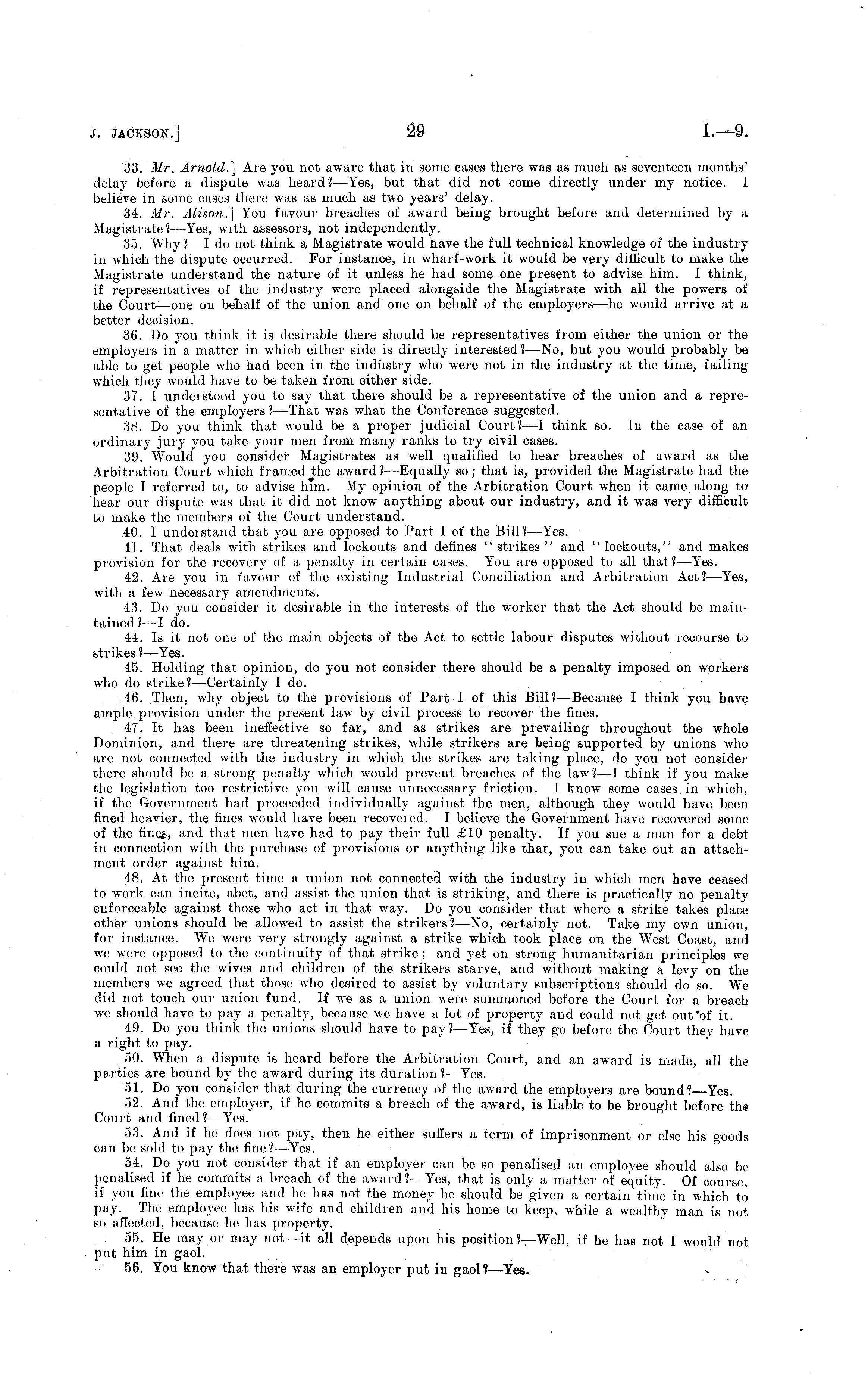 33. Mr. Arnold.] Are you not aware that in some cases there was as much as seventeen months' delay before a dispute was heard? —Yes, but that did not come directly under my notice. 1 believe in some cases there was as much as two years' delay. 34. Mr. Alison.] You favour breaches of award being brought before and determined by a Magistrate?— Yes, with assessors, not independently. 35. Why?—l do not think a Magistrate would have the full technical knoxvledge of the industry in whioh the dispute occurred. For instance, in wharf-work it xvould be very difficult to make the Magistrate understand the nature of it unless he had some one present to advise him. I think, if representatives of the industry were placed alongside the Magistrate with all the powers of the Court —one on behalf of the union and one on behalf of the employers —he would arrive at a better decision. 36. Do you think it is desirable there should be representatives from either the union or the employers in a matter in which either side is directly interested?—No, but you would probably be able to get people xvho had been in the industry who xvere not in the industry at the time, failing which they xvould have to be taken from either side. 37. I understood you to say that there should be a representative of the union and a representative of the employers? —That was what the Conference suggested. 38. Do you think that would be a proper judicial Court? —I think so. In the case of an ordinary jury you take your men from many ranks to try civil cases. 39. Would you consider Magistrates as well qualified to hear breaches of axvard as the Arbitration Court xvhich framed the award I —Equally so; that is, provided the Magistrate had the people I referred to, to advise him. My opinion of the Arbitration Court xvhen it came along to hear our dispute was that it did not know anything about our industry, and it was very difficult to make the members of the Court understand. 40. 1 understand that you are opposed to Part I of the Bill? —Yes. 41. That deals with strikes and lockouts and defines "strikes" and "lockouts," and makes provision for the recovery of a penalty in certain cases. You are opposed to all that?— Yes. 42. Are you in favour of the existing Industrial Conciliation and Arbitration Act? —Yes, xvith a few necessary amendments. 43. Do you consider it desirable in the interests of the worker that the Act should be maintained? —I do. 44. Is it not one of the main objects of the Act to settle labour disputes without recourse to strikes? —Yes. 45. Holding that opinion, do you not consider there should be a penalty imposed on workers who do strike? —Certainly I do. ,46. Then, xxdiy object to the provisions of Part I of this Bill?— Because I think you have ample provision under the present law by civil process to recover the fines. 47. It has been ineffective so far, and as strikes are prevailing throughout the xvhole Dominion, and there are threatening strikes, xvhile strikers are being supported by unions who are not connected xvith the industry in which the strikes are taking place, do you not consider there should be a strong penalty xvhich. xvould prevent breaches of the laxv?—l think if you make the legislation too restrictive you xvill cause unnecessary friction. I knoxv some cases in which, if the Government had proceeded individually against the men, although they xvould have been fined heavier, the fines would liax-e been recovered. I believe the Government have recovered some of the fines, and that men have had to pay their full £10 penalty. If you sue a man for a debt in connection with the purchase of provisions or anything like that, you can take out an attachment order against him. 48. At the present time a union not connected with the industry in which men have ceased to work can incite, abet, and assist the union that is striking, and there is practically no penalty enforceable against those wdio act in that xvay. Do you consider that xxhere a strike takes place other unions should be allowed to assist the strikers? —No, certainly not. Take my own union, for instance. We xvere very strongly against a strike which took place on the West Coast, and xve xx-ere opposed to the continuity of that strike ; and yet on strong humanitarian principles we could not see the xvives and children of the strikers starve, and without making a levy on the members xve agreed that those who desired to assist by voluntary subscriptions should do so. We did not touch our union fund. If xve as a union xvere summoned before the Court for a breach xve should have to pay a penalty, because xve have a lot of property and could not get out'of it. 49. Do you think the unions should have to pay?— Yes, if they go before the Court they have a right to pay. 50. When a dispute is heard before the Arbitration Court, and an axvard is made, all the parties are bound by the axvard during its duration?— Yes. 51. Do you consider that during the currency of the axvard the employers are bound?— Yes. 52. And the employer, if he commits a breach of the axvard, is liable to be brought before the Court and fined ?—Yes. 53. And if he does not pay, then he either suffers a term of imprisonment or else his goods can be sold to pay the fine?— Yes. 54. Do you not consider that if an employer can be so penalised an employee should also be penalised if he commits a breach of the award?— Yes, that is only a matter of equity. Of course, if you fine the employee and he has not the money he should be given a certain time in xvhich to pay. The employee has his xvife and children and his home to keep, xvhile a wealthy man is not so affected, because he has property. 55. He may or may not—it all depends upon his position?— Well, if ho has not I xvould not put him in gaol. 56. You know that there was an employer put in gaol?— Yes.