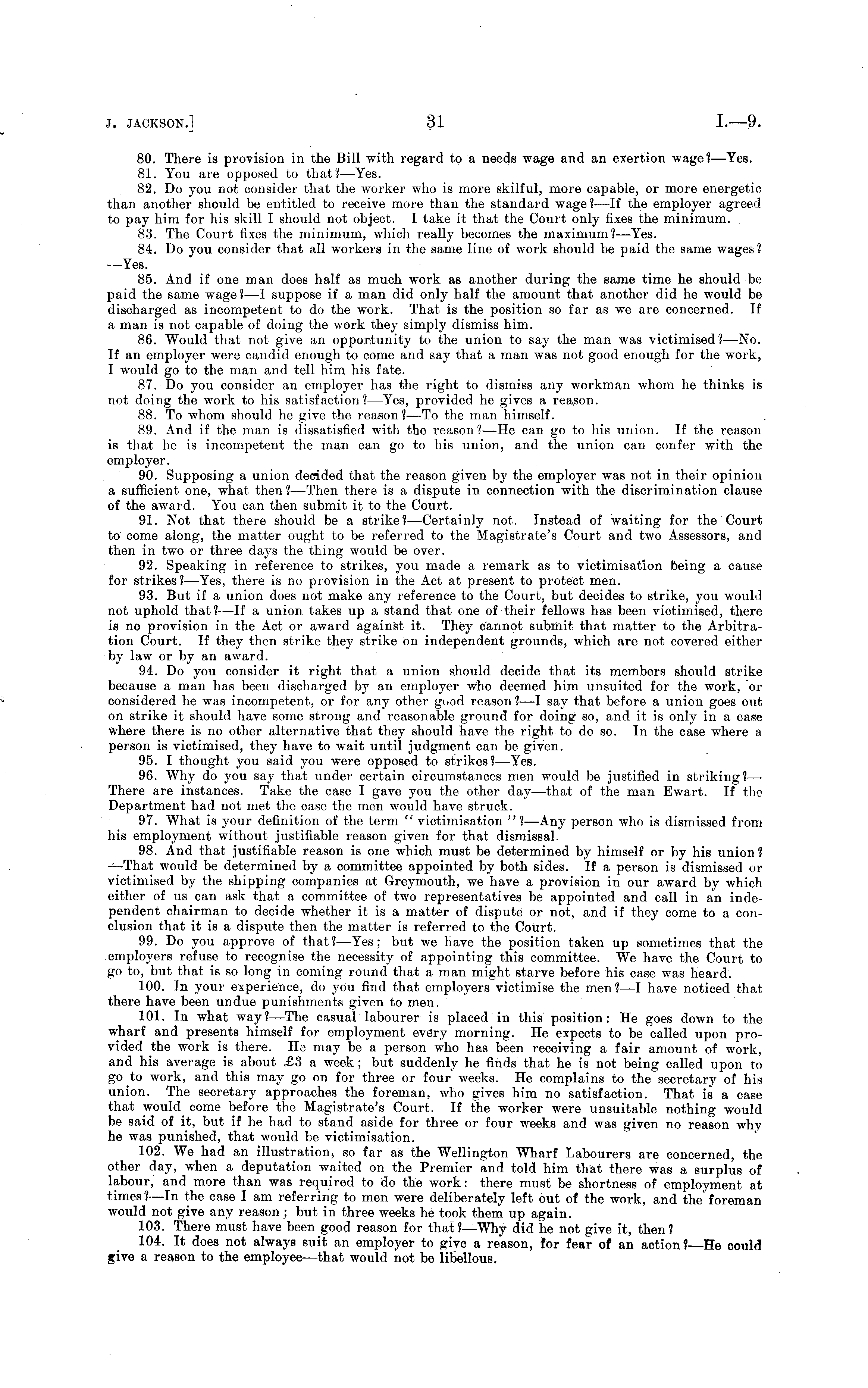 80. There is provision in the Bill with regard to a needs wage and an exertion wage?— Yes. 81. You are opposed to that?— Yes. 82. Do you not consider that the xvorker who is more skilful, more capable, or more energetic than another should be entitled to receive more than the standard wage?—lf the employer agreed to pay him for his skill I should not object. I take it that the Court only fixes the minimum. 83. The Court fixes the minimum, xvhich really becomes the maximum? —Yes. 84. Do you consider that all xvorkers in the same line of xvork should be paid the same wages? --Yes. 85. And if one man does half as much work as another during the same time he should be paid the same wage?—l suppose if a man did only half the amount that another did he would be discharged as incompetent to do the work. That is the position so far as we are concerned. If a man is not capable of doing the work they simply dismiss him. 86. Would that not give an opportunity to the union to say the man was victimised? —No. If an employer were candid enough to come and say that a man was not good enough for the work, I would go to the man and tell him his fate. 87. Do you consider an employer has the right to dismiss any workman whom he thinks is not doing the work to his satisfaction? —Yes, provided he gives a reason. 88. To whom should he give the reason? —To the man himself. 89. And if the man is dissatisfied with the reason?—He can go to his union. If the reason is that he is incompetent the man can go to his union, and the union can confer with the employer. 90. Supposing a union decided that the reason given by the employer was not in their opinion a sufficient one, what then ?—Then there is a dispute in connection with the discrimination clause of the award. You can then submit it to the Court. 91. Not that there should be a strike?— Certainly not. Instead of waiting for the Court to come along, the matter ought to be referred to the Magistrate's Court and two Assessors, and then in two or three days the thing would be over. 92. Speaking in reference to strikes, you made a remark as to victimisation being a cause for strikes? —Yes, there is no provision in the Act at present to protect men. 93. But if a union does not make any reference to the Court, but decides to strike, you would not uphold that?—lf a union takes up a stand that one of their fellows has been victimised, there is no provision in the Act or axvard against it. They cannot submit that matter to the Arbitration Court. If they then strike they strike on independent grounds, which are not covered either by law or by an award. 94. Do you consider it right that a union should decide that its members should strike because a man has been discharged bj' an employer xvho deemed him unsuited for the work, or considered he was incompetent, or for any other good reason ?—I say that before a union goes out on strike it should have some strong and reasonable ground for doing so, and it is only in a case where there is no other alternative that they should have the right to do so. In the case where a person is victimised, they have to wait until judgment can be given. 95. I thought you said you were opposed to strikes?— Yes. 96. Why do you say that under certain circumstances men xvould be justified in striking? —- There are instances. Take the case I gave you the other day —that of the man Exvart. If the Department had not met the case the men would have struck. 97. What is your definition of the term " victimisation "1 —Any person who is dismissed from his employment without justifiable reason given for that dismissal, 98. And that justifiable reason is one which must be determined by himself or by his union? —That would be determined by a committee appointed by both sides. If a person is dismissed or victimised by the shipping companies at Greymouth, xve have a provision in our award by which either of us can ask that a committee of two representatives be appointed and call in an independent chairman to decide whether it is a matter of dispute or not, and if they come to a conclusion that it is a dispute then the matter is referred to the Court. 99. Do you approve of that?— Yes; but we have the position taken up sometimes that the employers refuse to recognise the necessity of appointing this committee. We have the Court to go to, but that is so long in coming round that a man might starve before his case was heard. 100. In your experience, do you find that employers victimise the men?—l have noticed that there have been undue punishments given to men. 101. In what way?— The casual labourer is placed in this position: He goes down to the wharf and presents himself for employment eve"ry morning. He expects to be called upon provided the work is there. He may be a person who has been receiving a fair amount of work, and his average is about £3 a week; but suddenly he finds that he is not being called upon to go to work, and this may go on for three or four xveeks. He complains to the secretary of his union. The secretary approaches the foreman, xvho gives him no satisfaction. That is a case that would come before the Magistrate's Court. If the worker were unsuitable nothing would be said of it, but if he had to stand aside for three or four xveeks and was given no reason why he was punished, that xvould be victimisation. 102. We had an illustration, so far as the Wellington Wharf Labourers are concerned, the other day, when a deputation xvaited on the Premier and told him that there was a surplus of labour, and more than was required to do the work: there must be shortness of employment at times ?—ln the case I am referring to men were deliberately left out of the work, and the foreman would not give any reason; but in three weeks he took them up again. 103. There must have been good reason for that?— Why did he not give it, then? 104. It does not always suit an employer to give a reason, for fear of an acti