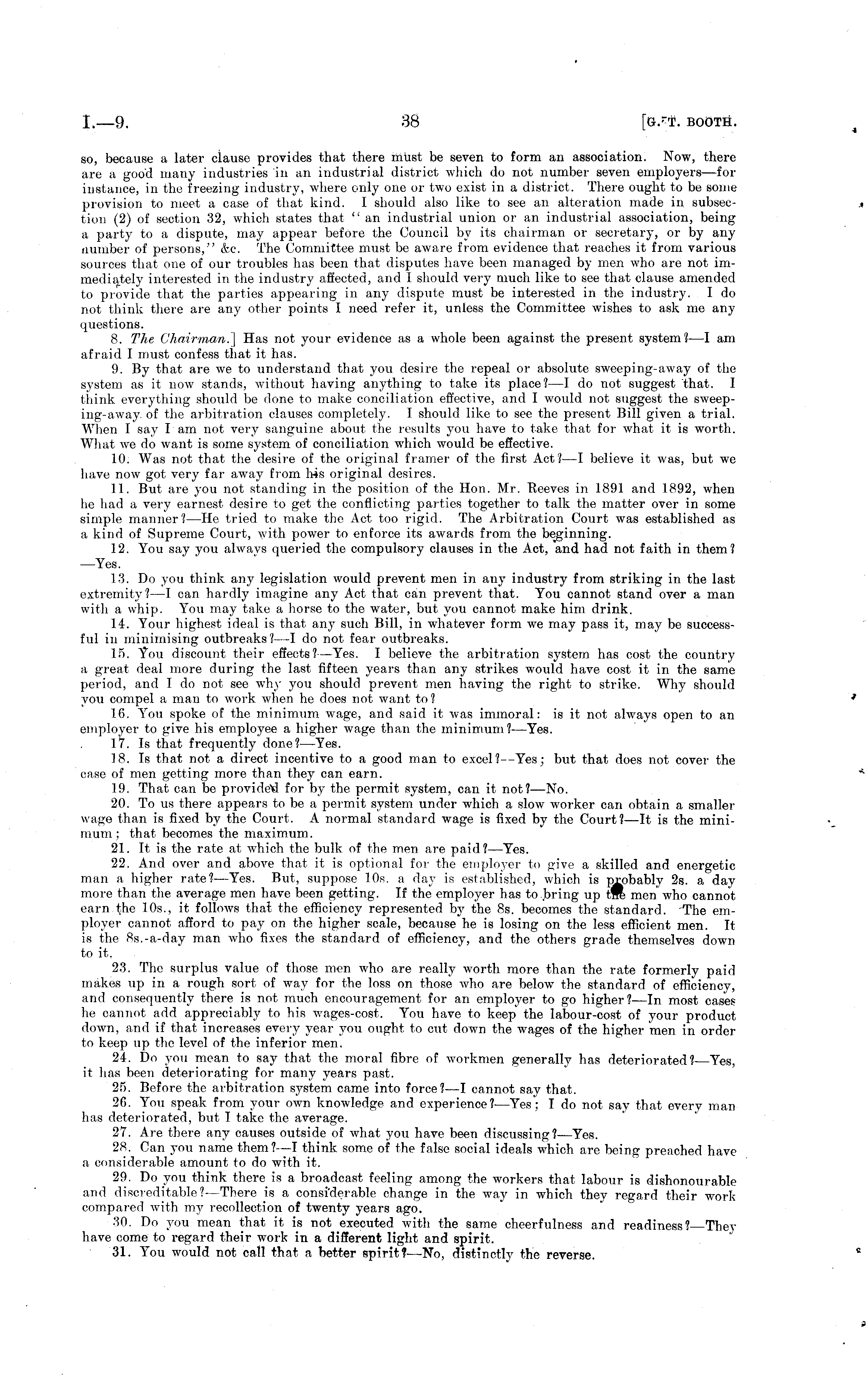 so, because a later clause provides that there must be seven to form an association. Now, there are a good many industries in an industrial district xvhich do not number seven employers—for instance, in the freezing industry, xvhere only one or txvo exist in a district. There ought to be some provision to meet a case of that kind. I should also like to see an alteration made in subsection (2) of section 32, xvhich states that " an industrial union or an industrial association, being a party to a dispute, may appear before the Council by its chairman or secretary, or by any number of persons," &c. The Committee must be axvare from evidence that reaches it from various sources that one of our troubles has been that disputes have been managed by men xxdio are not immediately interested in the industry affected, and I should very much like to see that clause amended to provide that the parties appearing in any dispute must be interested in the industry. I do not think there are any other points I need refer it, unless the Committee xvishes to ask me any questions. 8. The Chairman.] Has not your evidence as a whole been against the present system?—l am afraid I must confess that it has. 9. By that are xve to understand that you desire the repeal or absolute sweeping-away of the system as it noxv stands, xvithout having anything to take its place?—l do not suggest that. I think everything should be done to make conciliation effective, and I xvould not suggest the sweep-ing-away of the arbitration clauses completely. I should like to see the present Bill given a trial. When I say lam not very sanguine about the results you have to take that for xvhat it is worth. What xve do xvant is some system of conciliation which xvould be effective. 10. Was not that the desire of the original framer of the first Act? —I believe it xvas, but we have now got very far away from his original desires. 11. But are you not standing in the position of the Hon. Mr. Reeves in 1891 and 1892, when he had a very earnest desire to get the conflicting parties together to talk the matter over in some simple manner?—He tried to make the Act too rigid. The Arbitration Court was established as a kind of Supreme Court, xvith power to enforce its awards from the beginning. 12. You say you alxvavs queried the compulsory clauses in the Act, and had not faith in them? —Yes. 13. Do you think any legislation x\ r ould prevent men in any industry from striking in the last extremity? —I can hardly imagine any Act that can prevent that. You cannot stand over a man with a whip. You may take a horse to the water, but you cannot make him drink. 14. Your highest ideal is that any such Bill, in xxdiatever form we may pass it, may be successful in minimising outbreaks? —I do not fear outbreaks. 15. You discount their effects?— Yes. I believe the arbitration system has cost the country a great deal more during the last fifteen years than any strikes would have cost it in the same period, and I do not see why you should prevent men having the right to strike. Why should you compel a man to xvork xvhen he does not xvant to? 16. You spoke of the minimum wage, and said it was immoral: is it not always open to an employer to give his employee a higher wage than the minimum ?—Yes. 17. Is that frequently done?— Yes. 18. Is that not a direct incentive to a good man to excel?--Yes; but that does not cover the case of men getting more than they can earn. 19. That can be provided for by the permit system, can it not?— No. 20. To us there appears to be a permit system under which a slow worker can obtain a smaller wage than is fixed by the Court. A. normal standard wage is fixed by the Court?—lt is the minimum ; that becomes the maximum. 21. It is the rate at which the bulk of the men are paid?— Yes. 22. And over and above that it is optional for the employer to give a skilled and energetic man a higher rate?— Yes. But, suppose 10s. a day is established, xvhich is probably 2s. a day more than the average men have been getting. If the employer has to bring up tire men who cannot earn the 10s., it folloxvs that the efficiency represented by the Bs. becomes the standard. The employer cannot afford to pay on the higher scale, because he is losing on the less efficient men. It is the Bs.-a-day man xvho fixes the standard of efficiency, and the others grade themselves down to it. 23. The surplus value of those men who are really worth more than the rate formerly paid makes up in a rough sort of way for the loss on those xvho are beloxv the standard of efficiency, and consequently there is not much encouragement for an employer to go higher?—ln most cases he cannot add appreciably to his wages-cost. You have to keep the labour-cost of your product doxvn, and if that increases every year you ought to cut down the wages of the higher men in order to keep up the level of the inferior men. 24. Do you mean to say that the moral fibre of workmen generally has deteriorated?— Yes, it has been deteriorating for many years past. 25. Before the arbitration system came into force?—l cannot say that. 26. You speak from, your oxvn knowdedge and experience?— Yes; I do not say that every man has deteriorated, but I take the average. 27. Are there any causes outside of xvhat you have been discussing?— Yes. 28. Can you name them? —I think some of the false social ideals xvhich are being preached have a considerable amount to do with it. 29. Do you think there is a broadcast feeling among the xvorkers that labour is dishonourable and discreditable?— There is a considerable change in the way in xvhich they regard their work compared xvith my recollection of twenty years ago. 30. Do you mean that it is not executed xvith the same cheerfulness and readiness? They have come to regard their work in a different light and spirit. 31. You would not call that a better spirit?—No, distinctly the reverse.