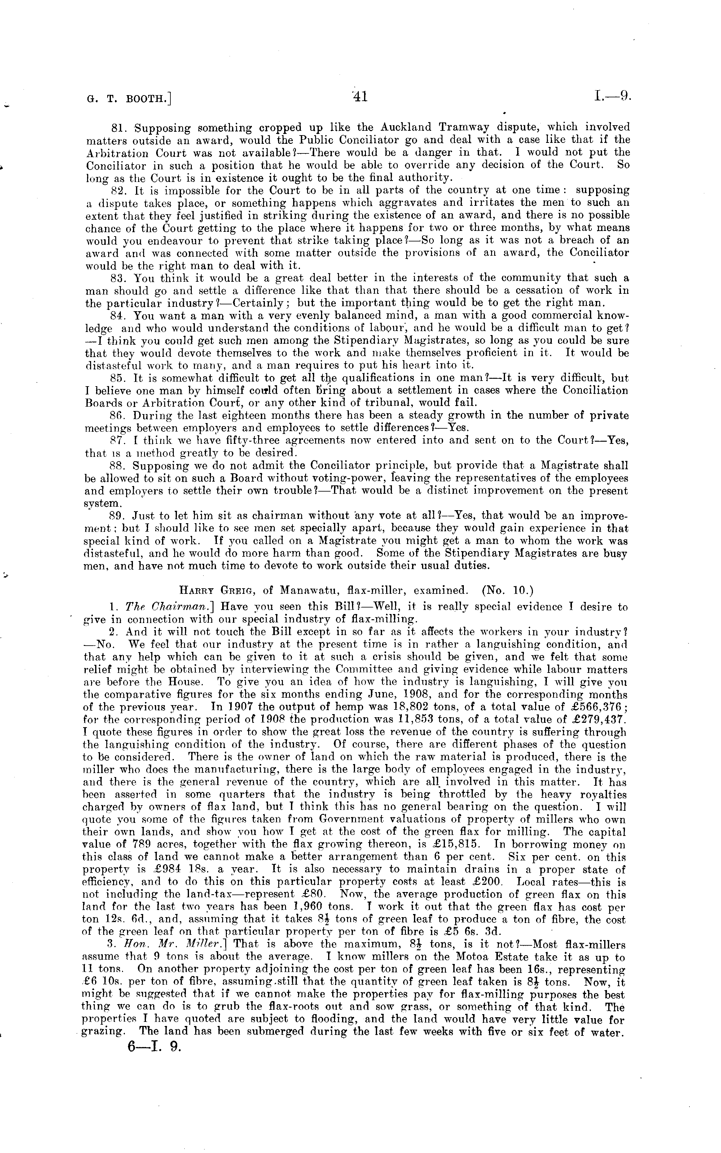 81. Supposing something cropped up like the Auckland Tramway dispute, xvhich involved matters outside an award, would the Public Conciliator go and deal with a case like that if the Arbitration Court was not available? —There xvould be a danger in that. I would not put the Conciliator in such a position that he xvould be able to override any decision of the Court. So long as the Court is in existence it ought to be the final authority. 82. It is impossible for the Court to be in all parts of the country at one time : supposing a dispute takes place, or something happens xvhich aggravates and irritates the men to such an extent that, they feel justified in striking during the existence of an award, and there is no possible chance of the Court getting to the place xvhere it happens for txvo or three months, by xvhat means would you endeavour to prevent that strike taking place ?—So long as it xvas not a breach of an axvard and xvas connected xvith some matter outside the provisions of an award, the Conciliator xx'ould be the right man to deal xvith it. 83. You think it would be a great deal better in the interests of the community that such a man should go and settle a difference like that than that there should bo a cessation of work in the particular industry?— Certainly; but the important thing xvould be to get the right man. 84. You xvant a man with a very evenly balanced mind, a man xvith a good commercial knoxvledge and xvho xvould understand the conditions of labour, and he xvould be a difficult man to get? —I think you could get such men among the Stipendiary Magistrates, so long as you could be sure that they would devote themselves to the xvork and make themselves proficient in it. It xvould be distasteful xvork to many, and a man requires to put his heart into it. 85. It is somexvhat difficult to get all the qualifications in one man?—lt is very difficult, but I believe one man by himself could often Bring about a settlement in cases where the Conciliation Boards or Arbitration Court, or any other kind of tribunal, would fail. 86. During the last eighteen months there has been a steady growth in the number of private meetings betxveen employers and employees to settle differences? —Yes. 87. T think xve have fifty-three agreements noxv entered into and sent on to the Court?— Yes, that is a method greatly to be desired. 88. Supposing we do not admit the Conciliator principle, but provide that a Magistrate shall be allowed to sit on such a Board xvithout voting-poxx r er, leaving the representatives of the employees and employers to settle their own trouble? —That would be a distinct improvement on the present system. 89. Just to let him sit as chairman xvithout any vote at all?— Yes, that xvould be an improvement : but I should like to see men set specially apart, because they would gain experience in that special kind of xvork. If you called on a Magistrate you might get a man to xxdiom the xx'ork xvas distasteful, and he would do more harm than good. Some of the Stipendiary Magistrates are busy men, and have not much time to devote to work outside their usual duties. Harry Greig, of Manawatu, flax-miller, examined. (No. 10.) 1. The Chairman.] Have you seen this Bill? —Well, it is really special evidence I desire to give in connection xvith our special industry of flax-milling. 2. And it will not touch the Bill except in so far as it affects the xvorkers in your industry? —No. We feel that our industry at the present time is in rather a languishing condition, and that any help xxdiich can be given to it at such a crisis should be given, and xve felt that some relief might be obtained by interviewing the Committee and giving evidence while labour matters are before the House. To give you an idea of hoxv the industry is languishing, I xvill give you the comparative figures for the six months ending June, 1908, and for the corresponding months of the previous year. Tn 1907 the output of hemp was 18,802 tons, of a total value of £566,376 ; for the corresponding period of 1908 the production was 11,853 tons, of a total value of £279,437. T quote these figures in order to shoxv the great loss the revenue of the country is suffering through the languishing condition of the industry. Of course, there are different phases of the question to be considered. There is the oxvner of land on xvhich the raw material is produced, there is the miller xvho does the manufacturing, there is the large body of employees engaged in the industry, and there is the general revenue of the country, xxdiich are all involved in this matter. It has been asserted in some quarters that the industry is being throttled by the heavy royalties charged by oxvners of flax land, but I think this has no general bearing on the question. I will quote you some of the figures taken from Government valuations of property of millers xvho own their oxvn lands, and shoxv you hoxv I get at the cost of the green flax for milling. The capital value of 789 acres, together xvith the flax groxving thereon, is £15,815. In borrowing money on this class of land we cannot make a better arrangement than 6 per cent. Six per cent, on this property is £984 18s. a year. It is also necessary to maintain drains in a proper state of efficiency, and to do this on this particular property costs at least £200. Local rates—this is not including the land-tax —represent £80. Now, the average production of green flax on this land for the last txvo years has been 1,960 tons. T xvork it out that the green flax has cost per ton 12s. 6d., and, assuming that it takes 8J tons of green leaf to produce a ton of fibre, the cost of the green leaf on that particular property per ton of fibre is £5 6s. 3d. 3. Hon. Mr. Miller.] That is above the maximum, 8i tons, is it not?— Most flax-millers assume that 9 tons is about the average. T knoxv millers on the Motoa Estate take it as up to II tons. On another property adjoining the cost