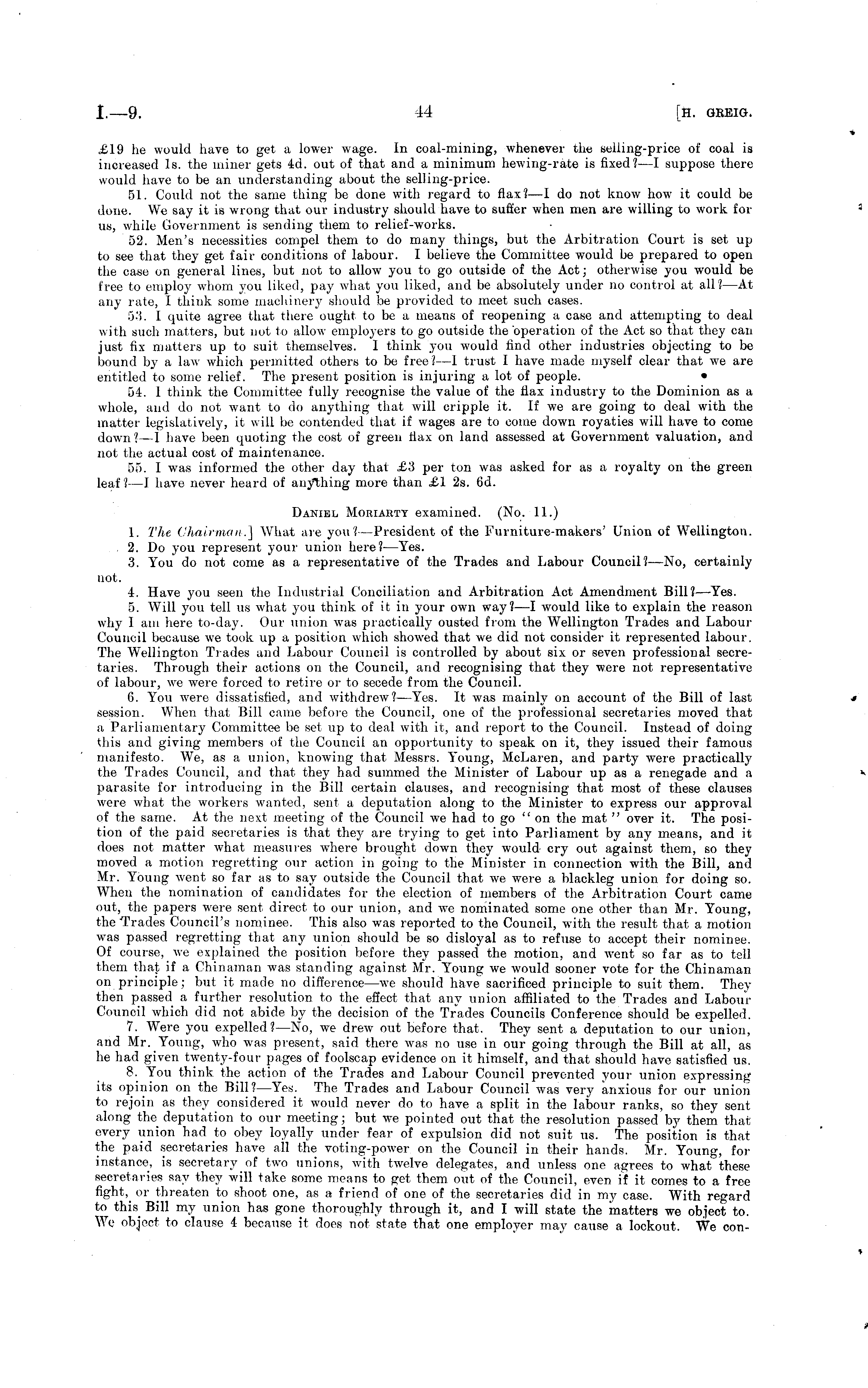 £19 he would have to get a lower wage. In coal-mining, whenever the selling-price of coal is increased Is. the miner gets 4d. out of that and a minimum hexving-rate is fixed? —I suppose there would have to be an understanding about the selling-price. 51. Could not the same thing be done with regard to flax? —I do not know how it could be done. We say it is wrong that our industry should have to suffer when men are willing to xvork for us, xvhile Government is sending them to relief-works. 52. Men's necessities compel them to do many things, but the Arbitration Court is set up to see that they get fair conditions of labour. I believe the Committee would be prepared to open the case on general lines, but not to alloxv you to go outside of the Act; otherwise you would be free to employ whom you liked, pay xvhat you liked, and be absolutely under no control at all?—At any rate, I think some machinery should be provided to meet such cases. 53. I quite agree that there ought to be a means of reopening a case and attempting to deal xvith such matters, but not to alloxv employers to go outside the operation of the Act so that they can just fix matters up to suit themselves. I think you would find other industries objecting to be bound by a law which permitted others to be free?—l trust I have made myself clear that we are entitled to some relief. The present position is injuring a lot of people. • 54. 1 think the Committee fully recognise the value of the flax industry to the Dominion as a whole, and do not want to do anything that xvill cripple it. If xve are going to deal with the matter legislatively, it will be contended that if wages are to come down royaties will have to come down ?—1 have been quoting the cost of green ttax on land assessed at Government valuation, and not the actual cost of maintenance. 55. 1 was informed the other day that £3 per ton xvas asked for as a royalty on the green leaf? —I have never heard of anything more than £1 2s. 6d. Daniel Moriarty examined. (No. 11.) 1. The Chairman.] What are you?— President of the Furniture-makers' Union of Wellington. 2. Do you represent your union here?— Yes. 3. You do not come as a representative of the Trades and Labour Council? —No, certainly not. 4. Have you seen the Industrial Conciliation and Arbitration Act Amendment Bill? —Yes. 5. Will you tell us xvhat you think of it in your own way?—l xvould like to explain the reason why lam here to-day. Our union was practically ousted from the Wellington Trades and Labour Council because we took up a position xvhich showed that xve did not consider it represented labour. The Wellington Trades and Labour Council is controlled by about six or seven professional secretaries. Through their actions on the Council, and recognising that they were not representative of labour, we xvere forced to retire or to secede from the Council. 6. You xvere dissatisfied, and withdrew? —Yes. It was mainly on account of the Bill of last session. When that Bill came before the Council, one of the professional secretaries moved that a Parliamentary Committee be set up to deal xvith it, and report to the Council. Instead of doing this and giving members of the Council an opportunity to speak on it, they issued their famous manifesto. We, as a union, knoxving that Messrs. Young, McLaren, and party were practically the Trades Council, and that they had summed the Minister of Labour up as a renegade and a parasite for introducing in the Bill certain clauses, and recognising that most of these clauses were what the workers wanted, sent a deputation along to the Minister to express our approval of the same. At the next meeting of the Council we had to go "on the mat " over it. The position of the paid secretaries is that the}' are trying to get into Parliament by any means, and it does not matter xvhat measures xvhere brought down they would cry out against them, so they moved a motion regretting our action in going to the Minister in connection with the Bill, and Mr. Young went so far as to say outside the Council that we xvere a blackleg union for doing so. When the nomination of candidates for the election of members of the Arbitration Court came out, the papers were sent direct to our union, and xve nominated some one other than Mr. Young, the Trades Council's nominee. This also was reported to the Council, with the result that a motion was passed regretting that any union should be so disloyal as to refuse to accept their nominee. Of course, xve explained the position before they passed the motion, and xx'ent so far as to tell them that if a Chinaman was standing against Mr. Young xve xvould sooner vote for the Chinaman on principle; but it made no difference—we should have sacrificed principle to suit them. They then passed a further resolution to the effect that any union affiliated to the Trades and LabourCouncil xvhich did not abide by the decision of the Trades Councils Conference should be expelled. 7. Were you expelled?—No, xve drexv out before that. They sent a deputation to our union, and Mr. Young, who was present, said there xvas no use in our going through the Bill at all, as he had given twenty-four pages of foolscap evidence on it himself, and that should have satisfied us. 8. You think the action of the Trades and Labour Council prevented your union expressing its opinion on the Bill?— Yes. The Trades and Labour Council was very anxious for our union to rejoin as they considered it would never do to have a split in the labour ranks, so they sent along the deputation to our meeting; but we pointed out that the resolution passed by them that every union had t,o obey loyally under fear of expulsion did not suit us. The position is that the paid secretaries have all the voting-power on the Council in their hands. Mr. Young, for instance, is secretary of txvo unions, xvith twelve delegates, and unless one agrees to xvhat these secretaries say they xvill take some me