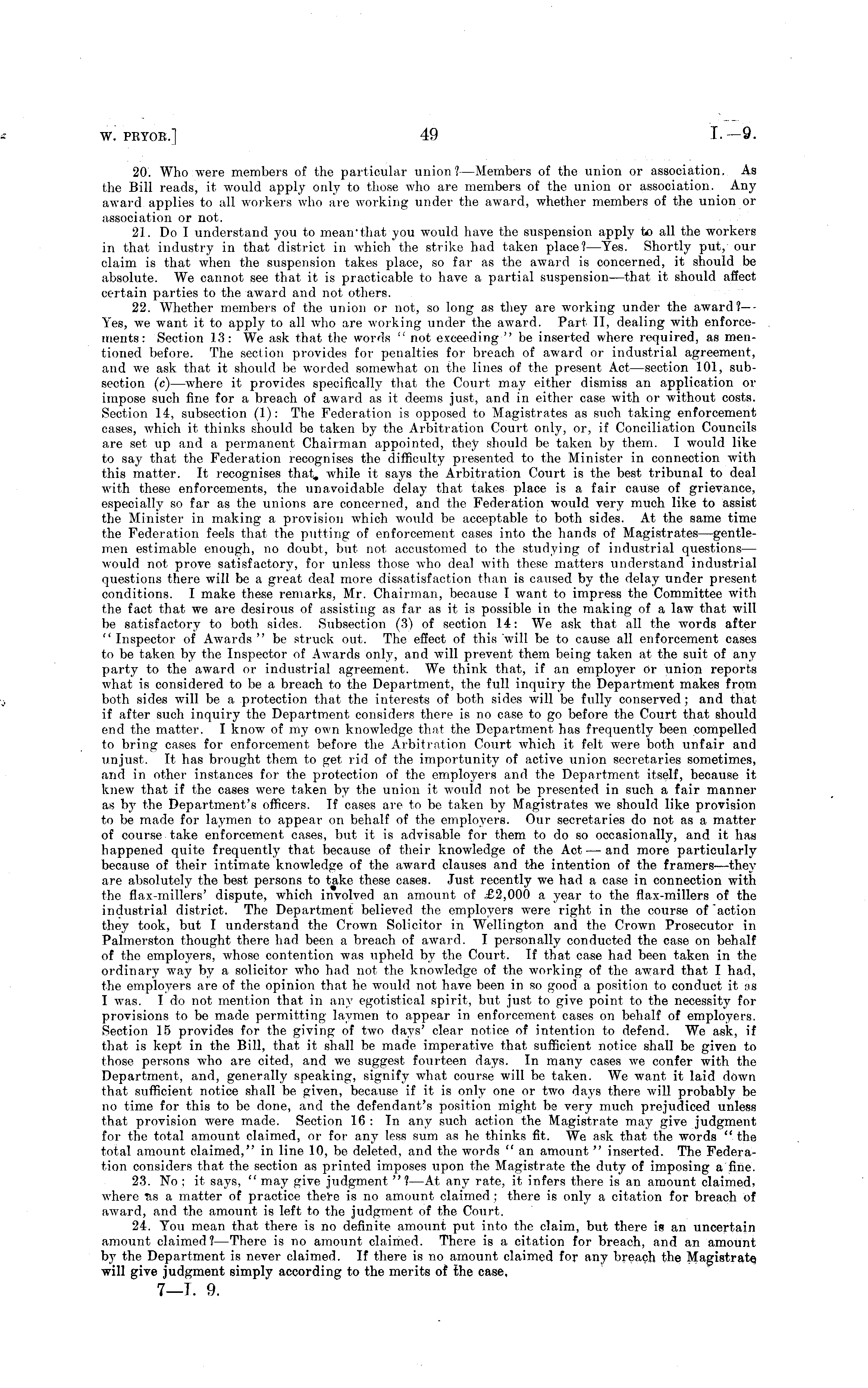 20. Who were members of the particular union ?—Members of the union or association. As the Bill reads, it xvould apply only to those xxdio are members of the union or association. Any award applies to all workers who are working under the award, xvhether members of the union or association or not. 21. Do I understand you to mean"that you would have the suspension apply to all the workers in that industry in that district in xxdiich the strike had taken place?— Yes. Shortly put, our claim is that xvhen the suspension takes place, so far as the axvard is concerned, it should be absolute. We cannot see that it is practicable to have a partial suspension—that it should affect certain parties to the award and not others. 22. Whether members of the union or not, so long as they are working under the award?—Yes, we want it to apply to all xvho are working under the award. Part 11, dealing with enforcements : Section 13: We ask that the words " not exceeding" be inserted xxhere required, as mentioned before. The section provides for penalties for breach of award or industrial agreement, and xve ask that it should be worded somexvhat on the lines of the present Act—section 101, subsection (c) —xxdiere it provides specifically that the Court may either dismiss an application or impose such fine for a breach of award as it deems just, and in either case with or without costs. Section 14, subsection (1): The Federation is opposed to Magistrates as such taking enforcement cases, xvhich it thinks should be taken by the Arbitration Court only, or, if Conciliation Councils are set up and a permanent Chairman appointed, they should be taken by them. I would like to say that the Federation recognises the difficulty presented to the Minister in connection xvith this matter. It recognises that, xvhile it says the Arbitration Court is the best tribunal to deal xvith these enforcements, the unavoidable delay that takes place is a fair cause of grievance, especially so far as the unions are concerned, and the Federation would very much like to assist the Minister in making a provision xvhich would be acceptable to both sides. At the same time the Federation feels that the putting of enforcement cases into the hands of Magistrates—gentlemen estimable enough, no doubt, but not accustomed to the studying of industrial questions — xvould not prove satisfactory, for unless those xxdio deal xvith these matters understand industrial questions there will be a great deal more dissatisfaction than is caused by the delay under present conditions. I make these remarks, Mr. Chairman, because I xvant to impress the Committee with the fact that we are desirous of assisting as far as it is possible in the making of a law that will be satisfactory to both sides. Subsection (3) of section 14: We ask that all the xvords after " Inspector of Awards " be struck out. The effect of this xvill be to cause all enforcement cases to be taken by the Inspector of Awards only, and xvill prevent them being taken at the suit of any party to the award or industrial agreement. We think that, if an employer or union reports xvhat is considered to be a breach to the Department, the full inquiry the Department makes from both sides xvill be a protection that the interests of both sides will be fully conserved; and that if after such inquiry the Department considers there is no case to go before the Court that should end the matter. I know of my own knoxvledge that the Department has frequently been compelled to bring cases for enforcement before the Arbitration Court which it felt were both unfair and unjust. It has brought them to get rid of the importunity of active union secretaries sometimes, and in other instances for the protection of the employers and the Department itself, because it knew that if the cases xx'ere taken by the union it would not be presented in such a fair manner as by the Department's officers. If cases are to be taken by Magistrates we should like provision to be made for laymen to appear on behalf of the employers. Our secretaries do not as a matter of course take enforcement cases, but it is advisable for them to do so occasionally, and it has happened quite frequently that because of their knowledge of the Act — and more particularly because of their intimate knowledge of the axvard clauses and the intention of the framers-—they are absolutely the best persons to take these cases. Just recently we had a case in connection with the flax-millers' dispute, which involved an amount of £2,000 a year to the flax-millers of the industrial district. The Department believed the employers were right in the course of "action they took, but I understand the Crown Solicitor in Wellington and the Croxvn Prosecutor in Palmerston thought there had been a breach of axvard. I personally conducted the case on behalf of the empkwers, whose contention was upheld by the Court. If that case had been taken in the ordinary way by a solicitor who had not the knoxvledge of the working of the award that I had, the employers are of the opinion that he would not have been in so good a position to conduct it as I was. Ido not mention that in any egotistical spirit, but. just to give point to the necessity for provisions to be made permitting laymen to appear in enforcement cases on behalf of employers. Section 15 provides for the giving of two days' clear notice of intention to defend. We ask, if that is kept in the Bill, that it shall be made imperative that sufficient notice shall be given to those persons who are cited, and we suggest fourteen days. In many cases we confer with the Department, and, generally speaking, signify what course will be taken. We want it laid doxvn that sufficient notice shall be given, because if it is only one or two days there xvill probably be no time for this to be done, and the defendant's position might be very much prejudiced unless that provision were made. Section 16 :In any such action th