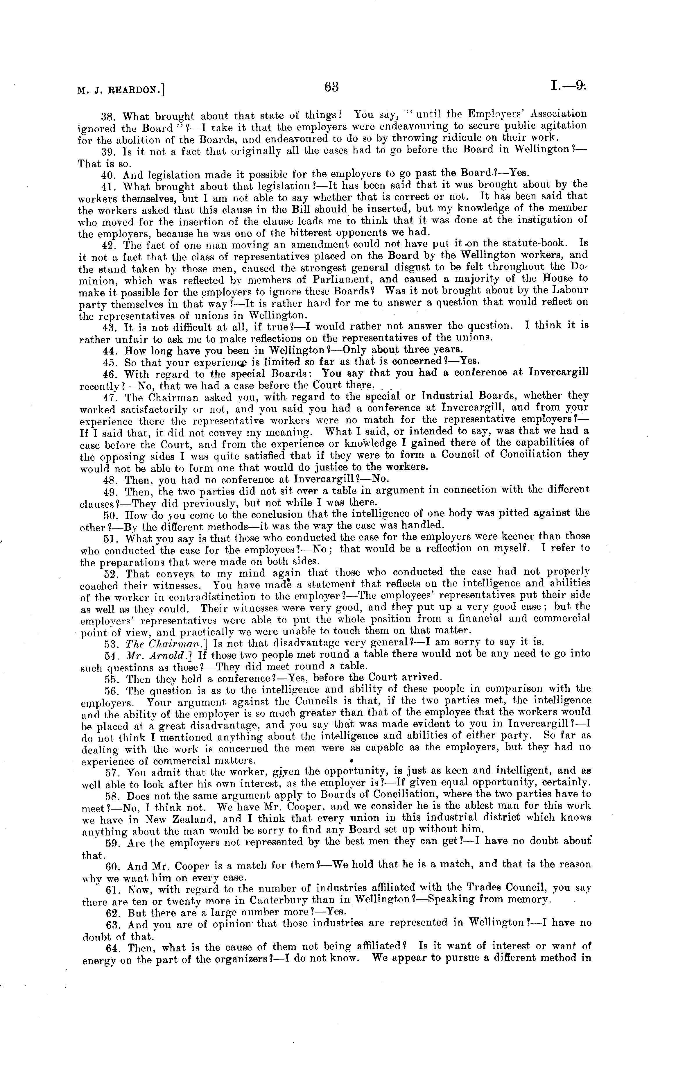 38. What brought about that state of things? You say, "until the Employers' Association ignored the Board "?—I take it that the employers xvere endeavouring to secure public agitation for the abolition of the Boards, and endeavoured to do so by throwing ridicule on their work. 39. Is it not a fact that originally all the cases had to go before the Board in Wellington?— That is so. 40. And legislation made it possible for the employers to go past the Board? —Yes. 41. What brought about that legislation? —It has been said that it was brought about by the workers themselves, but lam not able to say whether that is correct or not. It has been said that the xvorkers asked that this clause in the Bill should be inserted, but my knowledge of the member xvho moved for the insertion of the clause leads me to think that it was done at the instigation of the employers, because he was one of the bitterest opponents we had. 42. The fact of one man moving an amendment could not have put it on the statute-book. Is it not a fact that the class of representatives placed on the Board by the Wellington xvorkers, and the stand taken by those men, caused the strongest general disgust to be felt throughout the Dominion, which was reflected by members of Parliament, and caused a majority of the House to make it possible for the employers to ignore these Boards? Was it not brought about by the Labour party themselves in that way?—lt is rather hard for me to answer a question that xvould reflect on the representatives of unions in Wellington. 43. It is not difficult at all, if true? —I would rather not answer the question. I think it is rather unfair to ask me to make reflections on the representatives of the unions. 44. How long have you been in Wellington?— Only about three years. 45. So that your experience is limited so far as that is concerned? —Yes. 46. With regard to the special Boards: You say that you had a conference at Invercargill recently?—No, that we had a case before the Court there. 47. The Chairman asked you, with regard to the special or Industrial Boards, xvhether they xvorked satisfactorily or not, and you said you had a conference at Invercargill, and from your experience there the representative xvorkers xvere no match for the representative employers?— If I said that, it did not convey my meaning. What I said, or intended to say, was that we had a case before the Court, and from the experience or knowledge I gained there of the capabilities of the opposing sides I xvas quite satisfied that if they were to form a Council of Conciliation they xx'ould not be able to form one that would do justice to the workers. 48. Then, you had no conference at Invercargill?—No. 49. Then, the two parties did not sit over a table in argument in connection xvith the different clauses? —They did previously, but not while I was there. 50. How do you come to the conclusion that the intelligence of one body was pitted against the other?—By the different methods —it was the way the case was handled. 51. What you say is that those xvho conducted the case for the employers were keener than those who conducted the case for the employees? —No; that would be a reflection on myself. I refer to the preparations that were made on both sides. 52. That conveys to my mind again that those xvho conducted the case had not properly coached their witnesses. You have made a statement that reflects on the intelligence and abilities of the worker in contradistinction to the employer ?—The employees' representatives put their side as well as they could. Their witnesses xvere very good, and they put up a verygood case ; but the employers' representatives xvere able to put the xvhole position from a financial and commercial point of view, and practically xve xvere unable to touch them on that matter. 53. The, Chairman.] Is not that disadvantage very general? —I am sorry to say it is. 54. Mr. Arnold.] If those txvo people met round a table there would not be any need to go into such questions as those? —They did meet round a table. 55. Then they held a conference? —Yes, before the Court arrived. 56. The question is as to the intelligence and ability of these people in comparison with the employers. Your argument against the Councils is that, if the two parties met, the intelligence and the ability of the employer is so much greater than that of the employee that the workers would be placed at a great disadvantage, and you say that was made evident to you in Invercargill ?—I do not think I mentioned anything about the intelligence and abilities of either party. So far as dealing with the work is concerned the men were as capable as the employers, but they had no experience of commercial matters. • 57. You admit that the worker, given the opportunity, is just as keen and intelligent, and as xvell able to look after his own as the employer is?—lf given equal opportunity, certainly. 58. Does not the same argument apply to Boards of Conciliation, where the two parties have to meet? No, I think not. We have Mr. Cooper, and we consider he is the ablest man for this work we have in New Zealand, and I think that every union in this industrial district which knoxvs anything about the man would be sorry to find any Board set up without him. 59. Are the employers not represented by the best men they can get?—l have no doubt about that. 60. And Mr. Cooper is a match for them? —We hold that he is a match, and that is the reason xxhy xve want him on every case. 61. Now, with regard to the number of industries affiliated with the Trades Council, you say there are ten or twenty more in Canterbury than in Wellington?— Speaking from memory. 62. But there are a large number more? —Yes. 63. And you are of opinion'that those industries are represented in Wellington?—l have no doubt of that. 64. Then, what is the cause of them not being affiliated? Is it want of interest or want of energy on the part of t