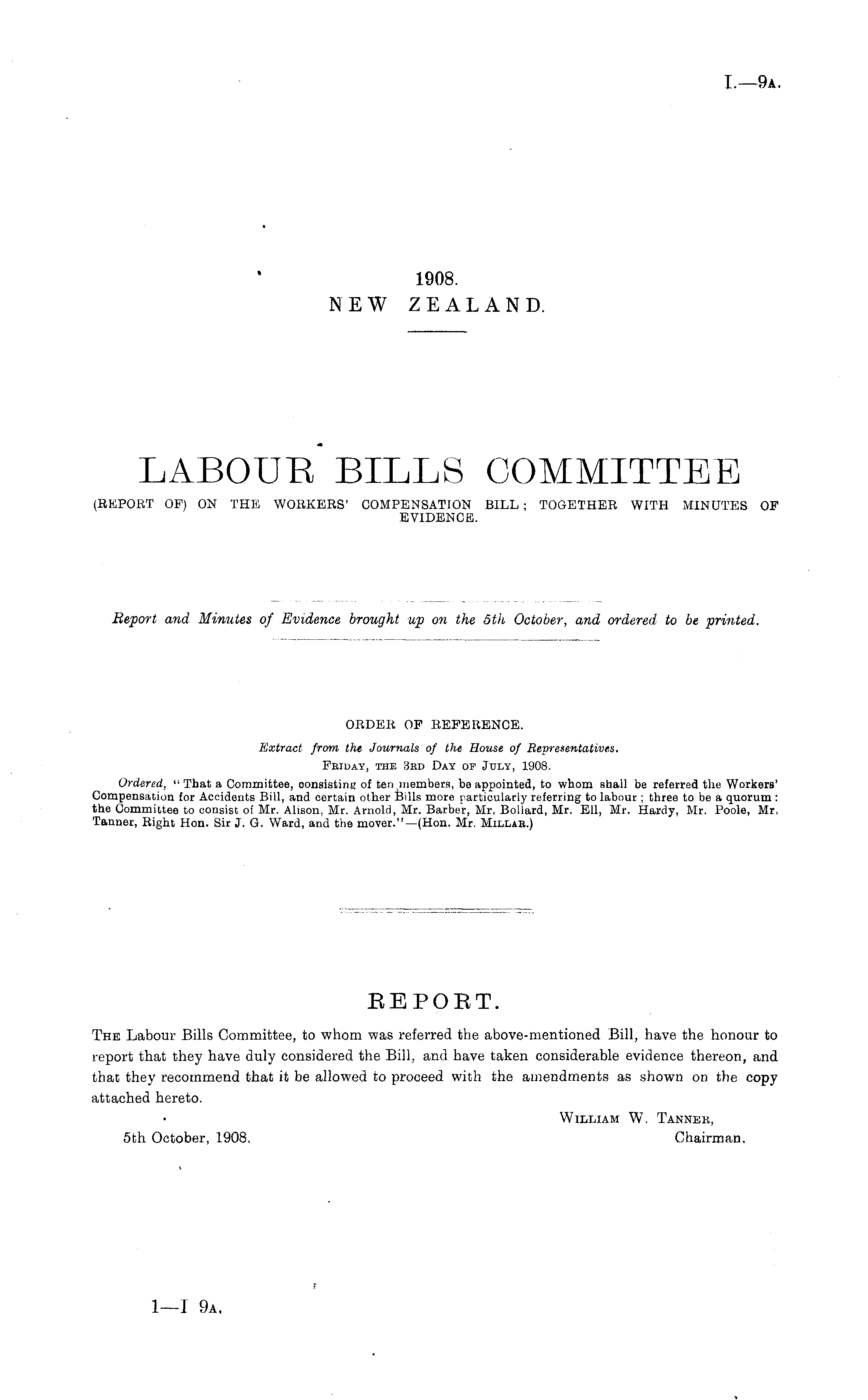 ORDER OP EEFERBNCE. Extract from the Journals of the Bouse of Representatives. Friday, the 3rd Day of July, 1908. Ordered, "That a Committee, oonsistine of ten.members, be appointed, to whom shall be referred the Workers' Compensation for Accidents Bill, and certain other Bills more particularly referring to labour ; three to be a quorum : the Committee to consist of Mr. Alison, Mr. Arnold, Mr. Barber, Mr, Bollard, Mr. Ell, Mr. Hardy, Mr. Poole, Mr, Tanner, Eight Hon. Sir J. G. Ward, and the mover."—(Hon. Mr. Millae.) EEPOET. The Labour Bills Committee, to whom was referred the above-mentioned Bill, have the honour to report that they have duly considered the Bill, and have taken considerable evidence thereon, and that they recommend that it be allowed to proceed with the amendments as shown on the copy attached hereto. William W. Tannek, sth October, 1908. Chairman.