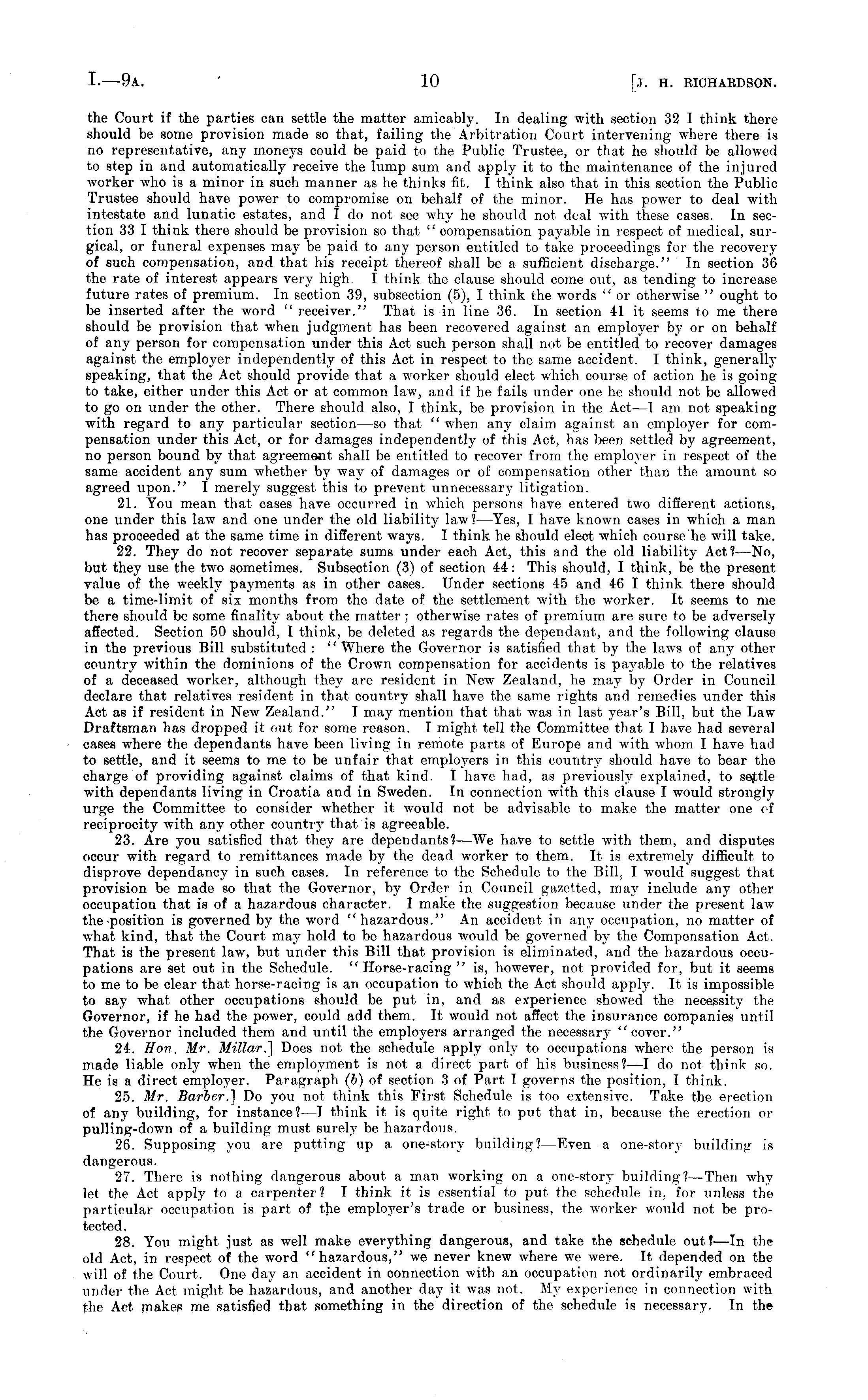 the Court if the parties can settle the matter amicably. In dealing with section 32 I think there should be some provision made so that, failing the Arbitration Court intervening where there is no representative, any moneys could be paid to the Public Trustee, or that he should be allowed to step in and automatically receive the lump sum and apply it to the maintenance of the injured worker who is a minor in such manner as he thinks fit. I think also that in this section the Public Trustee should have power to compromise on behalf of the minor. He has power to deal with intestate and lunatic estates, and I do not see why he should not deal with these cases. In section 33 I think there should be provision so that " compensation payable in respect of medical, surgical, or funeral expenses may be paid to any person entitled to take proceedings for the recovery of such compensation, and that his receipt thereof shall be a sufficient discharge." In section 36 the rate of interest appears very high. I think the clause should come out, as tending to increase future rates of premium. In section 39, subsection (5), I think the words "or otherwise " ought to be inserted after the word " receiver." That is in line 36. In section 4-1 it seems to me there should be provision that when judgment has been recovered against an employer by or on behalf of any person for compensation under this Act such person shall not be entitled to recover damages against the employer independently of this Act in respect to the same accident. I think, generally speaking, that the Act should provide that a worker should elect which course of action he is going to take, either under this Act or at common law, and if he fails under one he should not be allowed to go on under the other. There should also, I think, be provision in the Act—l am not speaking with regard to any particular section—so that " when any claim against an employer for compensation under this Act, or for damages independently of this Act, has been settled by agreement, no person bound by that agreement shall be entitled to recover from the employer in respect of the same accident any sum whether by way of damages or of compensation other than the amount so agreed upon." I merely suggest this to prevent unnecessary litigation. 21. You mean that cases have occurred in which persons have entered two different actions, one under this law and one under the old liability law?— Yes, I have known cases in which a man has proceeded at the same time in different ways. I think he should elect which course he will take. 22. They do not recover separate sums under each Act, this and the old liability Act?—No, but they use the two sometimes. Subsection (3) of section 44: This should, I think, be the present value of the weekly payments as in other cases. Under sections 45 and 46 I think there should be a time-limit of six months from the date of the settlement with the worker. It seems to me there should be some finality about the matter; otherwise rates of premium are sure to be adversely affected. Section 50 should, I think, be deleted as regards the dependant, and the following clause in the previous Bill substituted : "Where the Governor is satisfied that by the laws of any other country within the dominions of the Crown compensation for accidents is payable to the relatives of a deceased worker, although they are resident in New Zealand, he may by Order in Council declare that relatives resident in that country shall have the same rights and remedies under this Act as if resident in New Zealand." I may mention that that was in last year's Bill, but the Law Draftsman has dropped it out for some reason. I might tell the Committee that I have had several cases where the dependants have been living in remote parts of Europe and with whom I have had to settle, and it seems to me to be unfair that employers in this country should have to bear the charge of providing against claims of that kind. I have had, as previously explained, to secttle with dependants living in Croatia and in Sweden. In connection with this clause I would strongly urge the Committee to consider whether it would not be advisable to make the matter one of reciprocity with any other country that is agreeable. 23. Are you satisfied that they are dependants?—We have to settle with them, and disputes occur with regard to remittances made by the dead worker to them. It is extremely difficult to disprove dependancy in such cases. In reference to the Schedule to the Bill, I would suggest that provision be made so that the Governor, by Order in Council gazetted, may include any other occupation that is of a hazardous character. I make the suggestion because under the present law the-position is governed by the word "hazardous." An accident in any occupation, no matter of what kind, that the Court may hold to be hazardous would be governed by the Compensation Act. That is the present law, but under this Bill that provision is eliminated, and the hazardous occupations are set out in the Schedule. " Horse-racing " is, however, not provided for, but it seems to me to be clear that horse-racing is an occupation to which the Act should apply. It is impossible to say what other occupations should be put in, and as experience showed the necessity the Governor, if he had the power, could add them. It would not affect the insurance companies until the Governor included them and until the employers arranged the necessary "cover." 24. Hon. Mr. Millar.'] Does not the schedule apply only to occupations where the person is made liable only when the employment is not a direct part of his business?—l do not think so. He is a direct employer. Paragraph (b) of section 3of Part I governs the position, I think. 25. Mr. Do you not think this First Schedule is too extensive. Take the erection of any building, for instance?—l think it is quite right to put that in, because the erection or pulling-down of a buildin
