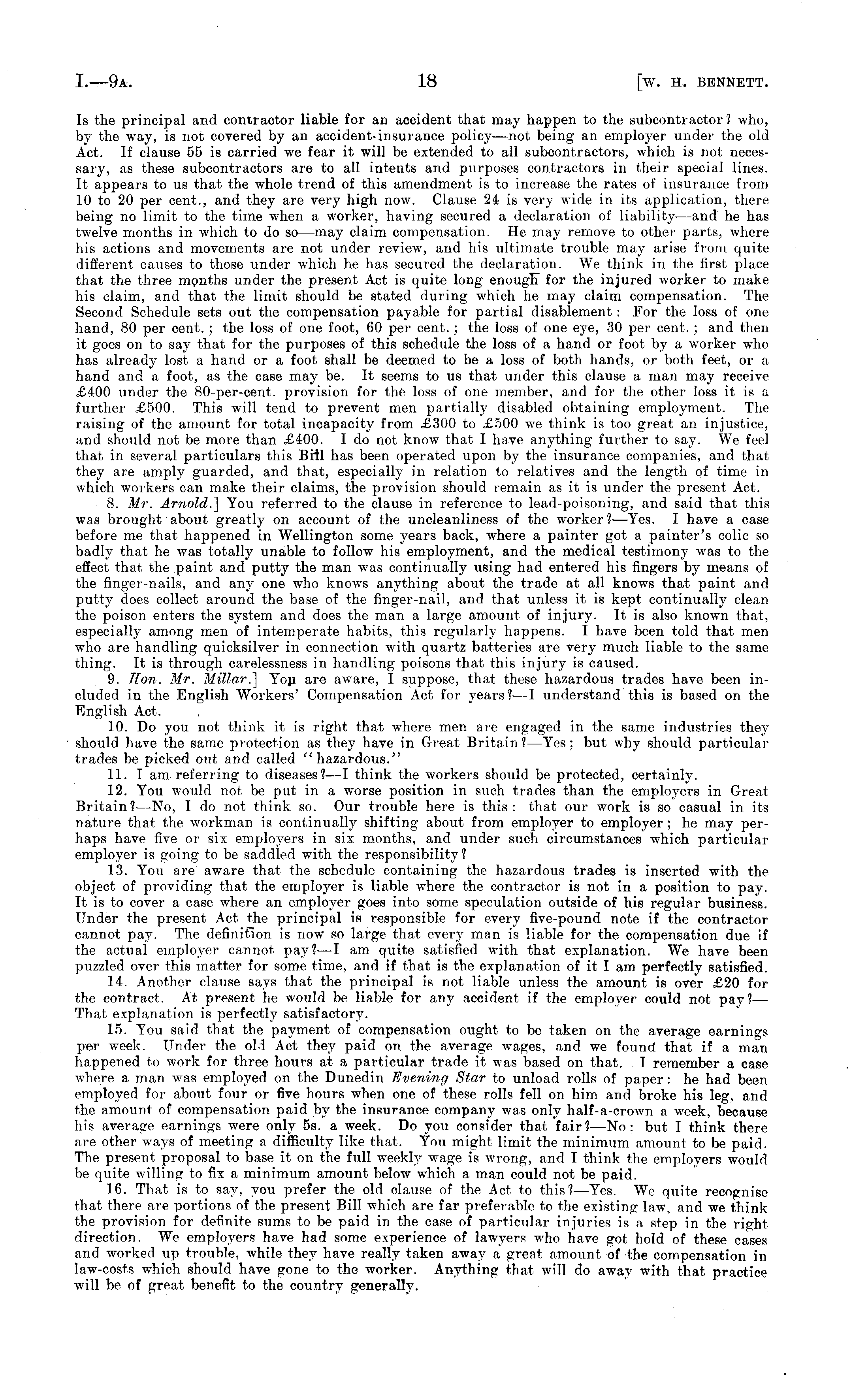 Is the principal and contractor liable for an accident that may happen to the subcontractor? who, by the way, is not covered by an accident-insurance policy—not being an employer under the old Act. If clause 55 is carried we fear it will be extended to all subcontractors, which is not necessary, as these subcontractors are to all intents and purposes contractors in their special lines. It appears to us that the whole trend of this amendment is to increase the rates of insurance from 10 to 20 per cent., and they are very high now. Clause 24 is very wide in its application, there being no limit to the time when a worker, having secured a declaration of liability—and he has twelve months in which to do so—may claim compensation. He may remove to other parts, where his actions and movements are not under review, and his ultimate trouble may arise from quite different causes to those under which he has secured the declaration. We think in the first place that the three months under the present Act is quite long enough - for the injured worker to make his claim, and that the limit should be stated during which he may claim compensation. The Second Schedule sets out the compensation payable for partial disablement : For the loss of one hand, 80 per cent. ; the loss of one foot, 60 per cent.; the loss of one 30 per cent. ; and then it goes on to say that for the purposes of this schedule the loss of a hand or foot by a worker who has already lost a hand or a foot shall be deemed to be a loss of both hands, or both feet, or a hand and a foot, as the case may be. It seems to us that under this clause a man may receive £400 under the 80-per-cent. provision for the loss of one member, and for the other loss it is a further £500. This will tend to prevent men partially disabled obtaining employment. The raising of the amount for total incapacity from £300 to £500 we think is too great an injustice, and should not be more than £400. Ido not know that I have anything further to say. We feel that in several particulars this Bill has been operated upon by the insurance companies, and that they are amply guarded, and that, especially in relation to relatives and the length of time in which workers can make their claims, the provision should remain as it is under the present Act. 8. Mr. Arnold.] You referred to the clause in reference to lead-poisoning, and said that this was brought about greatly on account of the uncleanliness of the worker? —Yes. I have a case before me that happened in Wellington some years back, where a painter got a painter's colic so badly that he was totally unable to follow his employment, and the medical testimony was to the effect that the paint and putty the man was continually using had entered his fingers by means of the finger-nails, and any one who knows anything about the trade at all knows that paint and putty does collect around the base of the finger-nail, and that unless it is kept continually clean the poison enters the system and does the man a large amount of injury. It is also known that, especially among men of intemperate habits, this regularly happens. I have been told that men who are handling quicksilver in connection with quartz batteries are very much liable to the same thing. It is through carelessness in handling poisons that this injury is caused. 9. Hon. Mr. Millar.] You are aware, I suppose, that these hazardous trades have been included in the English Workers' Compensation Act for years?—l understand this is based on the English Act. 10. Do you not think it is right that where men are engaged in the same industries they should have the same protection as they have in Great Britain?— Yes; but why should particular trades be picked out and called "hazardous." 11. lam referring to diseases?—l think the workers should be protected, certainly. 12. You would not be put in a worse position in such trades than the employers in Great Britain?—No, I do not think so. Our trouble here is this: that our work is so casual in its nature that the workman is continually shifting about from employer to employer; he may perhaps have five or six employers in six months, and under such circumstances which particular employer is going to be saddled with the responsibility? 13. You are aware that the schedule containing the hazardous trades is inserted with the object of providing that the employer is liable where the contractor is not in a position to pay. It is to cover a case where an employer goes into some speculation outside of his regular business. Under the present Act the principal is responsible for every five-pound note if the contractor cannot pay. The definition is now so large that every man is liable for the compensation due if the actual employ-er cannot pay?—l am quite satisfied with that explanation. We have been puzzled over this matter for some time, and if that is the explanation of it I am perfectly satisfied. 14. Another clause says that the principal is not liable unless the amount is over £20 for the contract. At present he would be liable for any accident if the employer could not pay?— That explanation is perfectly satisfactory. 15. You said that the payment of compensation ought to be taken on the average earnings per yveek. Under the old Act they paid on the average wages, and we found that if a man happened to work for three hours at a particular trade it was based on that. I remember a case where a man was employed on the Dunedin Evening Star to unload rolls of paper : he had been employed for about four or five hours when one of these rolls fell on him and broke his leg, and the amount of compensation paid by the insurance company was only half-a-crown a week, because his average earnings were only ss. a week. Do you consider that fair?—No: but I think there are other ways of meeting a difficulty like that. You might limit the minimum amount to be paid. The present proposal to base it, on the full weekly wage is wro