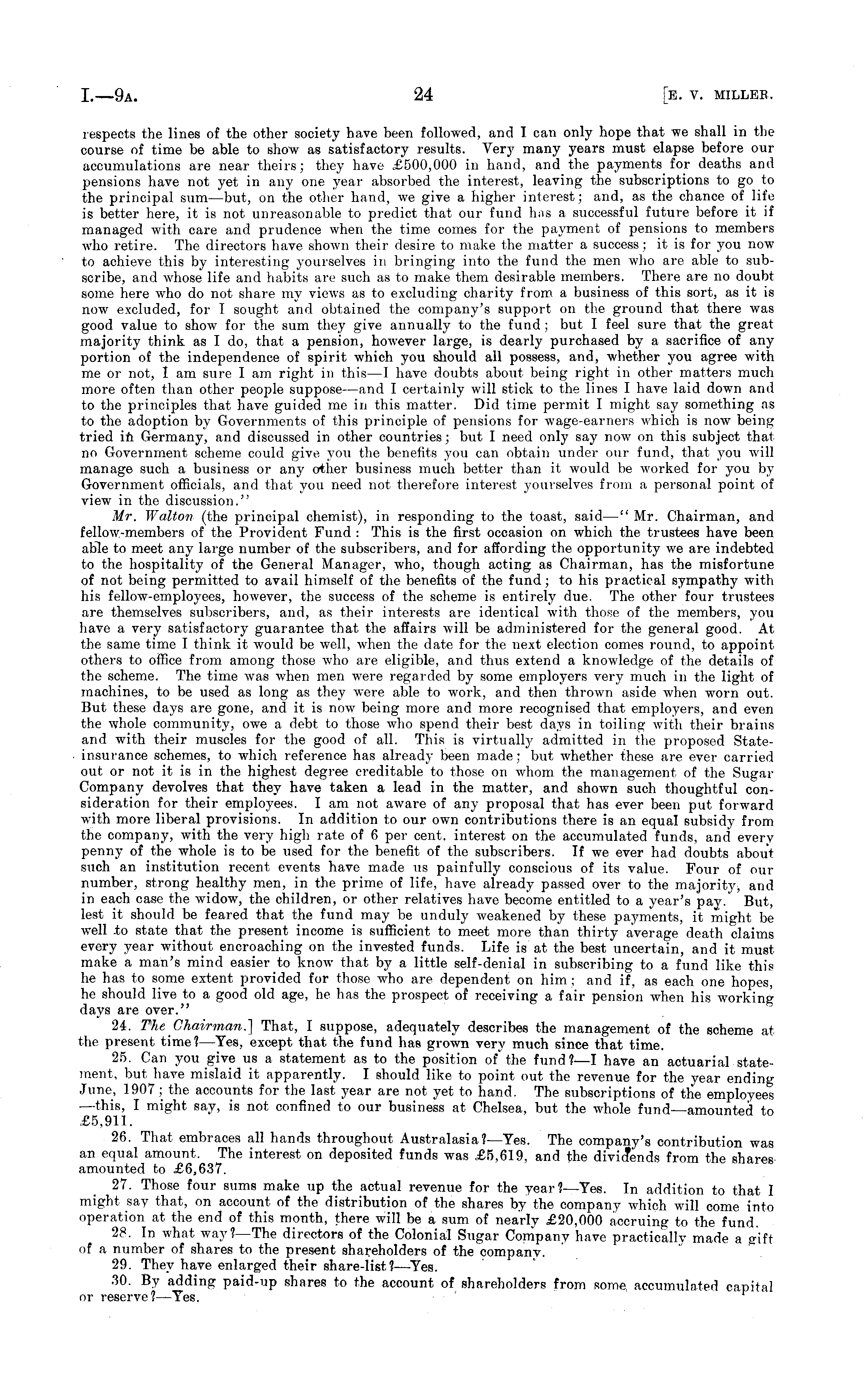 respects the lines of the other society have been followed, and I can only hope that we shall in the course of time be able to show as satisfactory results. Very many years must elapse before our accumulations are near theirs; they have £500,000 in hand, and the payments for deaths and pensions have not yet in any one year absorbed the interest, leaving the subscriptions to go to the principal sum —but, on the other hand, we give a higher interest; and, as the chance of life is better here, it is not unreasonable to predict that our fund has a successful future before it if managed with care and prudence when the time comes for the payment of pensions to members who retire. The directors have shown their desire to make the matter a success; it is for you now to achieve this by interesting yourselves in bringing into the fund the men who are able to subscribe, and whose life and habits are such as to make them desirable members. There are no doubt some here who do not share my view.s us to excluding charity from a business of this sort, as it is now excluded, for I sought and obtained the company's support on the ground that there was good value to show for the sum they give annually to the fund; but I feel sure that the great majority think as I do, that a pension, however large, is dearly purchased by a sacrifice of any portion of the independence of spirit which you should all possess, and, whether you agree with me or not, lam sure lam right in this—l have doubts about being right in other matters much more often than other people suppose—and I certainly will stick to the lines I have laid down and to the principles that have guided me in this matter. Did time permit I might say something as to the adoption by Governments of this principle of pensions for wage-earners which is now being tried in Germany, and discussed in other countries; but I need only say now on this subject that no Government scheme could give you the benefits you can obtain under our fund, that you will manage such a business or any other business much better than it would be worked for you by Government officials, and that you need not therefore interest yourselves from a personal point of view in the discussion." Mr. Walton (the principal chemist), in responding to the toast, said —" Mr. Chairman, and fellow-members of the Provident Fund : This is the first occasion on which the trustees have been able to meet any large number of the subscribers, and for affording the opportunity we are indebted to the hospitality of the General Manager, who, though acting as Chairman, has the misfortune of not being permitted to avail himself of the benefits of the fund; to his practical sympathy with his fellow-employees, however, the success of the scheme is entirely due. The other four trustees are themselves subscribers, and, as their interests are identical with those of the members, you have a very satisfactory guarantee that the affairs will be administered for the general good. At the same time I think it would be well, when the date for the next election comes round, to appoint others to office from among those who are eligible, and thus extend a knowledge of the details of the scheme. The time was when men were regarded by some employers very much in the light of machines, to be used as long as they were able to work, and then thrown aside when worn out. But these days are gone, and it is now being more and more recognised that employers, and even the whole community, owe a debt to those who spend their best days in toiling with their brains and with their muscles for the good of all. This is virtually admitted in the proposed Stateinsurance schemes, to which reference has already been made; but whether these are ever carried out or not it is in the highest degree creditable to those on whom the management of the Sugar Company devolves that they have taken a lead in the matter, and shown such thoughtful consideration for their employees. I am not aware of any proposal that has ever been put forward with more liberal provisions. In addition to our own contributions there is an equal subsidy from the company, with the very high rate of 6 per cent, interest on the accumulated funds, and every penny of the whole is to be used for the benefit of the subscribers. If we ever had doubts about such an institution recent events have made us painfully conscious of its value. Four of our number, strong healthy men, in the prime of life, have already passed over to the majority, and in each case the widow, the children, or other relatives have become entitled to a year's pay. But, lest it should be feared that the fund may be unduly weakened by these paj'ments, it might be well .to state that the present income is sufficient to meet more than thirty average death claims every year without encroaching on the invested funds. Life is at the best uncertain, and it must make a man's mind easier to know that by a little self-denial in subscribing to a fund like this he has to some extent provided for those who are dependent on him ; and if, as each one hopes, he should live to a good old age, he has the prospect of receiving a fair pension when his working days are over." 24. The Chairman.] That, I suppose, adequately describes the management of the scheme at the present time?— Yes, except that the fund has grown very much since that time. 25. Can you give us a statement as to the position of the fund?—l have an actuarial statement, but have mislaid it apparently. I should like to point out the revenue for the year ending June, 1907 ;_ the accounts for the last year are not yet to hand. The subscriptions of the employees ■—this, I might say, is not confined to our business at Chelsea, but the whole fund —amounted to £5,911. 26. That embraces all hands throughout Australasia?— Yes. The company's contribution was an equal amount. The interest on deposited funds was £5,619, and the dividends from the shares amounted 