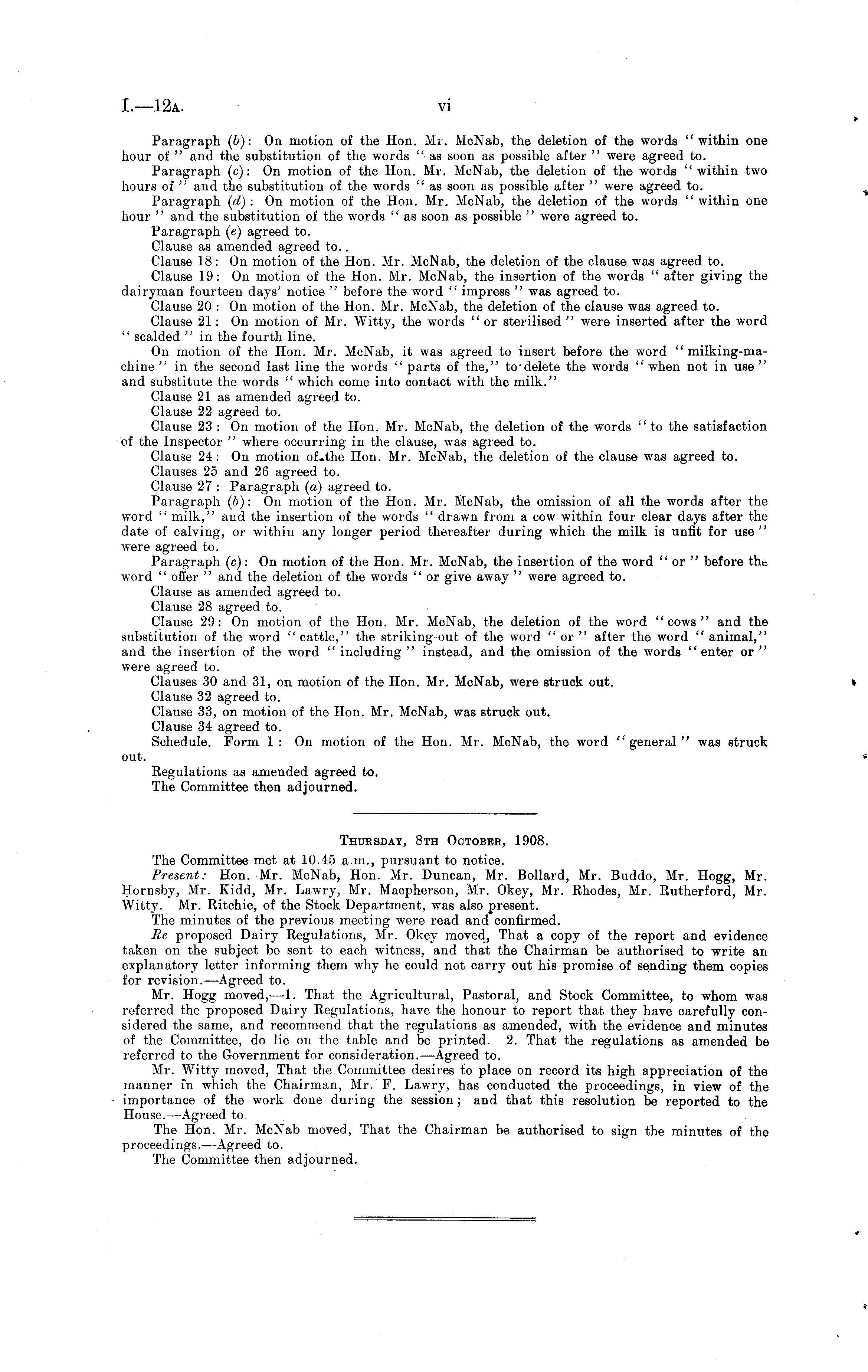 Thursday, Bth October, 1908. The Committee met at 10.45 a.m., pursuant to notice. Present: Hon. Mr. McNab, Hon. Mr. Duncan, Mr. Bollard, Mr. Buddo, Mr. Hogg, Mr. Hornsby, Mr. Kidd, Mr. Lawry, Mr. Macpherson, Mr. Okey, Mr. Rhodes, Mr. Rutherford, Mr. Witty. Mr. Ritchie, of the Stock Department, was also present. The minutes of the previous meeting were read and confirmed. Re proposed Dairy Regulations, Mr. Okey moved, That a copy of the report and evidence taken on the subject be sent to each witness, and that the Chairman be authorised to write an explanatory letter informing them why he could not carry out his promise of sending them copies for revision.—Agreed to. Mr. Hogg moved, —1. That the Agricultural, Pastoral, and Stock Committee, to whom was referred the proposed Dairy Regulations, have the honour to report that they have carefully considered the same, and recommend that the regulations as amended, with the evidence and minutes of the Committee, do lie on the table and be printed. 2. That the regulations as amended be referred to the Government for consideration.—Agreed to. Mr. Witty moved, That the Committee desires to place on record its high appreciation of the manner in which the Chairman, Mr.'F. Lawry, has conducted the proceedings, in view of the importance of the work done during the session; and that this resolution be reported to the House.—Agreed to, The Hon. Mr. McNab moved, That the Chairman be authorised to sign the minutes of the proceedings.—Agreed to. The Committee then adjourned.