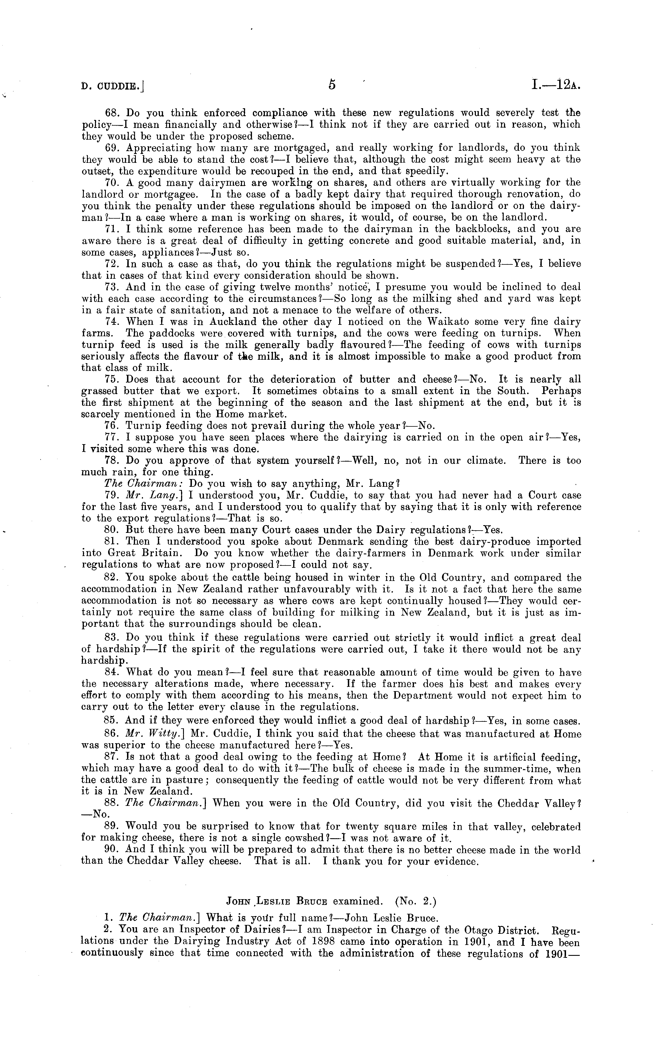68. Do you think enforced compliance with these new regulations would severely test the policy —I mean financially and otherwise? —I think not if they are carried out in reason, which they would be under the proposed scheme. 69. Appreciating how many are mortgaged, and really working for landlords, do you think they would be able to stand the cost?—l believe that, although the cost might seem heavy at the outset, the expenditure would be recouped in the end, and that speedily. 70. A good many dairymen are working on shares, and others are virtually working for the landlord or mortgagee. In the case of a badly kept dairy that required thorough renovation, do you think the penalty under these regulations should be imposed on the landlord or on the dairyman '! —ln a case where a man is working on shares, it would, of course, be on the landlord. 71. I think some reference has been made to the dairyman in the backblocks, and you are aware there is a great deal of difficulty in getting concrete and good suitable material, and, in some cases, appliances? —Just so. 72. In such a case as that, do you think the regulations might be suspended?— Yes, I believe that in cases of that kind every consideration should be shown. 73. And in the case of giving twelve months' notice, I presume you would be inclined to deal with each case according to the circumstances? —So long as the milking shed and yard was kept in a fair state of sanitation, and not a menace to the welfare of others. 74. When I was in Auckland the other day I noticed on the Waikato some very fine dairy farms. The paddocks were covered with turnips, and the cows were feeding on turnips. When turnip feed is used is the milk generally badly flavoured ?—The feeding of cows with turnips seriously affects the flavour of tke milk, and it is almost impossible to make a good product from that class of milk. 75. Does that account for the deterioration of butter and cheese? —No. It is nearly all grassed butter that we export. It sometimes obtains to a small extent in the South. Perhaps the first shipment at the beginning of the season and the last shipment at the end, but it is scarcely mentioned in the Home market. 76. Turnip feeding does not prevail during the whole year?— No. 77. I suppose you have seen places where the dairying is carried on in the open air? —Yes, I visited some where this was done. 78. Do you approve of that system yourself? —Well, no, not in our climate. There is too much rain, for one thing. The Chairman: Do you wish to say anything, Mr. Lang? 79. Mr. Lang.] I understood you, Mr. Cuddie, to say that you had never had a Court case for the last five years, and I understood you to qualify that by saying that it is only with reference to the export regulations?— That is so. 80. But there have been many Court cases under the Dairy regulations? —Yes. 81. Then I understood you spoke about Denmark sending the best dairy-produce imported into Great Britain. Do you know whether the dairy-farmers in Denmark work under similar regulations to what are now proposed ?—I could not say. 82. You spoke about the cattle being housed in winter in the Old Country, and compared the accommodation in New Zealand rather unfavourably with it. Is it not a fact that here the same accommodation is not so necessary as where cows are kept continually housed?— They would certainly not require the same class of building for milking in New Zealand, but it is just as important that the surroundings should be clean. 83. Do you think if these regulations were carried out strictly it would inflict a great deal of hardship ?—lf the spirit of the regulations were carried out, I take it there would not be any hardship. 84. What do you mean?—l feel sure that reasonable amount of time would be given to have the necessary alterations made, where necessary. If the farmer does his best and makes every effort to comply with them according to his means, then the Department would not expect him to carry out to the letter every clause in the regulations. 85. And if they were enforced they would inflict a good deal of hardship?— Yes, in some cases. 86. Mr. Witty.] Mr. Cuddie, I think you said that the cheese that was manufactured at Home was superior to the cheese manufactured here? —Yes. 87. Is not that a good deal owing to the feeding at Home? At Home it is artificial feeding, which may have a good deal to do with it?— The bulk of cheese is made in the summer-time, when the cattle are in pasture; consequently the feeding of cattle would not be very different from what it is in New Zealand. 88. The Chairman.] When you were in the Old Country, did you visit the Cheddar Valley? —No. 89. Would you be surprised to know that for twenty square miles in that valley, celebrated for making cheese, there is not a single cowshed? —I was not aware of it. 90. And I think you will be prepared to admit that there is no better cheese made in the world than the Cheddar Valley cheese. That is all. I thank you for your evidence. John .Leslie Bbuce examined. (No. 2.) 1. The Chairman.] What is yoiir full name? —John Leslie Bruce. 2. You are an Inspector of Dairies?—l am Inspector in Charge of the Otago District. Regulations under the Dairying Industry Act of 1898 came into operation in 1901, and I have been continuously since that time connected with the administration of these regulations of 1901