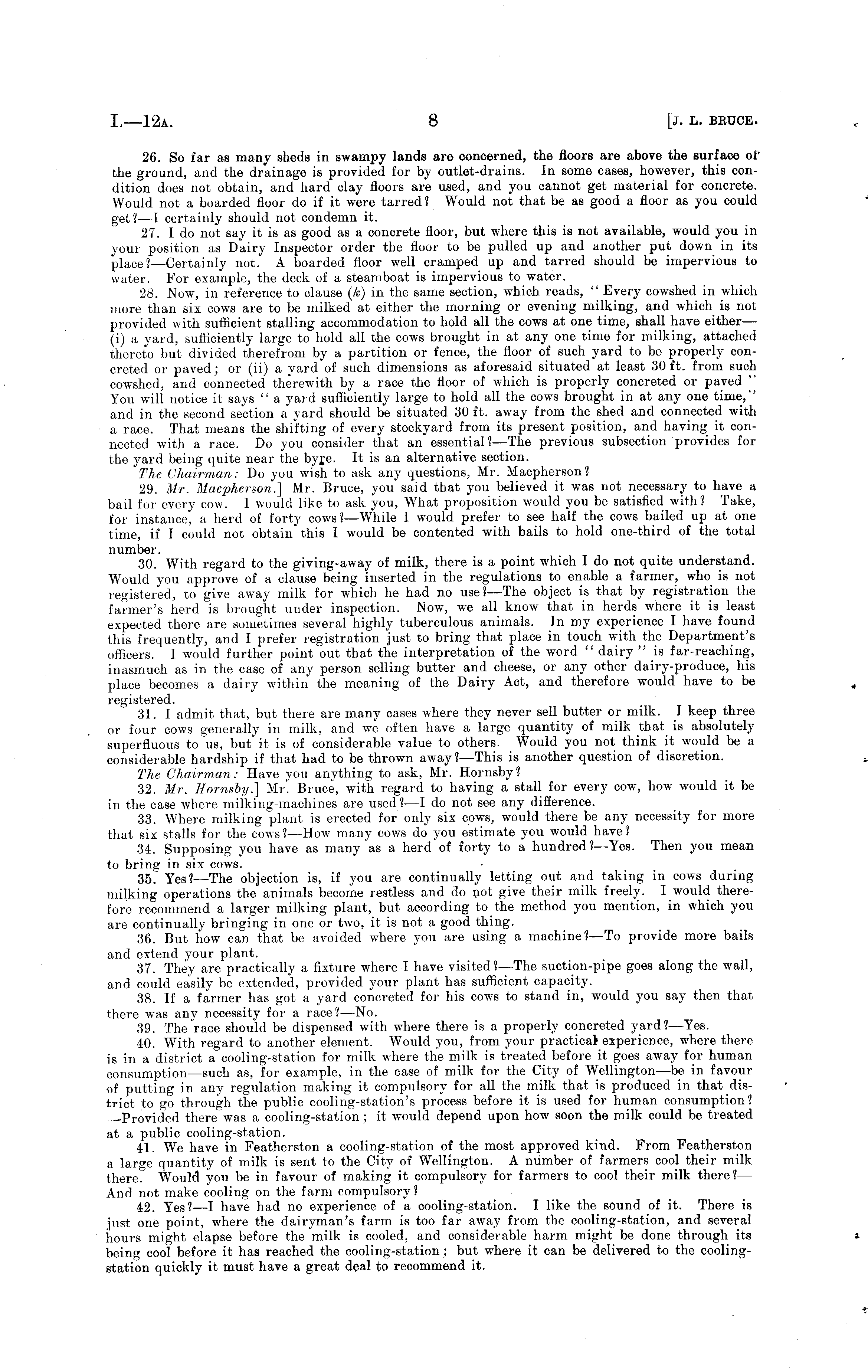 26. So far as many sheds in swampy lands are concerned, the floors are above the surface of the ground, and the drainage is provided for by outlet-drains. In some cases, however, this condition does not obtain, and hard clay floors are used, and you cannot get material for concrete. Would not a boarded floor do if it were tarred? Would not that be as good a floor as you could get?—l certainly should not condemn it. 27. I do not say it is as good as a concrete floor, but where this is not available, would you in your position as Dairy Inspector order the floor to be pulled up and another put down in its place I —Certainly not. A boarded floor well cramped up and tarred should be impervious to water. For example, the deck of a steamboat is impervious to water. 28. Now, in reference to clause (k) in the same section, which reads, " Every cowshed in which more than six cows are to be milked at either the morning or evening milking, and which is not provided with sufficient stalling accommodation to hold all the cows at one time, shall have either— (i) a yard, sufficiently large to hold all the cows brought in at any one time for milking, attached thereto but divided therefrom by a partition or fence, the floor of such yard to be properly concreted or paved; or (ii) a yard of such dimensions as aforesaid situated at least 30ft. from such cowshed, and connected therewith by a race the floor of which is properly concreted or paved You will notice it says " a yard sufficiently large to hold all the cows brought in at any one time,' , and in the second section a yard should be situated 30 ft. away from the shed and connected with a race. That means the shifting of every stockyard from its present position, and having it connected with a race. Do you consider that an essential? —The previous subsection provides for the yard being quite near the byj;e. It is an alternative section. The Chairman: Do you wish to ask any questions, Mr. Macpherson ? 29. Mr. Macpherson.] Mr. Bruce, you said that you believed it was not necessary to have a bail for every cow. I would like to ask you, What proposition would you be satisfied with? Take, for instance, a herd of forty cows?— While I would prefer to see half the cows bailed up at one time, if I could not obtain this I would be contented with bails to hold one-third of the total number. 30. With regard to the giving-away of milk, there is a point which I do not quite understand. Would you approve of a clause being inserted in the regulations to enable a farmer, who is not registered, to give away milk for which he had no use?— The object is that by registration the farmer's herd is brought under inspection. Now, we all know that in herds where it is least expected there are sometimes several highly tuberculous animals. In my experience I have found this frequently, and I prefer registration just to bring that place in touch with the Department's officers. I would further point out that the interpretation of the word " dairy "is far-reaching, inasmuch as in the case of any person selling butter and cheese, or any other dairy-produce, his place becomes a dairy within the meaning of the Dairy Act, and therefore would have to be registered. 31. I admit that, but there are many cases where they never sell butter or milk. I keep three or four cows generally in milk, and we often have a large quantity of milk is absolutely superfluous to us, but it is of considerable value to others. Would you not think it would be a considerable hardship if that had to be thrown away?— This is another question of discretion. The Chairman: Have you anything to ask, Mr. Hornsby? 32. Mr. Hornsby.] Mr. Bruce, with regard to having a stall for every cow, how would it be in the case where milking-machines are used? —I do not see any difference. 33. Where milking plant is erected for only six cows, would there be any necessity for more that six stalls for the cows?— How many cows do you estimate you would have? 34. Supposing you have as many as a herd of forty to a hundred? —Yes. Then you mean to bring in six cows. 35. Yes?— The objection is, if you are continually letting out and taking in cows during milking operations the animals become restless and do not give their milk freely. I would therefore recommend a larger milking plant, but according to the method you mention, in which you are continually bringing in one or two, it is not a good thing. 36. But how can that be avoided where you are using a machine? —To provide more bails and extend your plant. 37. They are practically a fixture where I have visited?— The suction-pipe goes along the wall, and could easily be extended, provided your plant has sufficient capacity. 38. If a farmer has got a yard concreted for his cows to stand in, would you say then that there was any necessity for a race?— No. 39. The race should be dispensed with where there is a properly concreted yard? —Yes. 40. With regard to another element. Would you, from your practica> experience, where there is in a district a cooling-station for milk where the milk is treated before it goes away for human consumption—such as, for example, in the case of milk for the City of Wellington—be in favour of putting in any regulation making it compulsory for all the milk that is produced in that district to go through the public cooling-station's process before it is used for human consumption? -Provided there was a cooling-station; it would depend upon how soon the milk could be treated at a public cooling-station. 41. We have in Featherston a cooling-station of the most approved kind. From Featherston a large quantity of milk is sent to the City of Wellington. A number of farmers cool their milk there. Would you be in favour of making it compulsory for farmers to cool their milk there?— And not make cooling on the farm compulsory ? 42. Yes? —I have had no experience of a cooling-station. I like the sound of it. There is just one point, wh