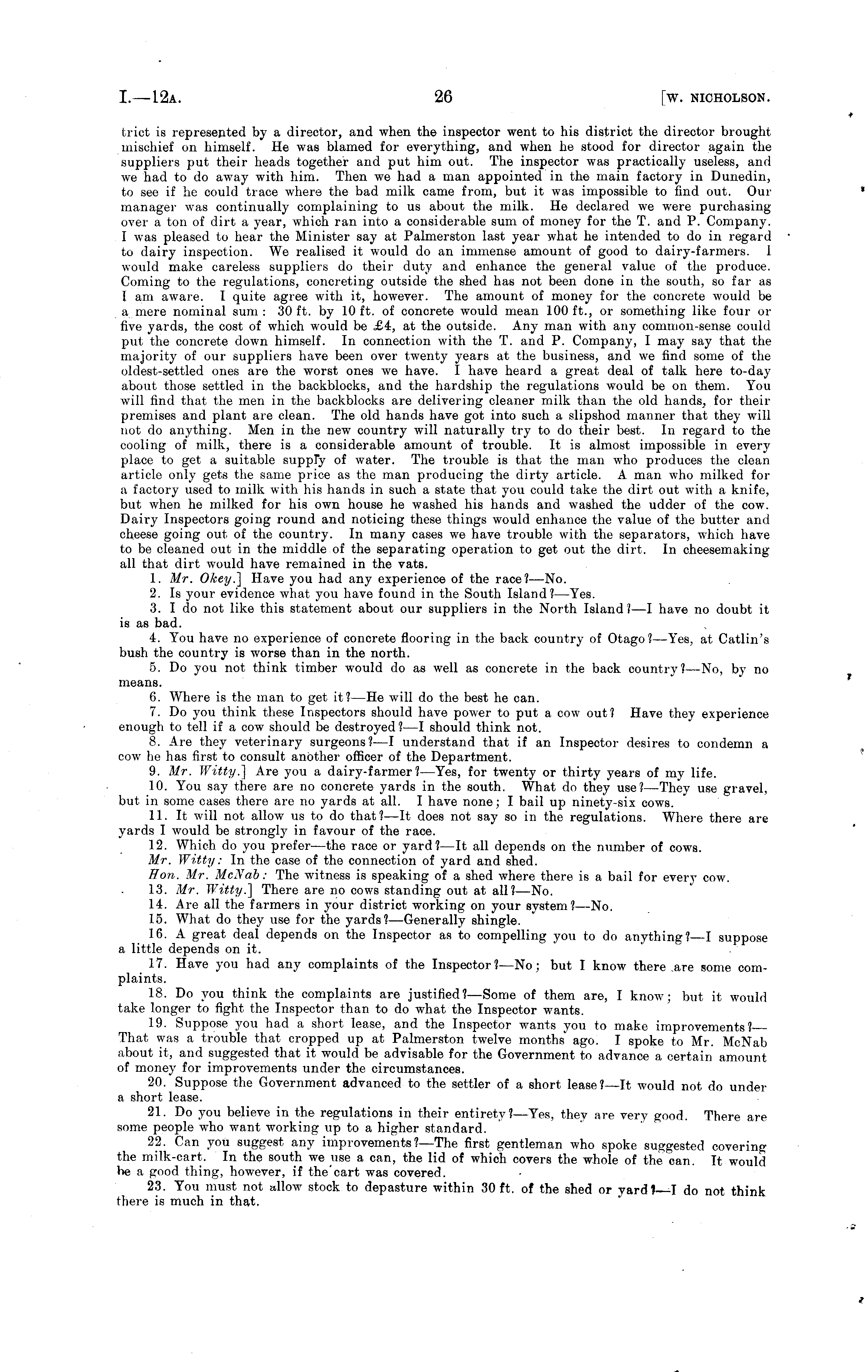 trict is represented by a director, and when the inspector went to his district the director brought mischief on himself. He was blamed for everything, and when he stood for director again the suppliers put their heads together and put him out. The inspector was practically useless, and we had to do away with him. Then we had a man appointed in the main factory in Dunedin, to see if he could trace where the bad milk came from, but it was impossible to find out. Our manager was continually complaining to us about the milk. He declared we were purchasing over a ton of dirt a year, which ran into a considerable sum of money for the T. and P. Company. I was pleased to hear the Minister say at Palmerston last year what he intended to do in regard to dairy inspection. We realised it would do an immense amount of good to dairy-farmers. 1 would make careless suppliers do their duty and enhance the general value of the produce. Coming to the regulations, concreting outside the shed has not been done in the south, so far as I am aware. I quite agree with it, however. The amount of money for the concrete would be a mere nominal sum: 30ft. by 10ft. of concrete would mean 100 ft., or something like four or five yards, the cost of which would be £4, at the outside. Any man with any common-sense could put the concrete down himself. In connection with the T. and P. Company, I may say that the majority of our suppliers have been over twenty years at the business, and we find some of the oldest-settled ones are the worst ones we have. I have heard a great deal of talk here to-day about those settled in the backblocks, and the hardship the regulations would be on them. You will find that the men in the backblocks are delivering cleaner milk than the old for their premises and plant are clean. The old hands have got into such a slipshod manner that they will not do anything. Men in the new country will naturally try to do their best. In regard to the cooling of milk, there is a considerable amount of trouble. It is almost impossible in every place to get a suitable suppfy of water. The trouble is that the man who produces the clean article only gets the same price as the man producing the dirty article. A man who milked for a factory used to milk with his hands in such a state that you could take the dirt out with a knife, but when he milked for his own house he washed his hands and washed the udder of the cow. Dairy Inspectors going round and noticing these things would enhance the value of the butter and cheese going out of the country. In many cases we have trouble with the separators, which have to be cleaned out in the middle of the separating operation to get out the dirt. In cheesemaking all that dirt would have remained in the vats. 1. Mr. Okey.] Have you had any experience of the race?— No. 2. Is your evidence what you have found in the South Island?— Yes. 3. I do not like this statement about our suppliers in the North Island? —I have no doubt it is as bad. 4. You have no experience of concrete flooring in the back country of Otago ?—Yes, at Catlin's bush the country is worse than in the north. 5. Do you not think timber would do as well as concrete in the back country?—No, by no means. 6. Where is the man to get it? —He will do the best he can. 7. Do you think these Inspectors should have power to put a cow out? Have they experience enough to tell if a cow should be destroyed ?—I should think not. 8. Are they veterinary surgeons?—l understand that if an Inspector desires to condemn a cow he has first to consult another officer of the Department. 9. Mr. Witty.] Are you a dairy-farmer?— Yes, for twenty or thirty years of my life. 10. You say there are no concrete yards in the south. What do they use?— They use gravel, but in some cases there are no yards at all. I have none; I bail up ninety-six cows. 11. It will not allow us to do that? —It does not say so in the regulations. Where there are yards I would be strongly in favour of the race. 12. Which do you prefer—the race or yard? —It all depends on the number of cows. Mr. Witty: In the case of the connection of yard and shed. Hon. Mr. McNab: The witness is speaking of a shed where there is a bail for everj cow. 13. Mr. Witty.] There are no cows standing out at all?— No. 14. Are all the farmers in your district working on your system?— No. 15. What do they use for the yards?— Generally shingle. 16. A great deal depends on the Inspector as to compelling you to do anything?—l suppose a little depends on it. 17. Have you had any complaints of the Inspector?—No; but I know there are some complaints. 18. Do you think the complaints are justified?— Some of them are, T know; but it would take longer to fight the Inspector than to do what the Inspector wants. 19. Suppose you had a short lease, and the Inspector wants you to make improvements? That was a trouble that cropped up at Palmerston twelve months ago. I spoke to Mr. McNab about it, and suggested that it would be advisable for the Government to advance a certain amount of money for improvements under the circumstances. 20. Suppose the Government advanced to the settler of a short lease?—lt would not do under a short lease. 21. Do you believe in the regulations in their entirety?— Yes, they are very good. There are some people who want working up to a higher standard. 22. Can you suggest any improvements?— The first gentleman who spoke suggested covering the milk-cart. In the south we use a can, the lid of which covers the whole of the can. Tt would he a good thing, however, if the cart was covered. 23. You must not allow stock to depasture within 30 ft. of the shed or yard 1 Ido not think there is much in that.
