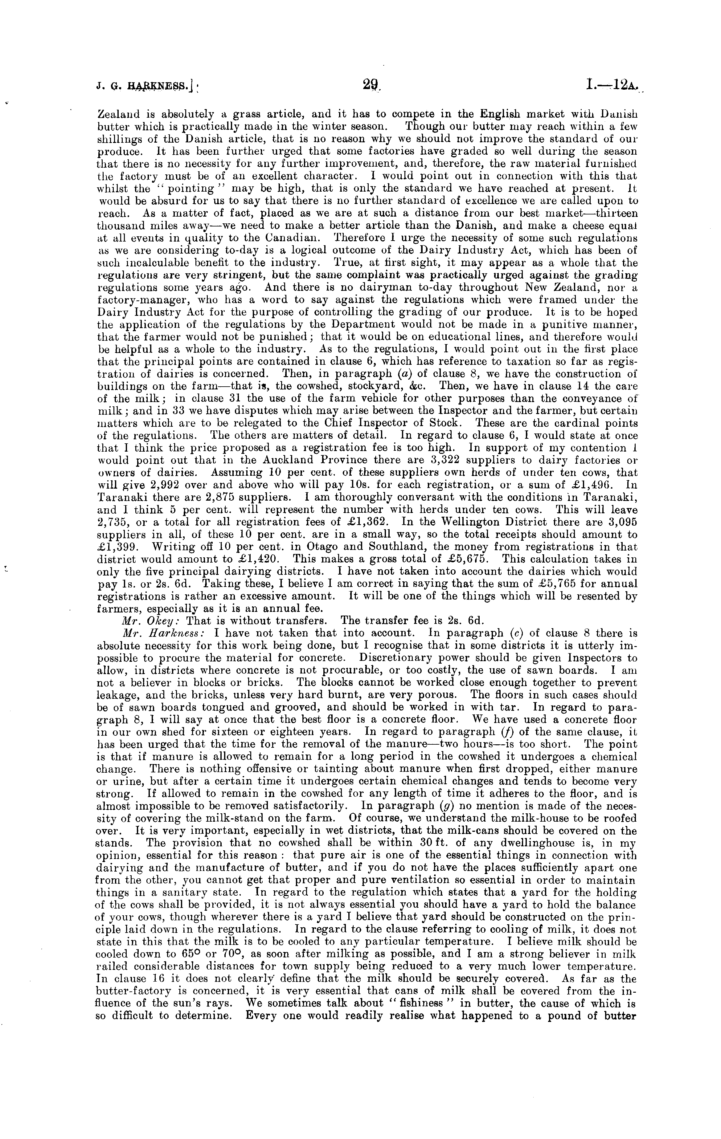 Zealand is absolutely a grass article, and it has to compete in the English market with Danish butter which is practically made in the winter season. Though our butter may reach within a few shillings of the Danish article, that is no reason why we should not improve the standard of our produce. It has been further urged that some factories have graded so well during the season that there is no necessity for any further improvement, and, therefore, the raw material furnished the factory must be of an excellent character. I would point out in connection with this that whilst the "pointing" may be high, that is only the standard we have reached at present. It would be absurd for us to say that there is no further standard of excellence we are called upon to reach. As a matter of fact, placed as we are at such a distance from our best market—thirteen thousand miles away —we need to make a better article than the Danish, and make a cheese equal at all events in quality to the Canadian. Therefore 1 urge the necessity of some such regulations as we are considering to-day is a logical outcome of the Dairy Industry Act, which has been of such incalculable benefit to the industry. True, at first sight, it may appear as a whole that the regulations are very stringent, but the same complaint was practically urged against the grading regulations some years ago. And there is no dairyman to-day throughout New Zealand, nor a factory-manager, who has a word to say against the regulations which were framed under the Dairy Industry Act for the purpose of controlling the grading of our produce. It is to be hoped the application of the regulations by the Department would not be made in a punitive manner, that the farmer would not be punished; that it would be on educational lines, and therefore would be helpful as a whole to the industry. As to the regulations, 1 would point out in the first place that the principal points are contained in clause 6, which has reference to taxation so far as registration of dairies is concerned. Then, in paragraph (a) of clause 8, we have the construction of buildings on the farm—that is, the cowshed, stockyard, &c. Then, we have in clause 14 the care of the milk; in clause 31 the use of the farm vehicle for other purposes than the conveyance of milk; and in 33 we have disputes which may arise between the Inspector and the farmer, but certain matters which are to be relegated to the Chief Inspector of Stock. These are the cardinal points of the regulations. The others are matters of detail. In regard to clause 6, I would state at once that I think the price proposed as a registration fee is too high. In support of my contention 1 would point out that in the Auckland Province there are 3,322 suppliers to dairy factories or owners of dairies. Assuming 10 per cent, of these suppliers own herds of under ten cows, that will give 2,992 over and above who will pay 10s. for each registration, or a sum of £1,496. In Taranaki there are 2,875 suppliers. lam thoroughly conversant with the conditions in Taranaki, and I think 5 per cent, will represent the number with herds under ten cows. This will leave 2,735, or a total for all registration fees of £1,362. In the Wellington District there are 3,095 suppliers in all, of these 10 per cent, are in a small way, so the total receipts should amount to £1,399. Writing off 10 per cent, in Otago and Southland, the money from registrations in that district would amount to £1,420. This makes a gross total of £5,675. This calculation takes in only the five principal dairying districts. I have not taken into account the dairies which would pay Is. or 2s. 6d. Taking these, I believe lam correct in saying that the sum of £5,765 for annual registrations is rather an excessive amount. It will be one of the things which will be resented by farmers, especially as it is an annual fee. Mr. Okey: That is without transfers. The transfer fee is 2s. 6d. Mr. Harkness: I have not taken that into account. In paragraph (c) of clause 8 there is absolute necessity for this work being done, but I recognise that in some districts it is utterly impossible to procure the material for concrete. Discretionary power should be given Inspectors to allow, in districts where concrete is not procurable, or too costly, the use of sawn boards. I am not a believer in blocks or bricks. The blocks cannot be worked close enough together to prevent leakage, and the bricks, unless very hard burnt, are very porous. The floors in such cases should be of sawn boards tongued and grooved, and should be worked in with tar. In regard to paragraph 8, 1 will say at once that the best floor is a concrete floor. We have used a concrete floor in our own shed for sixteen or eighteen years. In regard to paragraph (/) of the same clause, it has been urged that the time for the removal of the manure—two hours—is too short. The point is that if manure is allowed to remain for a long period in the cowshed it undergoes a chemical change. There is nothing offensive or tainting about manure when first dropped, either manure or urine, but after a certain time it undergoes certain chemical changes and tends to become very strong. If allowed to remain in the cowshed for any length of time it adheres to the floor, and is almost impossible to be removed satisfactorily. In paragraph (g) no mention is made of the necessity of covering the milk-stand on the farm. Of course, we understand the milk-house to be roofed over. It is very important, especially in wet districts, that the milk-cans should be covered on the stands. The provision that no cowshed shall be within 30 ft. of any dwellinghouse is, in my opinion, essential for this reason : that pure air is one of the essential things in connection with dairying and the manufacture of butter, and if you do not have the places sufficiently apart one from the other, you cannot get that proper and pure ventilation so essential in order to maintain thi