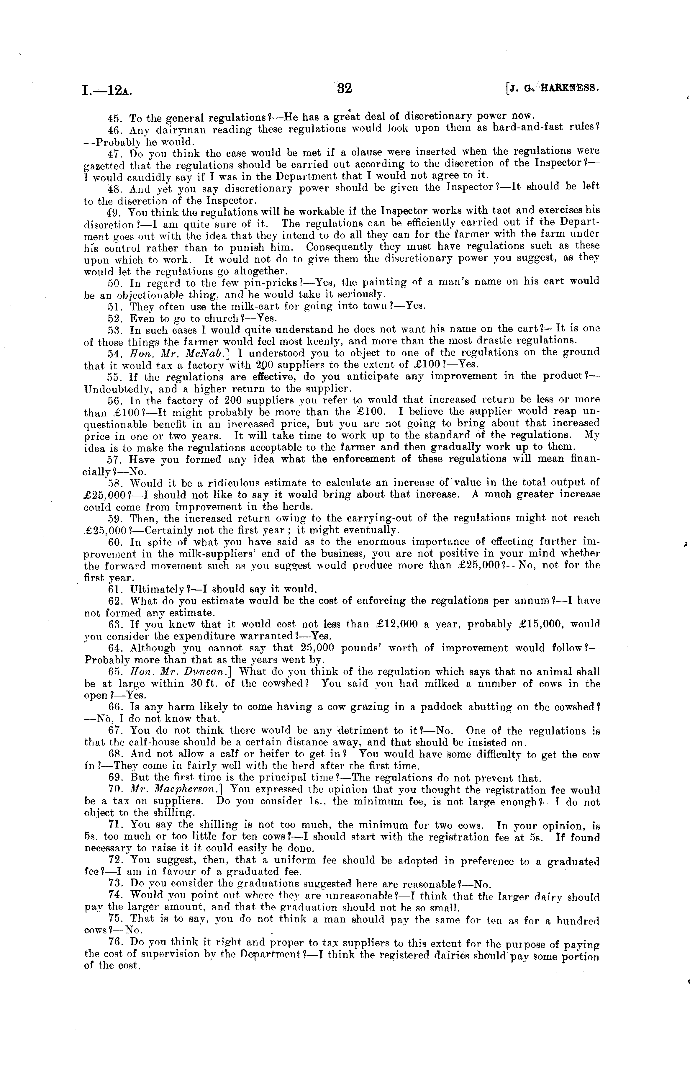 45. To the general regulations? —He has a great deal of discretionary power now. 46. Any dairyman reading these regulations would Jook upon them as hard-and-fast rules? —Probably he would. 47. Do you think the case would be met if a clause were inserted when the regulations were gazetted that the regulations should be carried out according to the discretion of the Inspector?— I would candidly say if I was in the Department that I would not agree to it. 48. And yet you say discretionary power should be given the Inspector?—lt should be left to the discretion of the Inspector. 49. You think the regulations will be workable if the Inspector works with tact and exercises his discretion?—l am quite sure of it. The regulations can be efficiently carried out if the Department goes out with the idea that they intend to do all they can for the farmer with the farm under his control rather than to punish him. Consequently they must have regulations such as these upon which to work. It would not do to give them the discretionary power you suggest, as they would let the regulations go altogether. 50. In regard to the few pin-pricks? —Yes, the painting of a man's name on his cart would be an objectionable thing, and he would take it seriously. 51. They often use the milk-cart for going into town?— Yes. 52. Even to go to church? —Yes. 58. In such cases I would quite understand he does not want his name on the cart? —It is one of those things the farmer would feel most keenly, and more than the most drastic regulations. 54. Hon. Mr, McNab.] I understood you to object to one of the regulations on the ground that it would tax a factory with 2.00 suppliers to the extent of .£loo?—Yes. 55. If the regulations are effective, do you anticipate any improvement in the product?— Undoubtedly, and a higher return to the supplier. 56. In the factory of 200 suppliers you refer to would that increased return be less or more than £100?— It might probably be more than the £100. I believe the supplier would reap unquestionable benefit in an increased price, but you are not going to bring about that increased price in one or two years. It will take time to work up to the standard of the regulations. My idea is to make the regulations acceptable to the farmer and then gradually work up to them. 57. Have you formed any idea what the enforcement of these regulations will mean financially? —No. 58. Would it be a ridiculous estimate to calculate an increase of value in the total output of £25,000? —I should not like to say it would bring about that increase. A much greater increase could come from improvement in the herds. 59. Then, the increased return owing to the carrying-out of the regulations might not reach £25,000? —Certainly not the first year; it might eventually. 60. In spite of what you have said as to the enormous importance of effecting further improvement in the milk-suppliers' end of the business, you are not positive in your mind whether the forward movement such as you suggest would produce more than £25,000? —No, not for the first year. 61. Ultimately?—l should say it would. 62. What do you estimate would be the cost of enforcing the regulations per annum?—l have not formed any estimate. 63. If you knew that it would cost not less than £12,000 a year, probably £15,000, would you consider the expenditure warranted? —Yes. 64. Although you cannot say that 25,000 pounds' worth of improvement would follow? — Probably more than that as the years went by. 65. Hon. Mr. Duncan.] What do you think of the regulation which says that no animal shall be at large within 30ft. of the cowshed? You said you had milked a number of cows in the open ?—Yes. 66. Is any harm likely to come having a cow grazing in a paddock abutting on the cowshed? —No, I do not know that. 67. You do not think there would be any detriment to it?— No. One of the regulations is that the calf-house should be a certain distance away, and that should be insisted on. 68. And not allow a calf or heifer to get in? You would have some difficulty to get the cow in ?—They come in fairly well with the herd after the first time. 69. But the first time is the principal time?— The regulations do not prevent that. 70. Mr. Macpherson.~\ You expressed the opinion that you thought the registration fee would be a tax on suppliers. Do you consider Is., the minimum fee, is not large enough?—l do not object to the shilling. 71. You say the shilling is not too much, the minimum for two cows. In your opinion, is ss. too much or too little for ten cows?—l should start with the registration fee at ss. If found necessary to raise it it could easily be done. 72. You suggest, then, that a uniform fee should be adopted in preference to a graduated fee? —I am in favour of a graduated fee. 73. Do you consider the graduations suggested here are reasonable?— No. 74. Would you point out where they are unreasonable?—l think that the larger dairy should pay the larger amount, and that the graduation should not be so small. 75. That is to say, you do not think a roan should pay the same for ten as for a hundred cows?— No. 76. Do you think it right and proper to tax suppliers to this extent for the purpose of paying the cost of supervision by the Department?—l think the registerpd dairies should pay some portion of the cost.