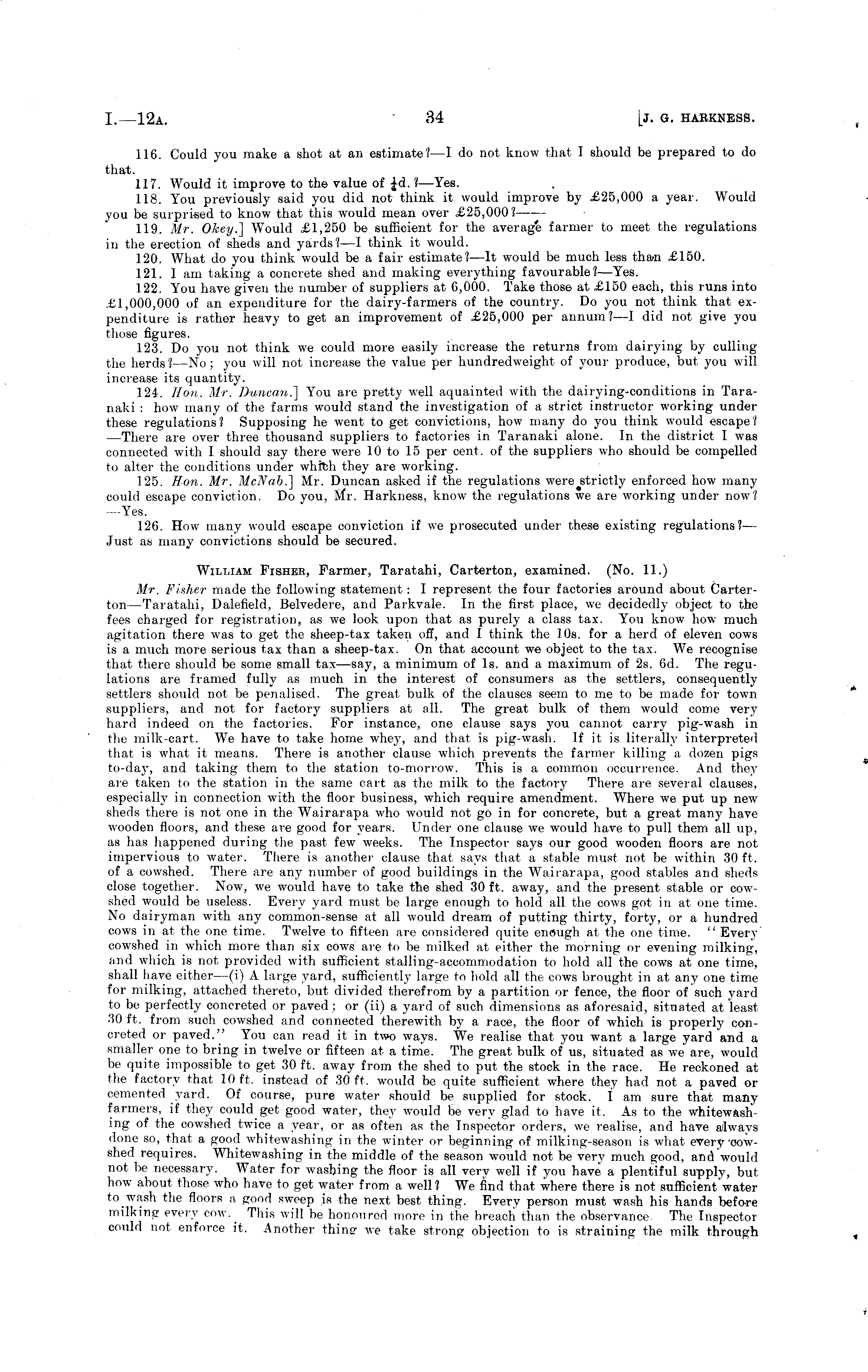 116. Could you make a shot at an estimate? —I do not know that I should be prepared to do that. 117. Would it improve to the value of £d. I —Yes. 118. You previously said you did not think it would improve by £25,000 a year. Would you be surprised to know that this would mean over £25,000 2 119. Mr. Okey.] Would £1,250 be sufficient for the average farmer to meet the regulations in the erection of sheds and yards?—l think it would. 120. What do you think would be a fair estimate? —It would be much less tha-n £150. 121. I am taking a concrete shed and making everything favourable? —Yes. 122. You have given the number of suppliers at 6,000. Take those at £150 each, this runs into £1,000,000 of an expenditure for the dairy-farmers of the country. Do you not think that expenditure is rather heavy to get an improvement of £25,000 per annum? —I did not give you those figures. 123. Do you not think we could more easily increase the returns from dairying by culling the herds ?—No ; you will not increase the value per hundredweight of your produce, but you will increase its quantity. 124. Hon. Mr. Duncan.] You are pretty well aquainted with the dairying-conditions in Taranaki : how many of the farms would stand the investigation of a strict instructor working under these regulations? Supposing he went to get convictions, how many do you think would escape? —There are over three thousand suppliers to factories in Taranaki alone. In the district I was connected with I should say there were 10 to 15 per cent, of the suppliers who should be compelled to alter the conditions under whffch they are working. 125. Hon. Mr. McNab.~\ Mr. Duncan asked if the regulations were strictly enforced how many could escape conviction. Do you, Kfr. Harkness, know the regulations we are working under now ! —Yes. 126. How many would escape conviction if we prosecuted under these existing regulations?— Just as many convictions should be secured. William Fisher, Farmer, Taratahi, Carterton, examined. (No. 11.) Mr. Fisher made the following statement : I represent the four factories around about Carterton—Taratahi, Dalefield, Belvedere, and Parkvale. In the first place, we decidedly object to the fees charged for registration, as we look upon that as purely a class tax. You know how much agitation there was to get the sheep-tax taken off, and I think the 10s. for a herd of eleven cows is a much more serious tax than a sheep-tax. On that account we object to the tax. We recognise that there should be some small tax —say, a minimum of Is. and a maximum of 2s. 6d. The regulations are framed fully as much in the interest of consumers as the settlers, consequently settlers should not be penalised. The great bulk of the clauses seem to me to be made for town suppliers, and not for factory suppliers at all. The great bulk of them would come very hard indeed on the factories. For instance, one clause says you cannot carry pig-wash in the milk-cart. We have to take home whey, and that is pig-wash. If it is literally interpreted that is what it means. There is another clause which prevents the farmer killing a dozen pigs to-day, and taking them to the station to-morrow. This is a common occurrence. And they are taken to the station in the same cart as the milk to the factory There are several clauses, especially in connection with the floor business, which require amendment. Where we put up new sheds there is not one in the Wairarapa who would not go in for concrete, but a great many have wooden floors, and these are good for years. Under one clause we would have to pull them all up, as has happened during the past few weeks. The Inspector says our good wooden floors are not impervious to water. There is another clause that says that a stable must not be within 30 ft. of a cowshed. There are any number of good buildings in the Wairarapa, good stables and sheds close together. Now, we would have to take the shed 30 ft. away, and the present stable or cowshed would be useless. Every yard must be large enough to hold all the cows got in at one time. No dairyman with any common-sense at all would dream of putting thirty, forty, or a hundred cows in at the one time. Twelve to fifteen are considered quite enough at the one time. " Every cowshed in which more than six cows are to be milked at either the morning or evening milking, ami which is not provided with sufficient stalling-accommodation to hold all the cows at one time, shall have either—(i) A large yard, sufficiently large to hold all the cows brought in at any one time for milking, attached thereto, but divided therefrom by a partition or fence, the floor of such yard to be perfectly concreted or paved; or (ii) a yard of such dimensions as aforesaid, situated at least 30 ft. from such cowshed and connected therewith by a race, the floor of which is properly concreted or paved." You can read it in two ways. We realise that you want a large yard and a smaller one to bring in twelve or fifteen at a time. The great bulk of us, situated as we are, would be quite impossible to get 30 ft. away from the shed to put the stock in the race. He reckoned at the factory that 10 ft. instead of 30 ft. would be quite sufficient where they had not a paved or cemented yard. Of course, pure water should be supplied for stock. I am sure that many farmers, if they couldget good water, they would be very glad to have it. As to the whitewashing of the cowshed twice a year, or as often as the Inspector orders, we realise, and have always done so, that a good whitewashing in the winter or beginning of milk ing-season is what every cowshed requires. Whitewashing in the middle of the season would not be very much good, and would not be necessary. Water for washing the floor is all very well if you have a plentiful supply, but how about those who have to get water from a well? We find that where there is not sufficient'water to wash the floors n good sweep is the next best t