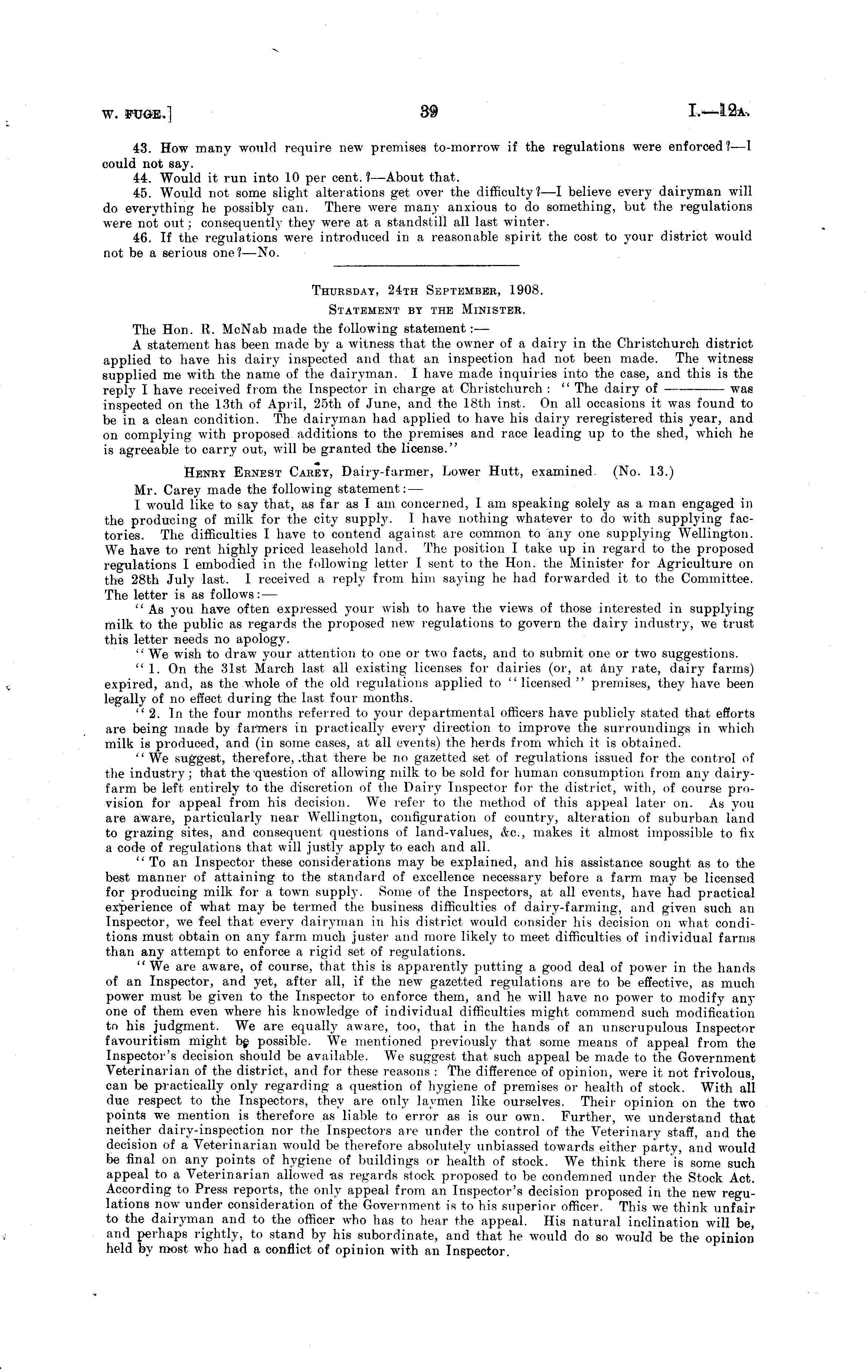 Thursday, 24th September, 1908. Statement bt the Minister. The Hon. R. McNab made the following statement :— A statement has been made by a witness that the owner of a dairy in the Christchurch district applied to have his dairy inspected and that an inspection had not been made. The witness supplied me with the name of the dairyman. I have made inquiries into the case, and this is the reply I have received from the Inspector in charge at Christchurch : " The dairy of was inspected on the 13th of April, 25th of June, and the 18th inst. On all occasions it was found to be in a clean condition. The dairyman had applied to have his dairy reregistered this year, and on complying with proposed additions to the premises and race leading up to the shed, which he is agreeable to carry out, will be granted the license." Henry Ernest Carey, Dairy-farmer, Lower Hutt, examined (No. 13.) Mr. Carey made the following statement: — I would like to say that, as far as I am concerned, I am speaking solely as a man engaged in the producing of milk for the city supply. 1 have nothing whatever to do with supplying factories. The difficulties I have to contend against are common to any one supplying Wellington. We have to rent highly priced leasehold land. The position I take up in regard to the proposed regulations I embodied in the following letter I sent to the Hon. the Minister for Agriculture on the 28th July last. 1 received a reply from him saying he had forwarded it to the Committee. The letter is as follows: — " As you have often expressed your wish to have the views of those interested in supplying milk to the public as regards the proposed new regulations to govern the dairy industry, we trust this letter needs no apology. " We wish to draw your attention to one or two facts, and to submit one or two suggestions. " 1. On the 31st March last all existing licenses for dairies (or, at any rate, dairy farms) expired, and, as the whole of the old regulations applied to " licensed " premises, they have been legally of no effect during the last foul , months. "2. In the four months referred to your departmental officers have publicly stated that efforts are being made by farmers in practically every direction to improve the surroundings in which milk is produced, and (in some cases, at all events) the herds from which it is obtained. "We suggest, therefore, .that there be no gazetted set of regulations issued for the control of the industry; that the question of allowing milk to be sold for human consumption from any dairyfarm be left entirely to the discretion of the Dairy Inspector for the district, with, of course provision for appeal from his decision. We refer to the method of this appeal later on. As you are aware, particularly near Wellington, configuration of country, alteration of suburban land to grazing sites, and consequent questions of land-values, &c, makes it almost impossible to fix a code of regulations that will justly apply to each and all. "To an Inspector these considerations may be explained, and his assistance sought as to the best manner of attaining to the standard of excellence necessary before a farm may be licensed for producing milk for a town supply. Some of the Inspectors, at all events, have had practical experience of what may be termed the business difficulties of dairy-farming, and given such an Inspector, we feel that every dairyman in his district would consider his decision on what conditions must obtain on any farm much juster and more likely to meet difficulties of individual farms than any attempt to enforce a rigid set of regulations. "We are aware, of course, that this is apparently putting a good deal of power in the hands of an Inspector, and yet, after all, if the new gazetted regulations are to be effective, as much power must be given to the Inspector to enforce them, and he will have no power to modify any one of them even where his knowledge of individual difficulties might commend such modification to his judgment. We are equally aware, too, that in the hands of an unscrupulous Inspector favouritism might be possible. We mentioned previously that some means of appeal from the Inspector's decision should be available. We suggest that such appeal be made to the Government Veterinarian of the district, and for these reasons : The difference of opinion, were it not frivolous, can be practically only regarding a question of hygiene of premises or health of stock. With all due respect to the Inspectors, they are only laymen like ourselves. Their opinion on the two points we mention is therefore as liable to error as is our own. Further, we understand that neither dairy-inspection nor the Inspectors are under the control of the Veterinary staff, and the decision of a Veterinarian would be therefore absolutely unbiassed towards either party, and would be final on any points of hygiene of buildings or health of stock. We think there is some such appeal to a Veterinarian allowed -sis regards stock proposed to be condemned under the Stock Act. According to Press reports, the only appeal from an Inspector's decision proposed in the new regulations now under consideration of the Government is to his superior officer. This we think unfair to the dairyman and to the officer who has to hoar the appeal. His natural inclination will be, and perhaps rightly, to stand by his subordinate, and that he would do so would be the opinion held by most who had a conflict of opinion with an Inspector.