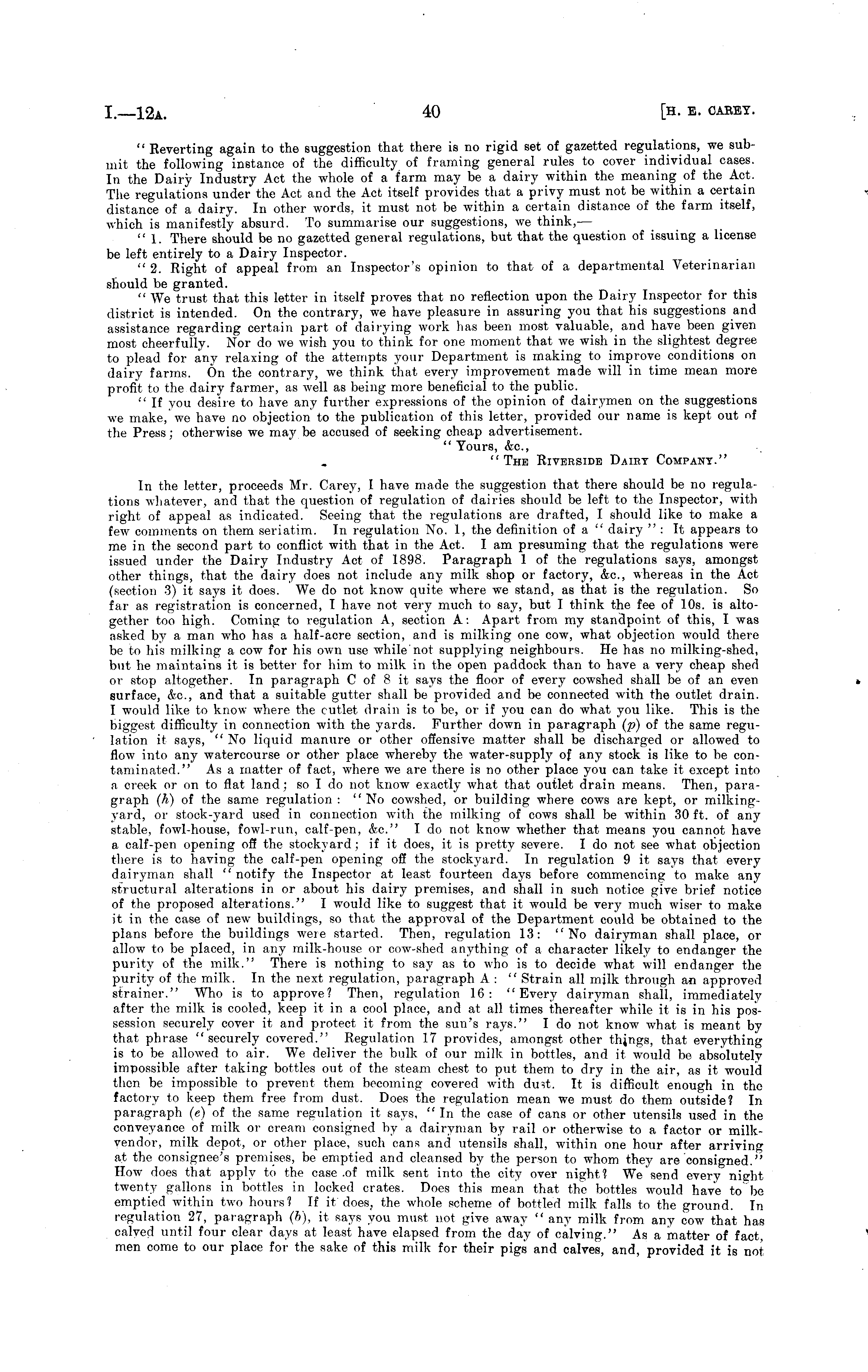 " Reverting again to the suggestion that there is no rigid set of gazetted regulations, we submit the following instance of the difficulty of framing general rules to cover individual cases. In the Dairy Industry Act the whole of a farm may be a dairy within the meaning of the Act. The regulations under the Act and the Act itself provides that a privy must not be within a certain distance of a dairy. In other words, it must not be within a certain distance of the farm itself, which is manifestly absurd. To summarise our suggestions, we think, — " 1. There should be no gazetted general regulations, but that the question of issuing a license be left entirely to a Dairy Inspector. " 2. Right of appeal from an Inspector's opinion to that of a departmental Veterinarian should be granted. " We trust that this letter in itself proves that no reflection upon the Dairy Inspector for this district is intended. On the contrary, we have pleasure in assuring you that his suggestions and assistance regarding certain part of dairying work has been most valuable, and have been given most cheerfully. Nor do we wish you to think for one moment that we wish in the slightest degree to plead for any relaxing of the attempts your Department is making to improve conditions on dairy farms. On the contrary, we think that every improvement made will in time mean more profit to the dairy farmer, as well as being more beneficial to the public. " If you desire to have any further expressions of the opinion of dairymen on the suggestions we make, we have no objection to the publication of this letter, provided our name is kept out of the Press; otherwise we may be accused of seeking cheap advertisement. " Yours, &c, "The Riverside Dairy Company." In the letter, proceeds Mr. Carey, I have made the suggestion that there should be no regulations whatever, and that the question of regulation of dairies should be left to the Inspector, with right of appeal as indicated. Seeing that the regulations are drafted, I should like to make a few comments on them seriatim. In regulation Xo. 1, the definition of a " dairy ": It appears to me in the second part to conflict with that in the Act. lam presuming that the regulations were issued under the Dairy Industry Act of 1898. Paragraph 1 of the regulations says, amongst other things, that the dairy does not include any milk shop or factory, &c, whereas in the Act (section 3) it says it does. We do not know quite where we stand, as that is the regulation. So far as registration is concerned, I have not very much to say, but I think the fee of 10s. is altogether too high. Coming to regulation A, section A: Apart from my standpoint of this, I was asked by a man who has a half-acre section, and is milking one cow, what objection would there be to his milking a cow for his own use while not supplying neighbours. He has no milking-shed, but he maintains it is better for him to milk in the open paddock than to have a very cheap shed or stop altogether. In paragraph Cof 8 it says the floor of every cowshed shall bo of an even surface, &0., and that a suitable gutter shall be provided and be connected with the outlet drain. I would like to know where the cutlet drain is to be, or if you can do what you like. This is the biggest difficulty in connection with the yards. Further down in paragraph (p) of the same regulation it says, "No liquid manure or other offensive matter shall be discharged or allowed to flow into any watercourse or other place whereby the water-supplj' of any stock is like to be contaminated." As a matter of fact, where we are there is no other place you can take it except into a creek or on to flat land ; so Ido not know exactly what that outlet drain means. Then, paragraph (h) of the same regulation : "No cowshed, or building where cows are kept, or milkingyard, or stock-yard used in connection with the milking of cows shall be within 30 ft. of any stable, fowl-house, fowl-run, calf-pen, &c." I do not know whether that means you cannot have a calf-pen opening off the stockyard; if it does, it is pretty severe. Ido not see what objection there is to having the calf-pen opening off the stockyard. In regulation 9 it says that every dairyman shall " notify the Inspector at least fourteen days before commencing to make an)' structural alterations in or about his dairy premises, and shall in such notice give brief notice of the proposed alterations." I would like to suggest that it would be very much wiser to make it in the case of new buildings, so that the approval of the Department could be obtained to the plans before the buildings were started. Then, regulation 13: "No dairyman shall place, or allow to be placed, in any milk-house or cow-shed anything of a character likely to endanger the purity of the milk." There is nothing to say as to who is to decide what will endanger the purity of the milk. In the next regulation, paragraph A: " Strain all milk through an approved strainer." Who is to approve? Then, regulation 16: "Every dairyman shall, immediately after the milk is cooled, keep it in a cool place, and at all times thereafter while it is in his possession securely cover it and protect it from the sun's rays." I do not know what is meant by that phrase "securely covered." Regulation 17 provides, amongst other things, that everything is to be allowed to air. We deliver the bulk of our milk in bottles, and it would be absolutely impossible after taking bottles out of the steam chest to put them to dry in the air, as it would then be impossible to prevent them becoming covered with du?t. It is difficult enough in the factory to keep them free from dust. Does the regulation mean we must do them outside? In paragraph (c) of the same regulation it says, " In the case of cans or other utensils used in the conveyance of milk or cream consigned by a dairyman by rail or otherwise to a factor or milkvendor, milk depot, or other place, such cans and utensils shall, within o