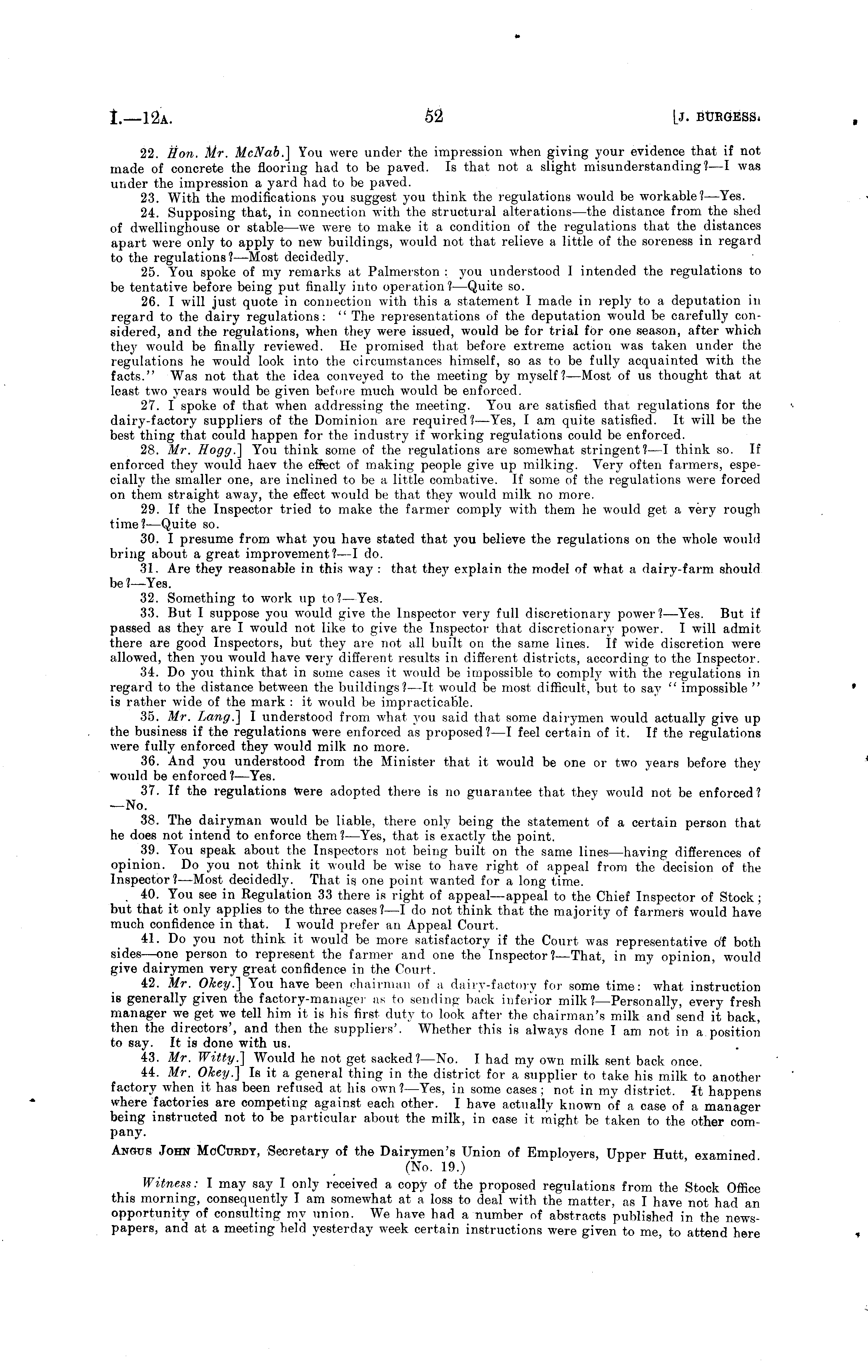 22. Hon. Mr. McNab.] You were under the impression when giving your evidence that if not made of concrete the flooring had to be paved. Is that not a slight misunderstanding? —I was under the impression a yard had to be paved. 23. With the modifications you suggest you think the regulations would be workable? —Yes. 24. Supposing that, in connection with the structural alterations—the distance from the shed of dwellinghouse or stable —we were to make it a condition of the regulations that the distances apart were only to apply to new buildings, would not that relieve a little of the soreness in regard to the regulations?— Most decidedly. 25. You spoke of my remarks at Palmerston : you understood I intended the regulations to be tentative before being put finally into operation?— Quite so. 26. I will just quote in connection with this a statement I made in reply to a deputation in regard to the dairy regulations: " The representations of the deputation would be carefully considered, and the regulations, when they were issued, would be for trial for one season, after which they would be finally reviewed. He promised that before extreme action was taken under the regulations he would look into the circumstances himself, so as to be fully acquainted with the facts." Was not that the idea conveyed to the meeting by myself?— Most of us thought that at least two years would be given before much would be enforced. 27. I spoke of that when addressing the meeting. You are satisfied that regulations for the dairy-factory suppliers of the Dominion are required? —Yes, I am quite satisfied. It will be the best thing that could happen for the industry if working regulations could be enforced. 28. Mr. Hogg.] You think some of the regulations are somewhat stringent?—l think so. If enforced they would haev the effect of making people give up milking. Very often farmers, especially the smaller one, are inclined to be a little combative. If some of the regulations were forced on them straight away, the effect would be that they would milk no more. 29. If the Inspector tried to make the farmer comply with them he would get a very rough time? —Quite so. 30. I presume from what you have stated that you believe the regulations on the whole would bring about a great improvement? —I do. 31. Are they reasonable in this way : that they explain the model of what a dairy-farm should be ?—Yes. 32. Something to work up to?— Yes. 33. But I suppose you would give the Inspector very full discretionary power?— Yes. But if passed as they are I would not like to give the Inspector , that discretionary power. I will admit there are good Inspectors, but they are not all built on the same lines. If wide discretion were allowed, then you would have verj- different results in different districts, according to the Inspector. 34. Do you think that in some cases it would be impossible to comph r with the regulations in regard to the distance between the buildings?—lt would be most difficult, "but to say " impossible " is rather wide of the mark : it would be impracticable. 35. Mr. Lang.] I understood from what you said that some dairymen would actually give up the business if the regulations were enforced as proposed?—l feel certain of it. If the regulations were fully enforced they would milk no more. 36. And you understood from the Minister that it would be one or two years before they would be enforced I —Yes. 37. If the regulations were adopted there is no guarantee that they would not be enforced? —No. 38. The dairyman would be liable, there only being the statement of a certain person that he does not intend to enforce them ?—Yes, that is exactly the point. 39. You speak about the Inspectors not being built on the same lines—having differences of opinion. Do you not think it would be wise to have right of appeal from the decision of the Inspector?— Most decidedly. That is one point wanted for a long time. _ 40. You see in Regulation 33 there is right of appeal—appeal to the Chief Inspector of Stock ; but that it only applies to the three cases ?—I do not think that the majority of farmers would have much confidence in that. I would prefer an Appeal Court. 41. Do you not think it would be more satisfactory if the Court was representative of both sides—one person to represent the farmer and one the Inspector?— That, in my opinion, would give dairymen very great confidence in the Court. 42. Mr. Okey.] You have been chairman of a dairy-factory for some time: what instruction is generally given the factory-manager as to sending back inferior milk? —Personally, every fresh manager we get we tell him it is his first duty to look after the chairman's milk and send it back, then the directors', and then the suppliers'. Whether this is always done lam not in a position to say. It is done with us. 43. Mr. Witty.] Would he not get sacked? —No. I had my own milk sent back once. 44. Mr. Okey.] Is it a general thing in the district for a supplier to take his milk to another factory when it has been refused at his own ?—Yes, in some cases ; not in my district, ft happens where factories are competing against each other. I have actually known of a case of a manager being instructed not to be particular about the milk, in case it might be taken to the other company. Anous John MoCurdt, Secretary of the Dairymen's Union of Employers, Upper Hutt examined (No. 19.) Witness: I may say I only received a copy of the proposed regulations from the Stock Office this morning, consequently I am somewhat at a loss to deal with the matter, as I have not had an opportunity of consulting my union. We have had a number of abstracts published in the news papers, and at a meeting held yesterday week certain instructions were given to me, to attend here