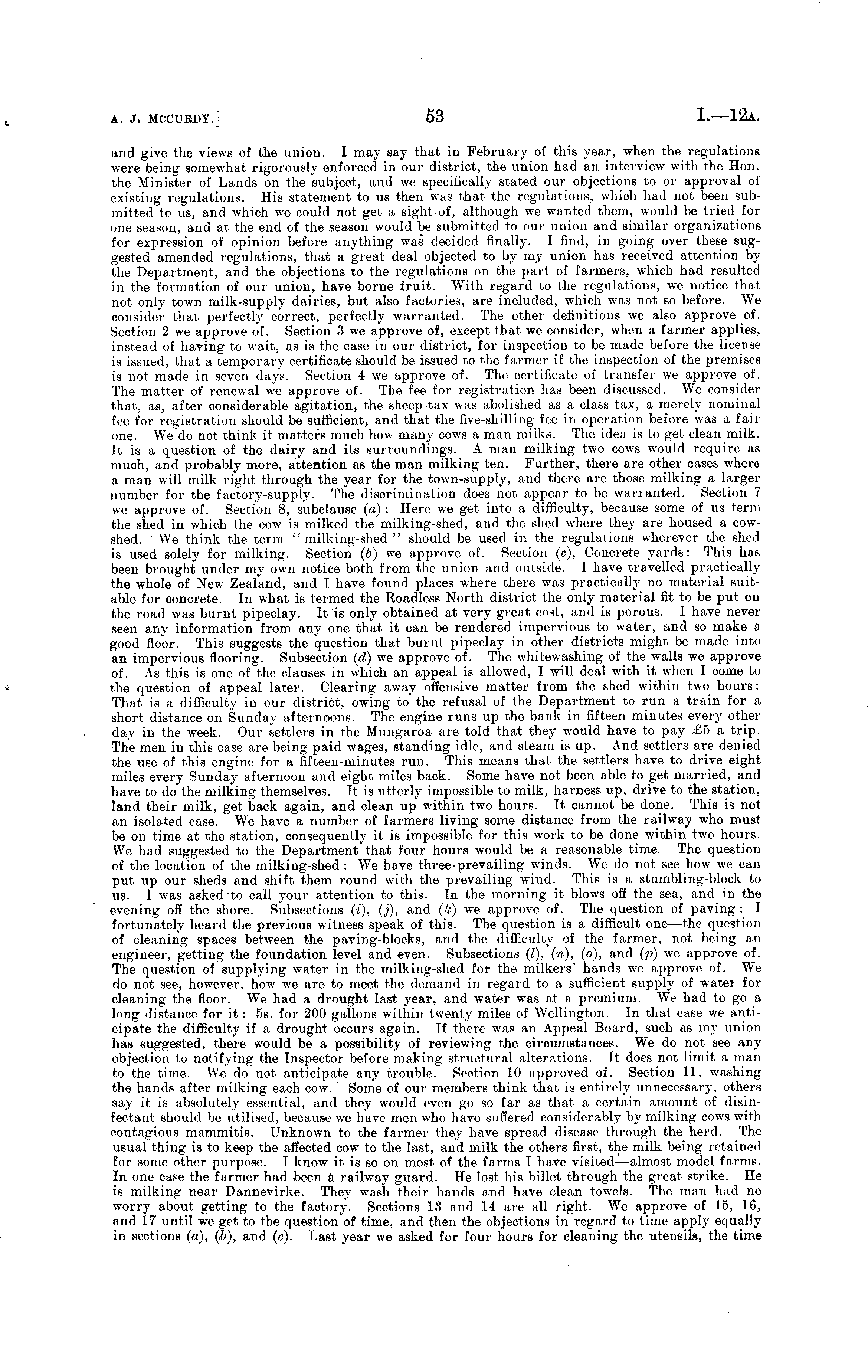 and give the views of the union. I may say that in February of this year, when the regulations were being somewhat rigorously enforced in our district, the union had an interview with the Hon. the Minister of Lands on the subject, and we specifically stated our objections to or approval of existing regulations. His statement to us then was that the regulations, which had not been submitted to us, and which we could not get a sight-of, although we wanted them, would be tried for one season, and at the end of the season would be submitted to our union and similar organizations for expression of opinion before anything was decided finally. I find, in going over these suggested amended regulations, that a great deal objected to by my union has received attention by the Department, and the objections to the regulations on the part of farmers, which had resulted in the formation of our union, have borne fruit. With regard to the regulations, we notice that not only town milk-supply dairies, but also factories, are included, which was not so before. W 7 e consider that perfectly correct, perfectly warranted. The other definitions we also approve of. Section 2we approve of. Section 3we approve of, except that we consider, when a farmer applies, instead of having to wait, as is the case in our district, for inspection to be made before the license is issued, that a temporary certificate should be issued to the farmer if the inspection of the premises is not made in seven days. Section 4we approve of. The certificate of transfer we approve of. The matter of renewal we approve of. The fee for registration has been discussed. We consider that, as, after considerable agitation, the sheep-tax was abolished as a class tax, a merely nominal fee for registration should be sufficient, and that the five-shilling fee in operation before was a failone. We do not think it matters much how many cows a man milks. The idea is to get clean milk. It is a question of the dairy and its surroundings. A man milking two cows would require as much, and probably more, attention as the man milking ten. Further, there are other cases where a man will milk right through the year for the town-supply, and there are those milking a larger number for the factory-supply. The discrimination does not appear to be warranted. Section 7 we approve of. Section 8, subclause (a) : Here we get into a difficulty, because some of us term the shed in which the cow is milked the milking-shed, and the shed where they are housed a cowshed. ' We think the term "milking-shed" should be used in the regulations wherever the shed is used solely for milking. Section (&) we approve of. Section («), Concrete yards: This has been brought under my own notice both from the union and outside. I have travelled practically the whole of New Zealand, and I have found places where there was practically no material suitable for concrete. In what is termed the Roadless North district the only material fit to be put on the road was burnt pipeclay. It is only obtained at very great cost, and is porous. I have never seen any information from any one that it can be rendered impervious to water, and so make a good floor. This suggests the question that burnt pipeclay in other districts might be made into an impervious flooring. Subsection (d) we approve of. The whitewashing of the walls we approve of. As this is one of the clauses in which an appeal is allowed, I will deal with it when I come to the question of appeal later. Clearing away offensive matter from the shed within two hours: That is a difficulty in our district, owing to the refusal of the Department to run a train for a short distance on Sunday afternoons. The engine runs up the bank in fifteen minutes every other day in the week. Our settlers in the Mungaroa are told that they would have to pay £5 a trip. The men in this case are being paid wages, standing idle, and steam is up. And settlers are denied the use of this engine for a fifteen-minutes run. This means that the settlers have to drive eight miles every Sunday afternoon and eight miles back. Some have not been able to get married, and have to do the milking themselves. It is utterly impossible to milk, harness up, drive to the station, land their milk, get back again, and clean up within two hours. It cannot be done. This is not an isolated case. We have a number of farmers living some distance from the railway who must be on time at the station, consequently it is impossible for this work to be done within two hours. We had suggested to the Department that four hours would be a reasonable time. The question of the location of the milking-shed :We have three-prevailing winds. We do not see how we can put up our sheds and shift them round with the prevailing wind. This is a stumbling-block to us. I was asked to call your attention to this. In the morning it blows off the sea, and in the evening off the shore. Subsections (i), (j), and (k) we approve of. The question of paving : I fortunately heard the previous witness speak of this. The question is a difficult one—the question of cleaning spaces between the paving-blocks, and the difficulty of the farmer, not being an engineer, getting the foundation level and even. Subsections (I), (n), (o), and (p) we approve of. The question of supplying water in the milking-shed for the milkers' hands we approve of. We do not see, however, how we are to meet the demand in regard to a sufficient supply of water for cleaning the floor. We had a drought last year, and water was at a premium. We had to go a long distance for it : ss. for 200 gallons within twenty miles of Wellington. In that case we anticipate the difficulty if a drought occurs again. If there was an Appeal Board, such as my union has suggested, there would be a possibility of reviewing the circumstances. We do not see any objection to notifying the Inspector before making structural alterations. It does not limit a man to the time. We do not
