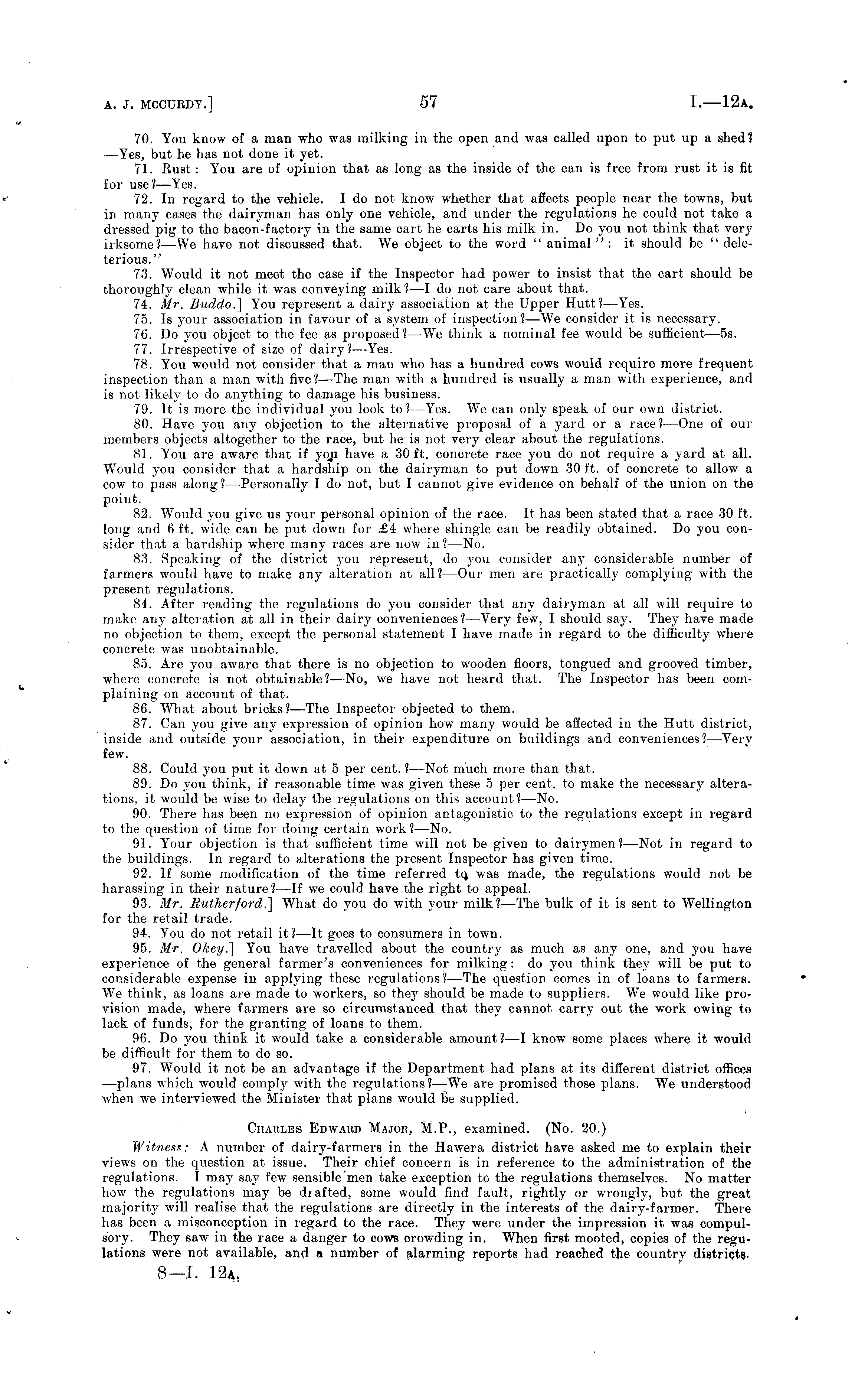 70. You know of a man who was milking in the open and was called upon to put up a shed? —Yes, but he has not done it yet. 71. Rust: You are of opinion that as long as the inside of the can is free from rust it is fit for use?— Yes. 72. In regard to the vehicle. Ido not know whether that affects people near the towns, but in many cases the dairyman has only one vehicle, and under the regulations he could not take a dressed pig to the bacon-factory in the same cart he carts his milk in. Do you not think that very irksome?—We have not discussed that. We object to the word " animal ": it should be " deleterious." 73. Would it not meet the case if the Inspector had power to insist that the cart should be thoroughly clean while it was conveying milk ?—I do not care about that. 74. Mr. Buddo.] You represent a dairy association at the Upper Hutt? —Yes. 75. Is your association in favour of a system of inspection?—We consider it is necessary. 76. Do you object to the fee as proposed?—We think a nominal fee would be sufficient —ss. 77. Irrespective of size of dairy?— Yes. 78. You would not consider that a man who has a hundred cows would require more frequent inspection than a man with five? —The man with a hundred is usually a man with experience, and is not likely to do anything to damage his business. 79. It is more the individual you look to?— Yes. We can only speak of our own district. 80. Have you any objection to the alternative proposal of a yard or a race?— One of our members objects altogether to the race, but he is not very clear about the regulations. 81. You are aware that if you have a 30 ft. concrete race you do not require a yard at all. Would you consider that a hardship on the dairyman to put down 30 ft. of concrete to allow a cow to pass along?— Personally I do not, but I cannot give evidence on behalf of the union on the point. 82. Would you give us your personal opinion of the race. It has been stated that a race 30 ft. long and 6 ft. wide can be put down for £& where shingle can be readily obtained. Do you consider that a hardship where many races are now in? —No. 83. Speaking of the district you represent, do you consider any considerable number of farmers would have to make any alteration at all?— Our men are practically complying with the present regulations. 84. After reading the regulations do you consider that any dairyman at all will require to make any alteration at all in their dairy conveniences? —Very few, I should say. They have made no objection to them, except the personal statement I have made in regard to the difficulty where concrete was unobtainable. 85. Are you aware that there is no objection to wooden floors, tongued and grooved timber, where concrete is not obtainable? —No, we have not heard that. The Inspector has been complaining on account of that. 86. What about bricks?— The Inspector objected to them. 87. Can you give any expression of opinion how many would be affected in the Hutt district, inside and outside your association, in their expenditure on buildings and conveniences?— Very few. 88. Could you put it down at 5 per cent. ?—Not much more than that. 89. Do you think, if reasonable time was given these 5 per cent, to make the necessary alterations, it would be wise to delay the regulations on this account?— No. 90. There has been no expression of opinion antagonistic to the regulations except in regard to the question of time for doing certain work?— No. 91. Your objection is that sufficient time will not be given to dairymen?— Not in regard to the buildings. In regard to alterations the present Inspector has given time. 92. If some modification of the time referred tq was made, the regulations would not be harassing in their nature?—lf we could have the right to appeal. 93. Mr. Rutherford.] What do you do with your milk?— The bulk of it is sent to Wellington for the retail trade. 94. You do not retail it? —It goes to consumers in town. 95. Mr. Okey.~\ You have travelled about the country as much as any one, and you have experience of the general farmer's conveniences for milking: do you think they will be put to considerable expense in applying these regulations ?—The question comes in of loans to farmers. We think, as loans are made to workers, so they should be made to suppliers. We would like provision made, where farmers are so circumstanced that they cannot carry out the work owing to lack of funds, for the granting of loans to them. 96. Do you think it would take a considerable amount?—l know some places where it would be difficult for them to do so. 97. Would it not be an advantage if the Department had plans at its different district offices —plans which would comply with the regulations ? —We are promised those plans. We understood when we interviewed the Minister that plans would be supplied. i Chables Edward Major, M.P., examined. (No. 20.) Witnest: A number of dairy-farmers in the Hawera district have asked me to explain their views on the question at issue. Their chief concern is in reference to the administration of the regulations. I may say few sensible men take exception to the regulations themselves. No matter how the regulations may be drafted, some would find fault, rightly or wrongly, but the great majority will realise that the regulations are directly in the interests of the dairy-farmer. There has been a misconception in regard to the race. They were under the impression it was compulsory. They saw in the race a danger to cows crowding in. When first mooted, copies of the regulations were not available, and a number of alarming reports had reached the country districts.