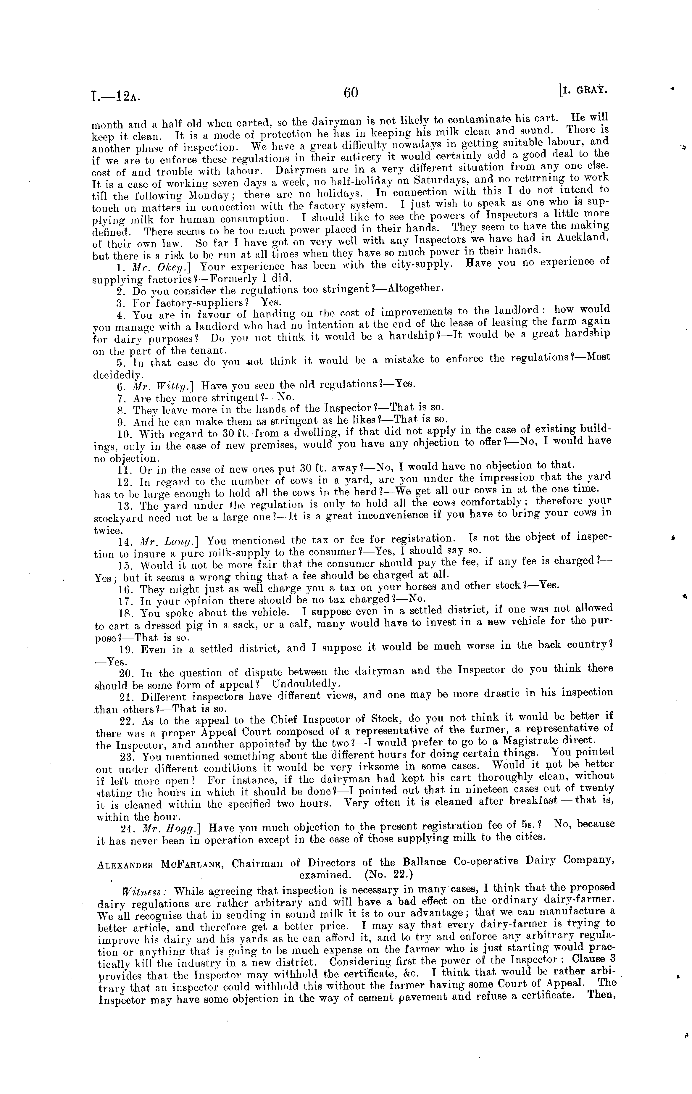 month and a half old when carted, so the dairyman is not likely to contaminate his cart. He will keep it clean. It is a mode of protection he has in keeping his milk clean and sound lhere is another phase of inspection. We have a great difficulty nowadays in getting suitable labour and if we are to enforce these regulations in their entirety it would certainly add a good deal to the cost of and trouble with labour. Dairymen are in a very different situation from any one else It is a case of working seven days a week, no half-holiday on Saturdays, and no returning to work till the following Monday; there are no holidays. In connection with this I do not intend to touch on matters in connection with the factory system. I just wish to speak as one who is supplying milk for human consumption. I should like to see the powers of Inspectors a little more defined There seems to be too much power placed in their hands. They seem to have the making of their own law. So far I have got on very well with any Inspectors we have had in Auckland, but there is a risk to be run at all times when they have so much power in their hands. 1. Mr. Okey.] Your experience has been with the city-supply. Have you no experience ot supplying factories? —Formerly I did. 2. Do you consider the regulations too stringent ?— Altogether. 3. For factory-suppliers? —Yes. , ~ i You are in favour of handing on the cost of improvements to the landlord : how would you manage with a landlord who had no intention at the end of the lease of leasing the farm again for dairy purposes? Do you not think it would be a hardship?—lt would be a great hardship on the part of the tenant. . . , a/t^+ 5. In that case do you aot think it would be a mistake to enforce the regulations?— Most decidedly. 6. Mr. Witty.] Have you seen the old regulations? —Yes. 7. Are they more stringent?— No. 8. They leave more in the hands of the Inspector?— That is so. 9. And he can make them as stringent as he likes I —That is so. 10 With regard to 30 ft. from a dwelling, if that did not apply in the case of existing buildings, only in the case of new premises, would you have any objection to offer ?—No, i would have no objection. . . , . 11 Or in the case of new ones put 30 ft. away?—No, I would have no objection to that 12 In regard to the number of cows in a yard, are you under the impression that the yard has to be large enough to hold all the cows in the herd?—We get all our cows in at the one time. 13 The yard under the regulation is only to hold all the cows comfortably; therefore your stockyard need not be a large one?—lt is a great inconvenience if you have to bring your cows in "twice 14. Mr. Lang.] You mentioned the tax or fee for registration. Is not the object of inspection to insure a pure milk-supply to the consumer I —Yes, I should say so. 15. Would it not be more fair that the consumer should pay the fee, if any fee is charged'— Yes ; but it seems a wrong thing that a fee should be charged at all. 16. They might just as well charge you a tax on your horses and other stock? —Yes. 17 In your opinion there should be no tax charged?— No. 18. You spoke about the vehicle. I suppose even in a settled district, if one was not allowed to cart a dressed pig in a sack, or a calf, many would have to invest in a new vehicle for the purpose?— That is so. , 19. Even in a settled district, and I suppose it would be much worse in the back country J Y es _ 20. In the question of dispute between the dairyman and the Inspector do you think there should be some form of appeal ?—Undoubtedly. ..... 21. Different inspectors have different views, and one may be more drastic in his inspection .than others?— That is so. . .. 22 As to the appeal to the Chief Inspector of Stock, do you not think it would be better it there was a proper Appeal Court composed of a representative of the farmer, a representative of the Inspector, and another appointed by the two?—l would prefer to go to a Magistrate direct. 23. You mentioned something about the different hours for doing certain things. You pointed out under different conditions it would be very irksome in some cases. Would it not be better if left more open ? For instance, if the dairyman had kept his cart thoroughly clean, without stating the hours in which it should be done?—l pointed out that in nineteen cases out of twenty it is cleaned within the specified two hours. Very often it is cleaned after breakfast — that is, within the ho in-. 24. Mr. Hoffi/.] Have you much objection to the present registration fee ot OS. <—JNo, because it has never been in operation except in the case of those supplying milk to the cities. Alexander McFarlanb, Chairman of Directors of the Ballance Co-operative Dairy Company, examined. (No. 22.) Witness: While agreeing that inspection is necessary in many cases, I think that the proposed dairy regulations are rather arbitrary and will have a bad effect on the ordinary dairy-farmer. We all recognise that in sending in sound milk it is to our advantage; that we can manufacture a better article, and therefore get a better price. I may say that every dairy-farmer is trying to improve his dairy and his yards as he can afford it, and to try and enforce any arbitrary regulation or anything'that is going to be much expense on the farmer who is just starting would practically kill"the industry in a new district. Considering first the power of the Inspector : Clause <5 provides that the Inspector may withhold the certificate, <fee. I think that would be rather arbitrary that an inspector could withhold this without the farmer having some Court of Appeal, lhe Inspector may have some objection in the way of cement pavement and refuse a certificate. Then,
