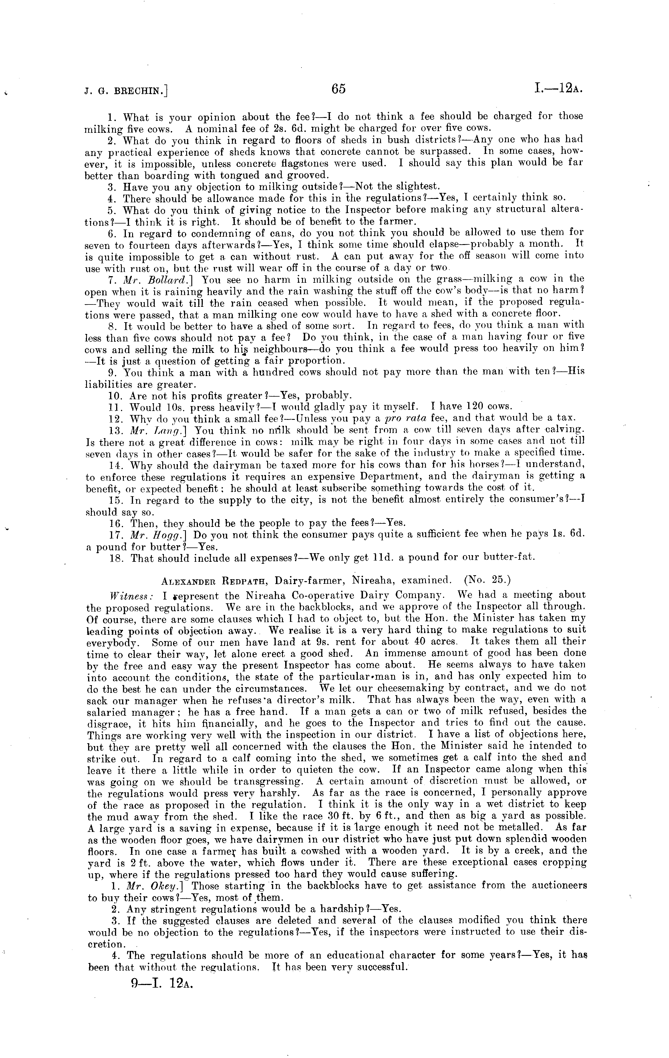 1. What is your opinion about the fee?—l do not think a fee should be charged for those milking five cows. A nominal fee of 2s. 6d. might be charged for over five cows. 2. What do you think in regard to floors of sheds in bush districts? —Any one who has had any practical experience of sheds knows that concrete cannot be surpassed. In some cases, however, it is impossible, unless concrete flagstones were used. I should say this plan would be far better than boarding with tongued and grooved. 3. Have you any objection to milking outside? —Not the slightest. 4. There should be allowance made for this in the regulations?— Yes, I certainly think so. 5. What do you think of giving notice to the Inspector before making any structural alterations?—l think it is right. It should be of benefit to the farmer. 6. In regard to condemning of cans, do you not think you should be allowed to use them for seven to fourteen days afterwards? —Yes, I think some time should elapsi—probably a month. It is quite impossible to get a can without rust. A can put away for the off season will come into use with rust on, but the rust will wear off in the course of a day or two. 7. Mr. Bollard.} You see no harm in milking outside on the grase—milking a cow in the open when it is raining heavily and the rain washing the stuff off the cow's body —is that no harm? —They would wait till the rain ceased when possible. It would mean, if the proposed regulations were passed, that a man milking one cow would have to have a shed with a concrete floor. 8. It would be better to have a shed of some sort. In regard to fees, do you think a man with less than five cows should not pay a fee? Do you think, in tin- case of a man having four or five cows and selling the milk to his neighbours —do you think a fee would press too heavily on him? —It is just a question of getting a fair proportion. 9. You think a man with a hundred cows should not pay more than the man with ten?— His liabilities are greater. 10. Are not his profits greater?— Yes, probably. 11. Would 10s. press heavily?—l would gladly pay it myself. I have 120 cows. 12. Why do you think a small fee? —Unless you pay a pro rata fee, and that would be a tax. 13. Mr. Lang.] You think no milk should be sent from a cow till seven days after calving. Is there not a great difference in cows: milk may be right in four days in some cases and not till seven days in other cases?—lt would be safer for the sake of the industry to make a specified time. 1-k Why should the dairyman be taxed more for his cows than for his horses? —I understand, to enforce these regulations it requires an expensive Department, ami the dairyman is getting a benefit, or expected benefit; he should at least subscribe something towards the cost of it. 15. In regard to the supply to the city, is not the benefit almost entirely the consumer's?—l should say so. 16. then, they should be the people to pay the fees?— Yes. 17. Mr. Hogg.] Do you not think the consumer pays quite a sufficient fee when he pays Is. 6d. a pound for butter?— Yes. 18. That should include all expenses?—We only get lid. a pound for our butter-fat. Alexander Redpath, Dairy-farmer, Nireaha, examined. (No. 25.) Witness: I represent the Nireaha Co-operative Dairy Company. W T e had a meeting about the proposed regulations. We are in the backblocks, and we approve of the Inspector all through. Of course, there are some clauses which I had to object to, but the Hon. the Minister has taken my leading points of objection away.. We realise it is a very hard thing to make regulations to suit everybody. Some of our men have land at 9s. rent for about 40 acres. It takes them all their time to clear their way, let alone erect a good shed. An immense amount of good has been done by the free and easy way the present Inspector has come about. He seems always to have taken into account the conditions, the state of the particular-man is in, and has only expected him to do the best he can under the circumstances. We let our cheesemaking by contract, and we do not sack our manager when he refuses'a director's milk. That has always been the way, even with a salaried manager; he has a free hand. If a man gets a can or two of milk refused, besides the disgrace, it hits him financially, and he goes to the Inspector and tries to find out the cause. Things are working very well with the inspection in our district. I have a list of objections here, but they are pretty well all concerned with the clauses the Hon. the Minister said he intended to strike out. In regard to a calf coming into the shed, we sometimes get a calf into the shed and leave it there a little while in order to quieten the cow. If an Inspector came along when this was going on we should be transgressing. A certain amount of discretion must be allowed, or the regulations would press very harshly. As far as the race is concerned, I personally approve of the race as proposed in the regulation. I think it is the only way in a wet district to keep the mud away from the shed. I like the race 30 ft. by 6 ft., and then as big a yard as possible. A large yard is a saving in expense, because if it is large enough it need not be metalled. As far as the wooden floor goes, we have dairymen in our district who have just put down splendid wooden floors. In one case a has built a cowshed with a wooden yard. It is by a creek, and the yard is 2 ft. above the water, which flows under it. There are these exceptional cases cropping up, where if the regulations pressed too hard they would cause suffering. 1. Mr. Okey.] Those starting in the backblocks have to get assistance from the auctioneers to buy their cows?— Yes, most of them. 2. Any stringent regulations would be a hardship?— Yes. 3. If "the suggested clauses are deleted and several of the clauses modified you think there would be no objection to the regulations?— Yes, if the inspectors were instructed to use their d