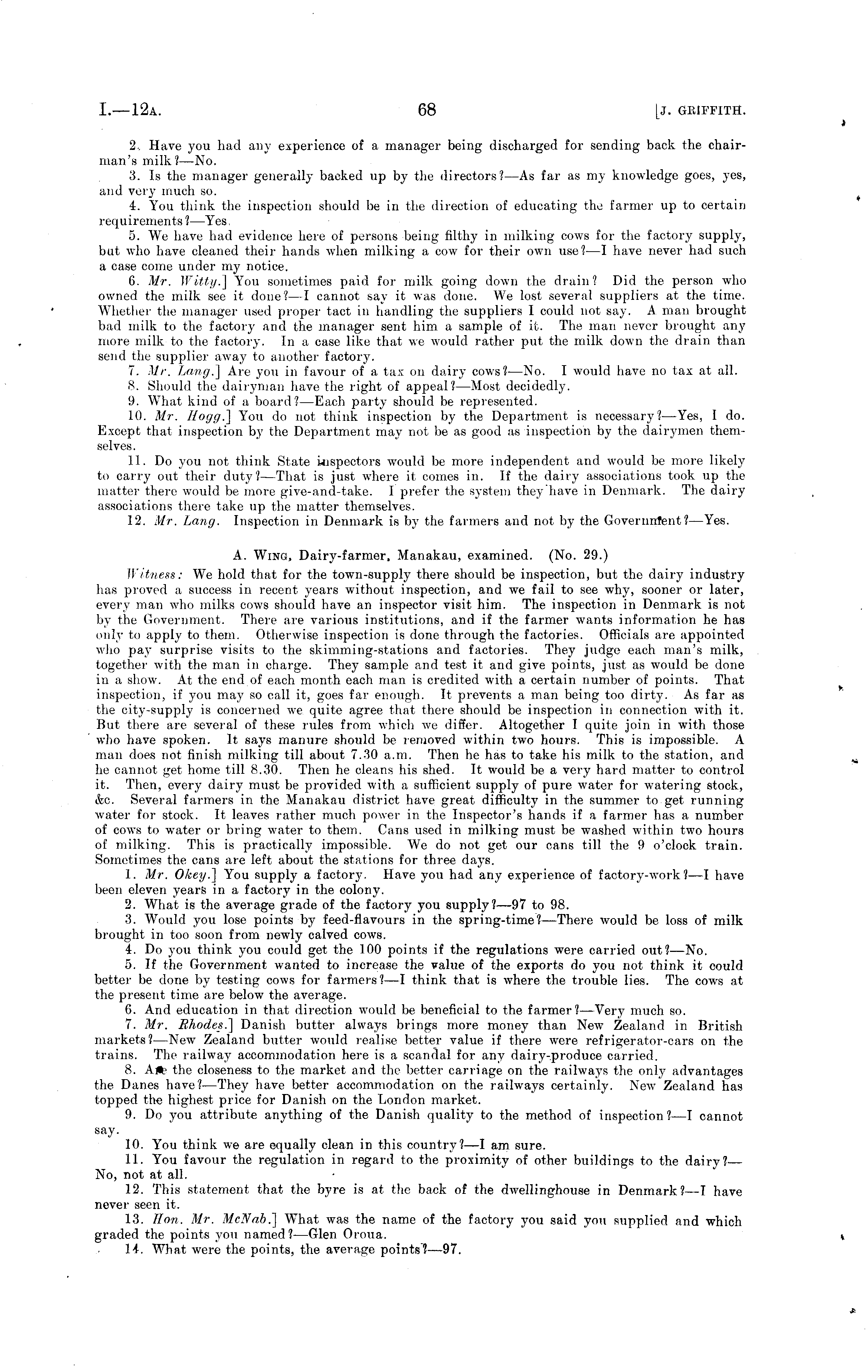 2. Have you had any experience of a manager being discharged for sending back the chairman's milk?— No. 3. Is the manager generally backed up by the directors? —As far as my knowledge goes, yes, and very much so. 4. You think the inspection should be in the direction of educating the farmer up to certain requirements ?—Yes 5. We have had evidence here of persons being filthy in milking cows for the factory supply, but who have cleaned their hands when milking a cow for their own use? —I have never had such a case come under my notice. 6. Mr. Witty.] You sometimes paid for milk going down the drain? Did the person who owned the milk see it done? —I cannot say it was done. We lost several suppliers at the time. Whether the manage]- used proper tact in handling the suppliers I could not say. A man brought bad milk to the factory and the manager sent him a sample of it. The man never brought any more milk to the factory. In a case like that we would rather put the milk down the drain than send the supplier away to another factory. 7. Mr. Lang.] Are you in favour of a tax on dairy cows?— No. I would have no tax at all. 8. Should the dairyman have the right of appeal?— Most decidedly. 9. What kind of a board?— Each party should be represented. 10. Mr. Hogg.] You do not think inspection by the Department is necessary?— Yes, I do. Except that inspection by the Department may not be as good as inspection by the dairymen themselves. I I . Do you not think State inspectors would be more independent and would be more likely to carry out their duty?— That is just where it comes in. If the dairy associations took up the matter there would be more give-and-take. I prefer the system they have in Denmark. The dairy associations there take up the matter themselves. 12. Mr. Lang. Inspection in Denmark is by the farmers and not by the Government? —Yes. A. Wing, Dairy-farmer, Manakau, examined. (No. 29.) Witness: We hold that for the town-supply there should be inspection, but the dairy industry has proved a success in recent years without inspection, and we fail to see why, sooner or later, every man who milks cows should have an inspector visit him. The inspection in Denmark is not by the Government. There are various institutions, and if the farmer wants information he has only to apply to them. Otherwise inspection is done through the factories. Officials are appointed wlio pay surprise visits to the skimming-stations and factories. They judge each man's milk, together with the man in charge. They sample and test it and give points, just as would be done in a show. At the end of each month each man is credited with a certain number of points. That inspection, if you may so call it, goes far enough. It prevents a man being too dirty. As far as the city-supply is concerned we quite agree that there should be inspection in connection with it. But there are several of these rules from which we differ. Altogether I quite join in with those who have spoken. It says manure should be removed within two hours. This is impossible. A man does not finish milking till about 7.30 a.m. Then he has to take his milk to the station, and lie cannot get home till 5.30. Then he cleans his shed. It would be a very hard matter to control it. Then, every dairy must be provided with a sufficient supply of pure water for watering stock, &c. Several farmers in the Manakau district have great difficulty in the summer to get running water for stock. It leaves rather much power in the Inspector's hands if a farmer has a number of cows to water or bring water to them. Cans used in milking must be washed within two hours of milking. This is practically impossible. We do not get our cans till the 9 o'clock train. Sometimes the cans are left about the stations for three days. 1. Mr. Okey.~\ You supply a factor} 1 . Have you had any experience of factory-work?—l have been eleven years in a factory in the colony. 2. What is the average grade of the factory you supply?— 97 to 98. 3. Would you lose points by feed-flavours in the spring-time? —There would be loss of milk brought in too soon from newly calved cows. i. Do }'ou think you could get the 100 points if the regulations were carried out?— No. 5. If the Government wanted to increase the value of the exports do you not think it could better be done by testing cows for farmers?—l think that is where the trouble lies. The cows at the present time are below the average. 6. And education in that direction would be beneficial to the farmer? —Very much so. 7. Mr. Rhodes.] Danish butter always brings more money than New Zealand in British markets? —New Zealand butter would realise better value if there were refrigerator-cars on the trains. The railway accommodation here is a scandal for any dairy-produce carried. 8. AH? the closeness to the market and the better carriage on the railways the only advantages the Danes have?— They have better accommodation on the railways certainly. New Zealand has topped the highest price for Danish on the Nondon market. 9. Do you attribute anything of the Danish quality to the method of inspection ?—I cannot say. 10. You think we are equally clean in this country?—l am sure. 11. You favour the regulation in regard to the proximity of other buildings to the dairy?— No, not at all. 12. This statement that the byre is at the back of the dwellinghouse in Denmark?—l have never seen it. 13. Hon. Mr. McNab.] What was the name of the factory you said you supplied nnd which graded the points you named?— Glen Oroua. H. What were the points, the average points?— 97.