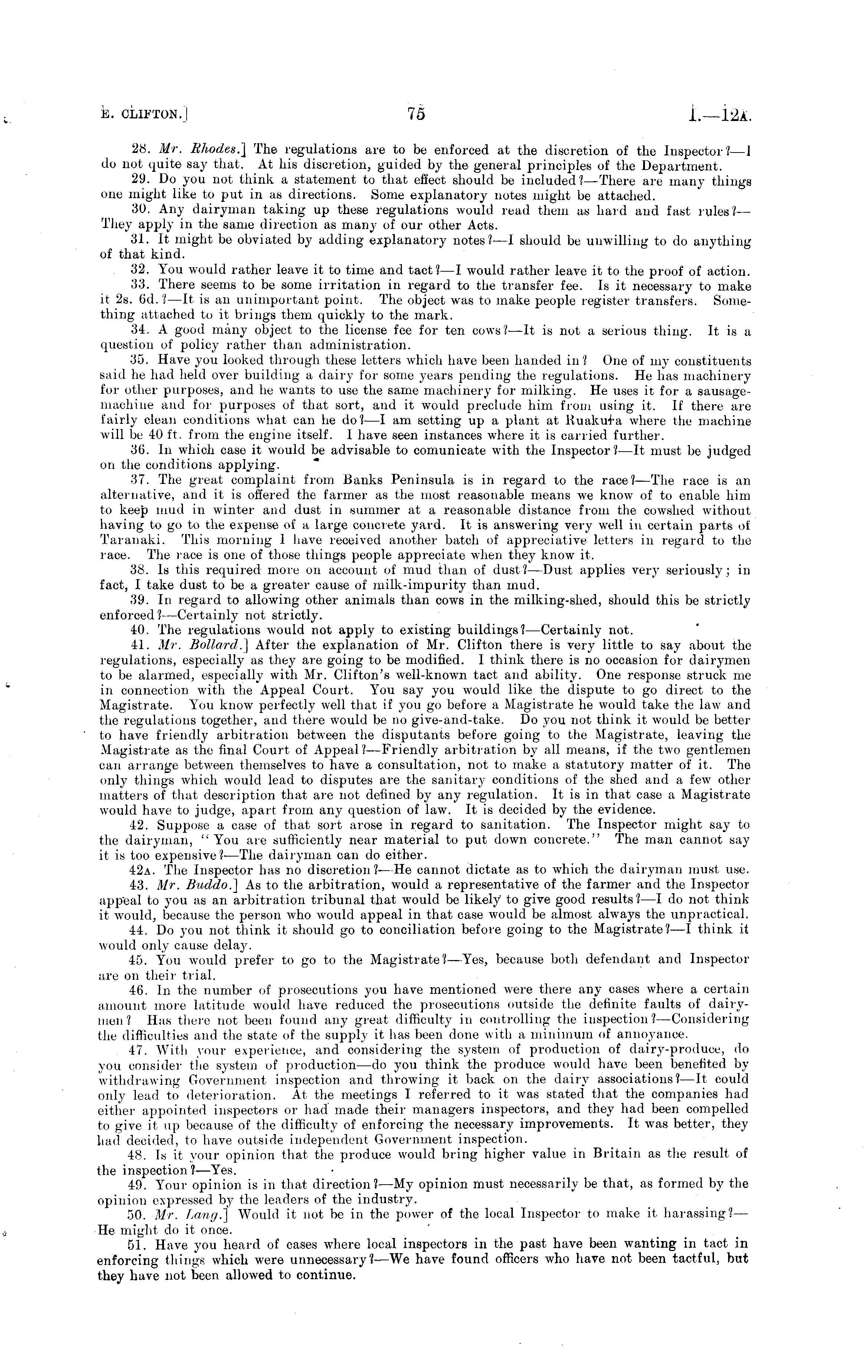 28. Mr. Rhodes.] The regulations are to be enforced at the discretion of the Inspector? —1 do not quite say that. At his discretion, guided by the general principles of the Department. 29. Do you not think a statement to that effect should be included? —There are many things one might like to put in as directions. Some explanatory notes might be attached. 30. Any dairyman taking up these regulations would lead them as hard and fast rules/ — They apply in the same direction as many of our other Acts. 31. It might be obviated by adding explanatory notes? —1 should be unwilling to do anything of that kind. 32. You would rather leave it to time and tact?—l would rather leave it to the proof of action. 33. There seems to be some irritation in regard to the transfer fee. Is it necessary to make it 2s. 6d. ! —lt is an unimportant point. The object was to make people register transfers. Something attached to it brings them quickly to the mark. 34. A good many object to the license fee for ten cows?—lt is not a serious thing. It is a question of policy rather than administration. 35. Have you looked through these letters which have been handed in? One of my constituents said he had held over building a dairy for some years pending the regulations. He lias machinery for other purposes, and he wants to use the same machinery for milking. He uses it for a sausagemachine and for purposes of that sort, and it would preclude him from using it. If there are fairly clean conditions what can he do? —I am setting up a plant at Ruakirra where the machine will be 40 ft. from the engine itself. I have seen instances where it is carried further. 3G. In which case it would be advisable to comunicate with the Inspector?—lt must be judged on the conditions applying. 37. The great complaint from Banks Peninsula is in regard to the race?— The race is an alternative, and it is offered the farmer as the most reasonable means we know of to enable him to keep mud in winter and dust in .summer at a reasonable distance from the cowshed without having to go to the expense of a large concrete yard. It is answering very well in certain parts of Taranaki. This morning 1 have received another batch of appreciative letters in regard to the race. The race is one of those things people appreciate when they know it. 38. Is this required more on account of mud than of dust?— Dust applies very seriously; in fact, I take dust to be a greater cause of milk-impurity than mud. 39. In regard to allowing other animals than cows in the milking-shed, should this be strictly enforced ? —Certainly not strictly. 40. The regulations would not apply to existing buildings?— Certainly not. 41. Mr. Bollard.] After the explanation of Mr. Clifton there is very little to say about the regulations, especially as they are going to be modified. I think there is no occasion for dairymen to be alarmed, especially with Mr. Clifton's well-known tact and ability. One response struck me in conned ion with the Appeal Court. You say you would like the dispute to go direct to the Magistrate. You know perfectly well that if you go before a Magistrate he would take the law and the regulations together, and there would be no give-and-take. Do you not think it would be better to have friendly arbitration between the disputants before going to the Magistrate, leaving the Magistrate as the final Court of Appeal?— Friendly arbitration by all means, if the two gentlemen can arrange between themselves to have a consultation, not to make a statutory matter of it. The only things which would lead to disputes are the sanitary conditions of the shed and a few other matter's of that description that are not defined by any regulation. It is in that case a Magistrate would have to judge, apart from any question of law. It is decided by the evidence. 42. Suppose a case of that sort arose in regard to sanitation. The Inspector might say to the dairyman, " You are sufficiently near material to put down concrete." The man cannot say it is too expensive? —The dairyman can do either. 42a. The Inspector has no discretion?—He cannot dictate as to which the dairyman must use. 43. Mr. Buddo.] As to the arbitration, would a representative of the farmer and the Inspector appeal to you as an arbitration tribunal that would be likely to give good results ?—1 do not think it would, because the person who would appeal in that case would be almost always the unpractical. 44. Do you not think it should go to conciliation before going to the Magistrate?—l think it would only cause delay. 45. You would prefer to go to the Magistrate?— Yes, because both defendant and Inspector are on their trial. 46. In the number of prosecutions you have mentioned were there any cases where a, certain amount more latitude would have reduced the prosecutions outside the definite faults of dairymen? Has there not been found any great difficulty in controlling the inspection?— Considering the difficulties and the state of the supply it has been done with a minimum of annoyance. 47. With your experience, and considering the system of production of dairy-produce, do you consider the system of production —do you think the produce would have been benefited by withdrawing Government inspection and throwing it back on the dairy associations? —It could only lead to deterioration. At the meetings I referred to it was stated that the companies had either appointed inspectors or had made their managers inspectors, and they had been compelled to give it ii|> because of the difficulty of enforcing the necessary improvements. It was better, they had decided, to have outside independent Government inspection. 48. Is it your opinion that the produce would bring higher value in Britain as the result of the inspection? —Yes. 49. Your opinion is in that direction? —My opinion must necessarily be that, as formed by the opinion expressed by the leaders of the industry. 50. Mr. Lang.] Would