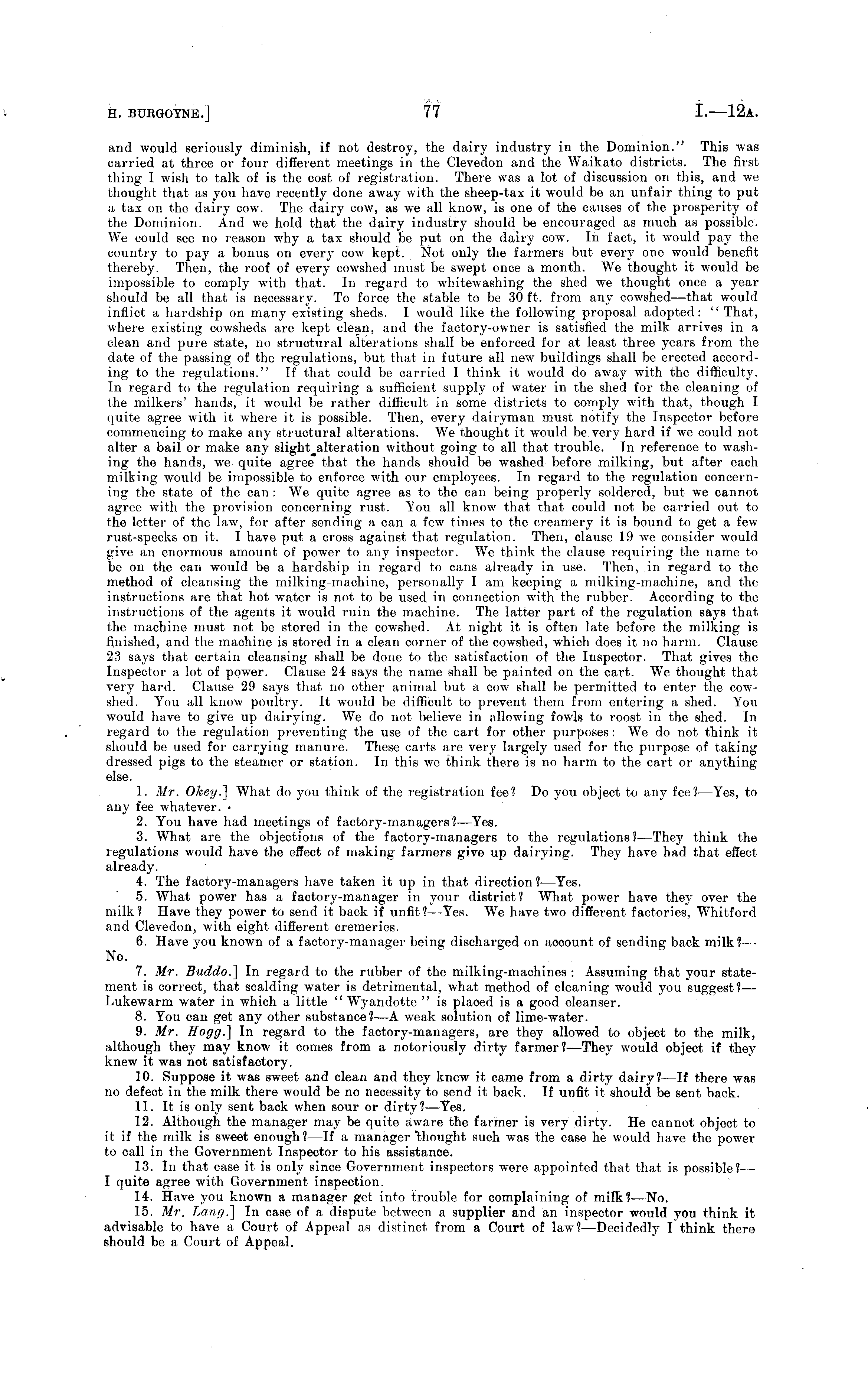 and would seriously diminish, if not destroy, the dairy industry in the Dominion." This was carried at three or four different meetings in the Clevedon and the Waikato districts. The first thing I wish to talk of is the cost of registration. There was a lot of discussion on this, and we thought that as you have recently done away with the sheep-tax it would be an unfair thing to put a tax on the dairy cow. The dairy cow, as we all know, is one of the causes of the prosperity of the Dominion. And we hold that the dairy industry should be encouraged as much as possible. We could see no reason why a tax should be put on the dairy cow. In fact, it would pay the country to pay a bonus on every cow kept. Not only the farmers but every one would benefit thereby. Then, the roof of every cowshed must be swept once a month. We thought it would be impossible to comply with that. In regard to whitewashing the shed we thought once a year should be all that is necessary. To force the stable to be 30 ft. from any cowshed —that would inflict a hardship on many existing sheds. I would like the following proposal adopted: "That, where existing cowsheds are kept clean, and the factory-owner is satisfied the milk arrives in a clean and pure state, no structural alterations shall be enforced for at least three years from the date of the passing of the regulations, but that in future all new buildings shall be erected according to the regulations." If that could be carried I think it would do away with the difficulty. In regard to the regulation requiring a sufficient supply of water in the shed for the cleaning of the milkers' hands, it would be rather difficult in some districts to comply with that, though I quite agree with it where it is possible. Then, every dairyman must notifj' the Inspector before commencing to make any structural alterations. We thought it would be very hard if we could not alter a bail or make any without going to all that trouble. In reference to washing the hands, we quite agree that the hands should be washed before milking, but after each milking would be impossible to enforce with our employees. In regard to the regulation concerning the state of the can : We quite agree as to the can being properly soldered, but we cannot agree with the provision concerning rust. You all know that that could not be carried out to the letter of the law, for after sending a can a few times to the creamery it is bound to get a few rust-specks on it. I have put a cross against that regulation. Then, clause 19 we consider would give an enormous amount of power to any inspector. We think the clause requiring the name to be on the can would be a hardship in regard to cans already in use. Then, in regard to the method of cleansing the milking-machine, personally I am keeping a milking-machine, and the instructions are that hot water is not to be used in connection with the rubber. According to the instructions of the agents it would ruin the machine. The latter part of the regulation says that the machine must not be stored in the cowshed. At night it is often late before the milking is finished, and the machine is stored in a clean corner of the cowshed, which does it no harm. Clause 23 says that certain cleansing shall be done to the satisfaction of the Inspector. That gives the Inspector a lot of power. Clause 24 says the name shall be painted on the cart. We thought that very hard. Clause 29 says that no other animal but a cow shall be permitted to enter the cowshed. You all know poultry. It would be difficult to prevent them from entering a shed. You would have to give up dairying. We do not believe in allowing fowls to roost in the shed. In regard to the regulation preventing the use of the cart for other purposes : We do not think it should be used for carrying manure. These carts are very largely used for the purpose of taking dressed pigs to the steamer or station. In this we think there is no harm to the cart or anything else. 1. Mr. Okey.~\ What do you think of the registration fee? Do you object to any fee? —Yes, to any fee whatever. • 2. You have had meetings of factory-managers?— Yes. 3. What are the objections of the factory-managers to the regulations?— They think the regulations would have the effect of making farmers give up dairying. They have had that effect already. 4. The factory-managers have taken it up in that direction? —Yes. 5. What power has a factory-manager in your district? What power have they over the milk? Have they power to send it back if unfit?—-Yes. We have two different factories, Whitford and Clevedon, with eight different cremeries. 6. Have you known of a factory-manager being discharged on account of sending back milk? — No. 7. Mr. Buddo.] In regard to the rubber of the milking-machines : Assuming that your statement is correct, that scalding water is detrimental, what method of cleaning would you suggest?— Lukewarm water in which a little " Wyandotte " is placed is a good cleanser. 8. You can get any other substance? —A weak solution of lime-water. 9. Mr. Hogg.] In regard to the factory-managers, are they allowed to object to the milk, although they may know it comes from a notoriously dirty farmer ?—They would object if they knew it was not satisfactory. 10. Suppose it was sweet and clean and they knew it came from a dirty dairy?—lf there was no defect in the milk there would be no necessity to send it back. If unfit it should be sent back. 11. It is only sent back when sour or dirty?— Yes. 12. Although the manager may be quite aware the farmer is very dirty. He cannot object to it if the milk is sweet enough?—lf a manager "thought such was the case he would have the power to call in the Government Inspector to his assistance. 13. In that case it is only since Government inspectors were appointed that that is possible?— I quite agree with Government inspection. 14. Have you known a manager get into trouble for complaining of mil