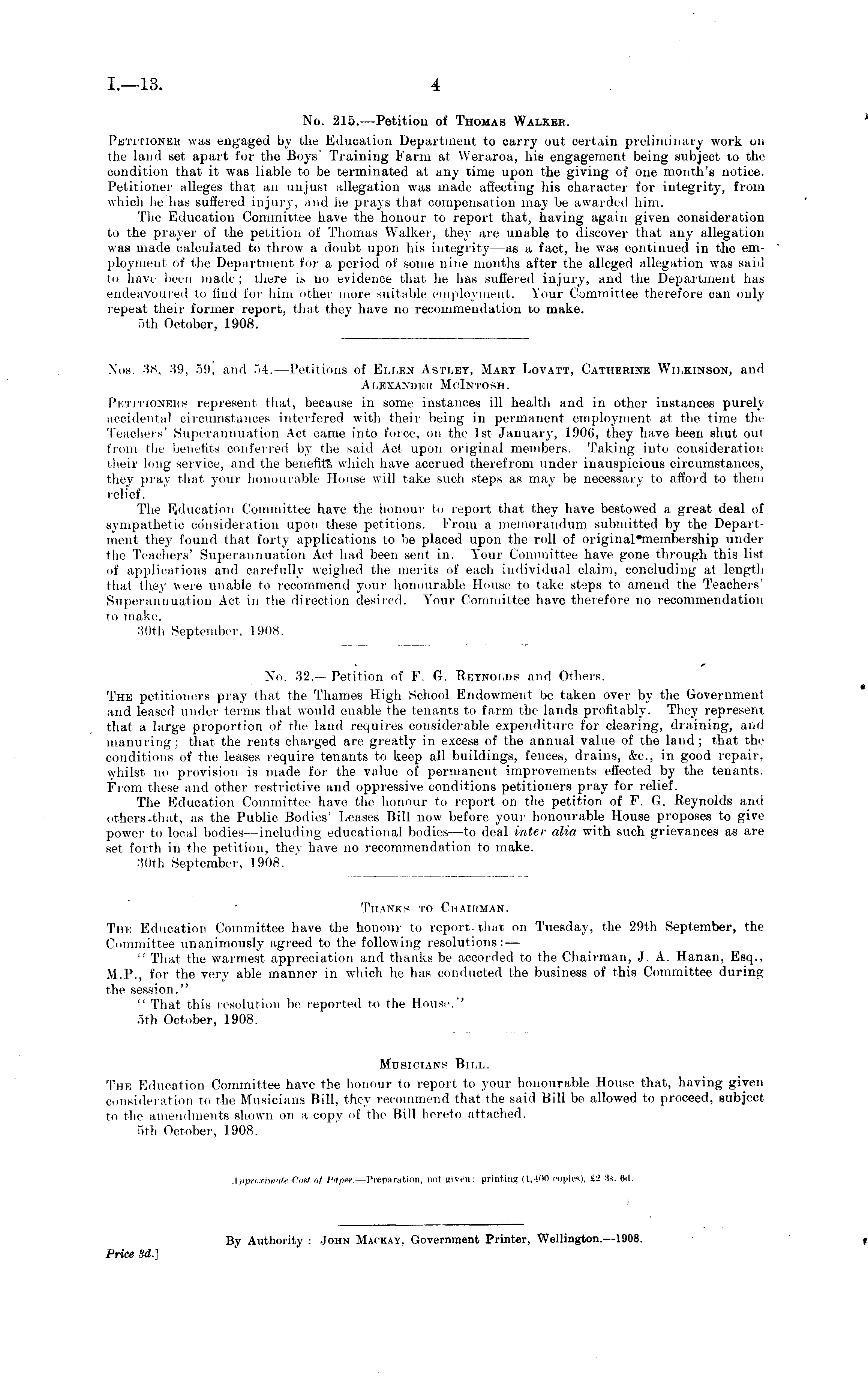 No. 215.—Petition of Thomas Walker. Petitioner was engaged by the Education Department to carry out certain preliminary work on the land set apart for the Boys' Training Farm at Weraroa, his engagement being subject to the condition that it was liable to be terminated at any time upon the giving of one month's notice. Petitioner alleges that an unjust allegation was made affecting his character for integrity, from which he hits suffered injury, and he prays that compensation may be awarded him. The Education Committee have the honour to report that, having again given consideration to the prayer of the petition of Thomas Walker, they are unable to discover that any allegation was made calculated to throw a doubt upon bis integrity—as a fact, he was continued in the employment of the Department for a period of some nine months after the alleged allegation was said to have been made; there is uo evidence that he has suffered injury, and the Department has endeavoured to find for him other more suitable employment. Your Committee therefore can only repeat their former report, that they have no recommendation to make. sth October, 1908. Xos. 38, -'19, 59, and 54. — Petitions of Ellen Astley, Mary Novatt, Catherine Wilkinson, and Alexander Mclntowh. Petitioners represent that, because in some instances ill health and in other instances purelyaccidental circumstances interfered with their being in permanent employment at the time the Teachers' Superannuation Act came into force, on the Ist January, 1906, they have been shut out from the benefits conferred by the said Act upon original members. Taking into consideration their long service, and the benefit?; which have accrued therefrom under inauspicious circumstances, they pray that your honourable House will take such steps as may be necessary to afford to them relief. The Education Committee have the honour to report that they have bestowed a great deal of sympathetic consideration upon these petitions. From a memorandum submitted by the Department they found that forty applications to be placed upon the roll of original "membership under the Teachers' Superannuation Act had been sent in. Your Committee have gone through this list of applications and carefully weighed the merits of each individual claim, concluding at length that they were unable to recommend your honourable House to take steps to amend the Teachers' Superannuation Act in the direction desired. Your Committee have therefore no recommendation to make. 30th September, 1908. No. 32.— Petition of F. G. Reynolds and Others. The petitioners pray that the Thames High School Endowment be taken over by the Government and leased under terms that would enable the tenants to farm the lands profitably. They represent that a large proportion of the land requires considerable expenditure for clearing, draining, ami manuring; that the rents charged are greatly in excess of the annual value of the land ; that the conditions of the leases require tenants to keep all buildings, fences, drains, &c, in good repair, whilst no provision is made for the value of permanent improvements effected by the tenants. From these and other restrictive and oppressive conditions petitioners pray for relief. The Education Committee have the honour to report on the petition of F. G. Reynolds and others.that, as the Public Bodies' Leases Bill now before your honourable House proposes to give power to local bodies—including educational bodies —to deal inter alia with such grievances as are set forth in the petition, they have no recommendation to make. 30th September, 1908. Thanks to Chairman. The Education Committee have the honour to report-that on Tuesday, the 29th September, the Committee unanimously agreed to the following resolutions: — ■' That the warmest appreciation and thanks be accorded to the Chairman, J. A. Hanan, Esq., M.P., for the very able manner in which he has conducted the business of this Committee during the session." " That this resolution be reported to the House.'' sth October, 1908. Musicians Bill. The Education Committee have the honour to report to your honourable House that, having given consideration to the Musicians Bill, they recommend that the said Bill be allowed to proceed, subject to the amendments shown on a copy of the Bill hereto attached. sth October, 1908.