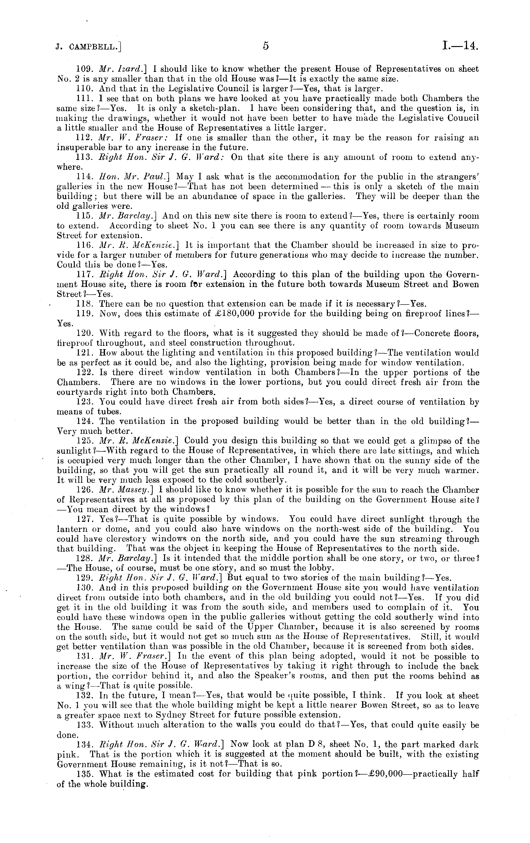 109. Mr. hard.] I should like to know whether the present House of Representatives on sheet No. 2 is any smaller than that in the old House was?—lt is exactly the same size. 110. And that in the Legislative Council is larger?— Yes, that is larger. 111. I see that on both plans we have looked at you have practically made both Chambers the same size? —Yes. it is only a sketch-plan. I have been considering that, and the question is, in making the drawings, whether it would not have been better to have made the Legislative Council a little smaller and the House of representatives a little larger. 112. Mr. W. Fraser: If one is smaller than the other, it may be the reason for raising an insuperable bar to any increase in the future. 113. Bight Hon. Sir J. G. Ward: On that site there is any amount of room to extend anywhere. 114. Hon. Mr. Paul.] May I ask what is the accommodation for the public in the strangers' galleries in the new House?— That has not been determined — this is only a sketch of the main building; but there will be an abundance of space in the galleries. They will be deeper than the old galleries were. 115. Mr. Barclay.] And on this new site there is room to extend? —Yes, there is certainly room to extend. According to sheet No. 1 you can see there is any quantity of room towards Museum Street for extension. 116. Mr. E. McKenzie.] It is important that the Chamber should be increased in size to provide for a larger number of members for future generations who may decide to increase the number. Could this be done?— Yes. 117. Eight Hun. Sir J. G. Hard.] According to this plan of the building upon the Government House site, there is room for extension in the future both towards Museum Street and Bowen Street ?-—Yes. 118. There can be no question that extension can be made if it is necessary?— Yes. 119. Now, does this estimate of £180,000 provide for the building being on fireproof lines?— Yes. 120. With regard to the floors, what is it suggested they should be made of? —Concrete floors, fireproof throughout, and steel construction throughout. 121. How about the lighting and \entilation in this proposed building?— The ventilation would be as perfect as it could be, and also the lighting, provision being made for window ventilation. 122. Is there direct window ventilation in both Chambers?—ln the upper portions of the Chambers. There are no windows in the lower portions, but you could direct fresh air from the courtyards right into both Chambers. 123. You could have direct fresh air from both sides? —Yes, a direct course of ventilation by means of tubes. 124. The ventilation in the proposed building would be better than in the old building? — Very much better. 125. Mr. E. McKenzie.] Could you design this building so that we could get a glimpse of the sunlight?— With regard to the House of Representatives, in which there are late sittings, and which is occupied very much longer than the other Chamber, I have shown that on the sunny side of the building, so that you will get the sun practically all round it, and it will be very much warmer. It will be very much less exposed to the cold southerly. 126. Mr. Massey.] I should like to know whether it is possible for the sun to reach the Chamber of Representatives at all as proposed by this plan of the building on the Government House site t —You mean direct by the windows? 127. Yes?— That is quite possible by windows. You could have direct sunlight through the lantern or dome, and you could also have windows on the north-west side of the building. You could have clerestory windows on the north side, and you could have the sun streaming through that building. That was the object in keeping the House of Representatives to the north side. 128. Mr. Barclay.] Is it intended that the middle portion shall be one story, or two, or three? —The House, of course, must be one story, and so must the lobby. 12!). Eight Han. Sir J . G. Ward.] But equal to two stories of the main building?— Yes. 130. And in this proposed building on the Government House site you would have ventilation direct from outside into both chambers, and in the old building you could not?— Yes. If you did get it in the old building it was from the south side, and members used to complain of it. You could have these windows open in the public galleries without getting the cold southerly wind into the House. The same could he said of the Upper Chamber, because it is also screened by rooms on the south side, but it would not get so much sun as the House of Representatives. Still, it would get better ventilation than was possible in the old Chamber, because it is screened from both sides. 131. Mr. W. Fraser.] In the event of this plan being adopted, would it not be possible to increase the size of the House of Representatives by taking it right through to include the back portion, the corridor behind it, and also the Speaker's rooms, and then put the rooms behind as a wing?— That is quite possible. 132. In the future, I mean? —Yes, that would be quite possible, I think. If you look at sheet No. 1 you will see that the whole building might be kept a little nearer Bowen Street, so as to leave a greater space next to Sydney Street for future possible extension. 133. Without much alteration to the walls you could do that?— Yes, that could quite easily be done. 134. Eight Hon. Sir J. G. Ward.] Now look at plan D 8, sheet No. 1, the part marked dark pink. That is the portion which it is suggested at the moment should be built, with the existing Government House remaining, is it not? —That is so. 135. What is the estimated cost for building that pink portion? —£90,000 —practically half of trie whole building.