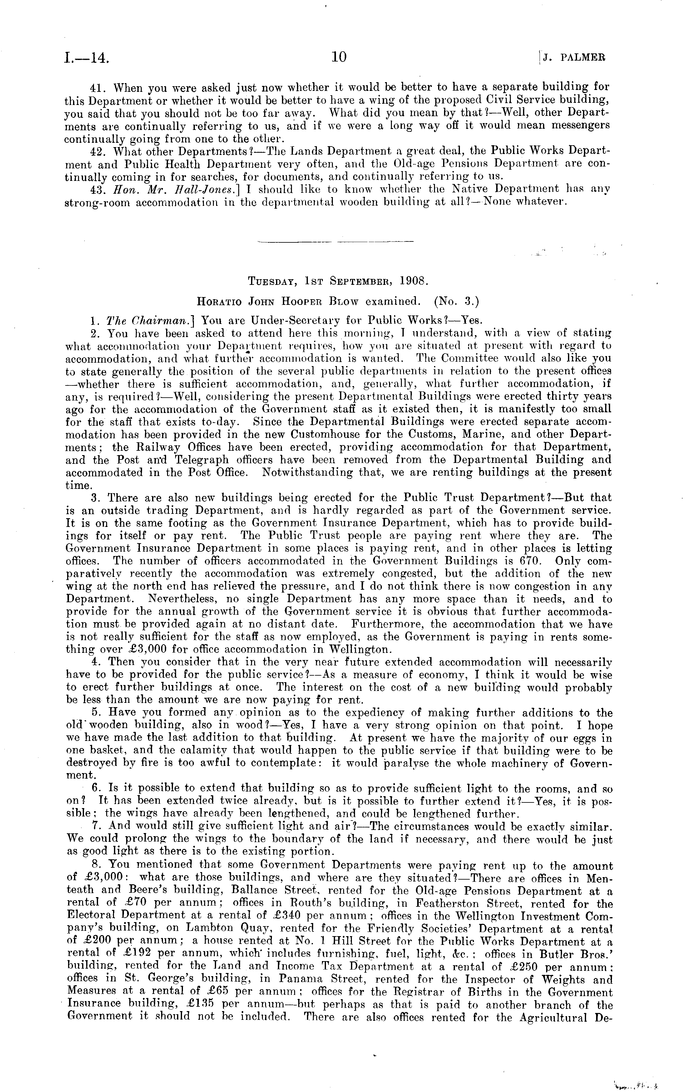 41. When you were asked just now whether it would be better to have a separate building for this Department or whether it would be better to have a wing of the proposed Civil Service building, you said that you should not be too far away. What did you mean by that I—Well,1 —Well, other Departments are continually referring to us, and if we were a long way off it would mean messengers continually going from one to the other. 42. What other Departments?— The Lands Department a great deal, the Public Works Department and Public Health Department very often, and the Old age Pensions Department are continually coming in for searches, for documents, and continually referring to us. 43. Hon. Mr. Hall-Jones.] I should like to know whether the Native Department has any strong-room accommodation in the departmental wooden building at all? None whatever. Tuesday, Ist September, 1908. Horatio John Hooper Blow examined. (No. 3.) 1. The Chairman.] You are Under-Secretary for Public Works?— Yes. 2. You have been asked to attend here this .morning, 1 understand, with a view of stating what accommodation your Department requires, how you are situated at present with regard to accommodation, and what further accommodation is wanted. The Committee would also like you to state generally the position of the several public departments in relation to the present offices —whether there is sufficient accommodation, and, generally, what further accommodation, if any, is required? —Well, considering the present Departmental Buildings were erected thirty years ago for the accommodation of the Government staff as it existed then, it is manifestly too small for the staff that exists to-day. Since the Departmental Buildings were elected separate accommodation has been provided in the new Customhouse for the Customs, Marine, and other Departments ; the Railway Offices have been erected, providing accommodation for that Department, and the Post and Telegraph officers have been removed from the Departmental Building and accommodated in the Post Office. Notwithstanding that, we are renting buildings at the present time. 3. There are also new buildings being erected for the Public Trust Department?— But that is an outside trading Department, and is hardly regarded as part of the Government service. It is on the same footing as the Government Insurance Department, which has to provide buildings for itself or pay rent. The Public Trust people are paying rent where they are. The Government Insurance Department in some places is paying rent, and in other places is letting offices. The number of officers accommodated in the Government Buildings is 670. Only comparatively recently the accommodation was extremely congested, but the addition of the new wing at the north end has relieved the pressure, and I do not think there is now congestion in any Department. Nevertheless, no single Department has any more space than it needs, and to provide for the annual growth of the Government service it is obvious that further accommodation must be provided again at no distant date. Furthermore, the accommodation that we have is not really sufficient for the staff as now employed, as the Government is paying in rents something over £3,000 for office accommodation in Wellington. 4. Then you consider that in the very near future extended accommodation will necessarily have to be provided for the public service?—As a measure of economy, I think it would be wise to erect further buildings at once. The interest on the cost of a new building would probably be less than the amount we are now paying for rent. 5. Have you formed any opinion as to the expediency of making further additions to the old'wooden building, also in wood?— Yes, I have a very strong opinion on that point. I hope we have made the last addition to that building. At present we have the majority of our eggs in one basket, and the calamity that woidd happen to the public service if that building were to be destroyed by fire is too awful to contemplate: it would paralyse the whole machinery of Government. 6. Is it possible to extend that building so as to provide sufficient light to the rooms, and so on? It has been extended twice already, but is it possible to further extend it?— Yes, it is possible; the wings have already been lengthened, and could be lengthened further. 7. And would still give sufficient liirht and air? —The circumstances would be exactly similar. We could prolong the wings to the boundary of the land if necessary, and there would be just as good light as there is to the existing portion. 8. You mentioned that some Government Departments were paying rent up to the amount of £3,000: what are those buildings, and where are they situated ?— There are offices in Menteath and Beere's building, Ballance Street, rented for the Old-age Pensions Department at a rental of £70 per annum; offices in Routh's building, in Featherston Street, rented for the Electoral Department at a rental of £340 per annum : offices in the Wellington Investment Company's building, on Lambton Quay, rented for the Friendly Societies' Department at a rental of £200 per annum; a house rented at No. 1 Hill Street for the Public Works Department at a rental of £192 per annum, which' includes furnishing, fuel, light, &c. : offices in Butler Bros.' buildinp, rented for the Land and Income Tax Department at a rental of £250 per annum: offices in St. George's building, in Panama Street, rented for the Inspector of Weights and Measures at a rental of £65 per annum ; offices for the Registrar of Births in the Government Insurance building, £135 per annum—but perhaps as that is paid to another branch of the Government it should not be included. There are also offices rented for the Agricultural De-
